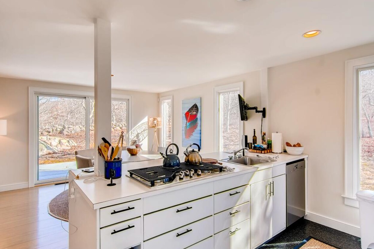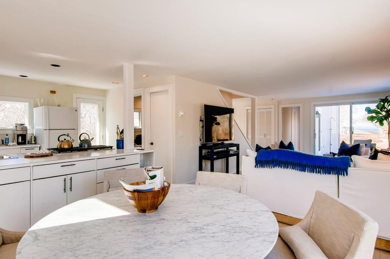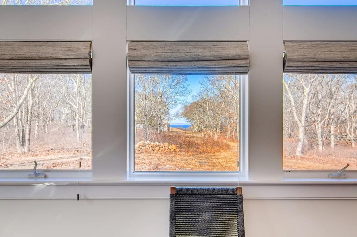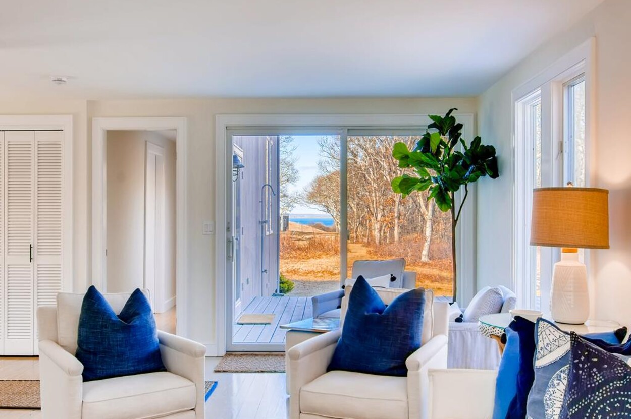 Spring Point Chilmark - Fabulous contemporary beach house. Renovated for 2019 with 4 bedrooms - 2 primary suites with private baths and glass enclosed showers and two more bedrooms share a bath. Open concept living/kitchen/dining and lovely large deck with outdoor furniture, grill and outdoor shower and peek at the water . Just a few minutes walk to a private association north shore beach. Stand on the shore and watch the sun set over the Elizabeth Islands. Plus Lucy Vincent and Squibncocket beach access. Association tennis court. Dog friendly (with prior agreement), AC. There is a distant narrow water view from the deck and primary bedroom..... it s small but you can see the sea!