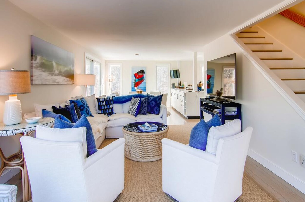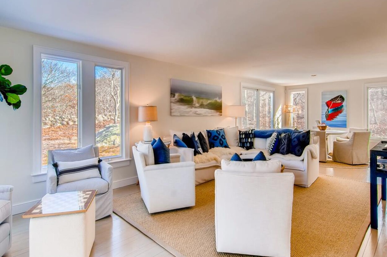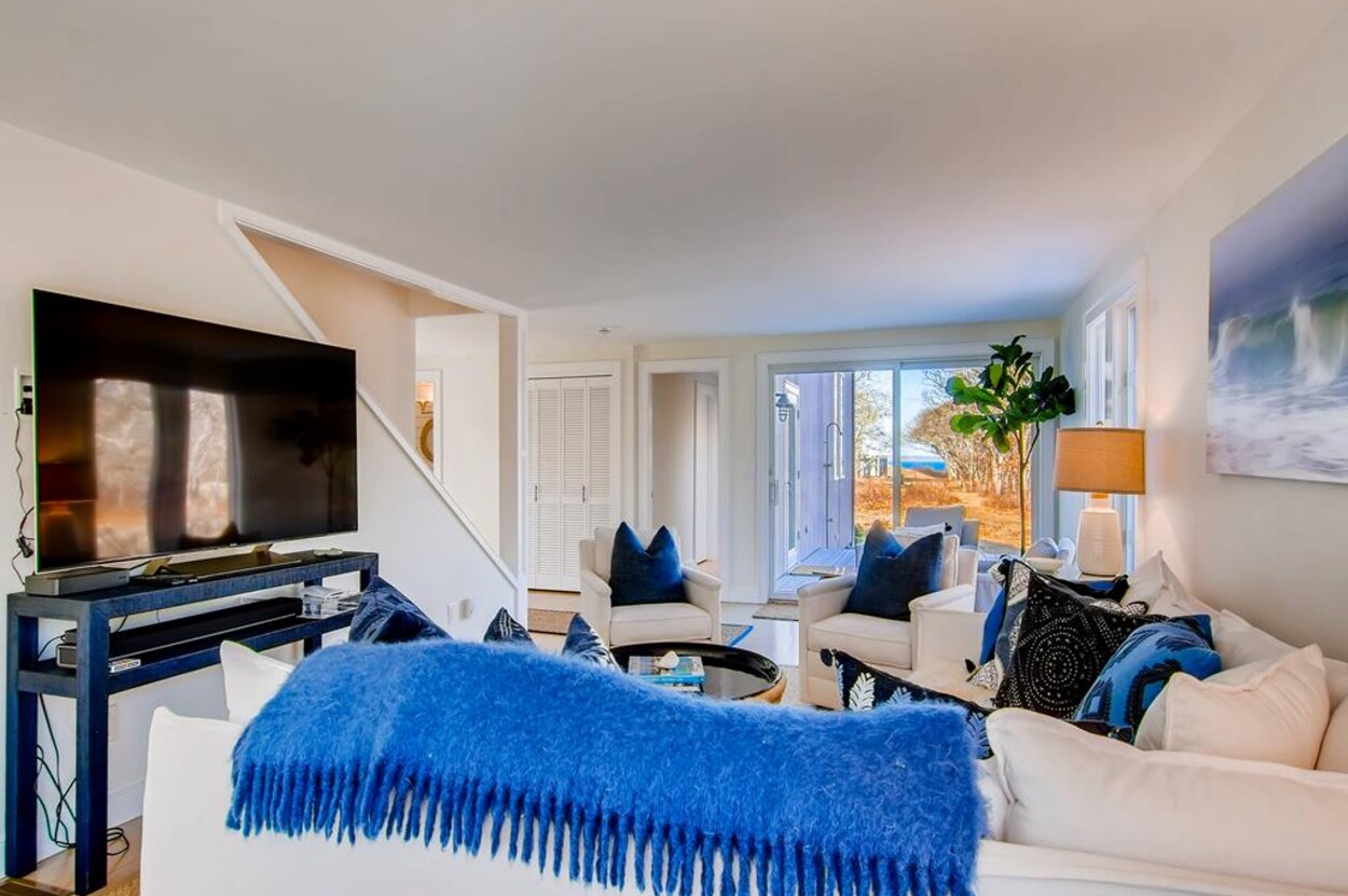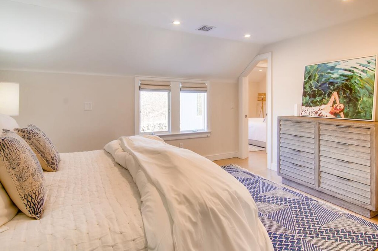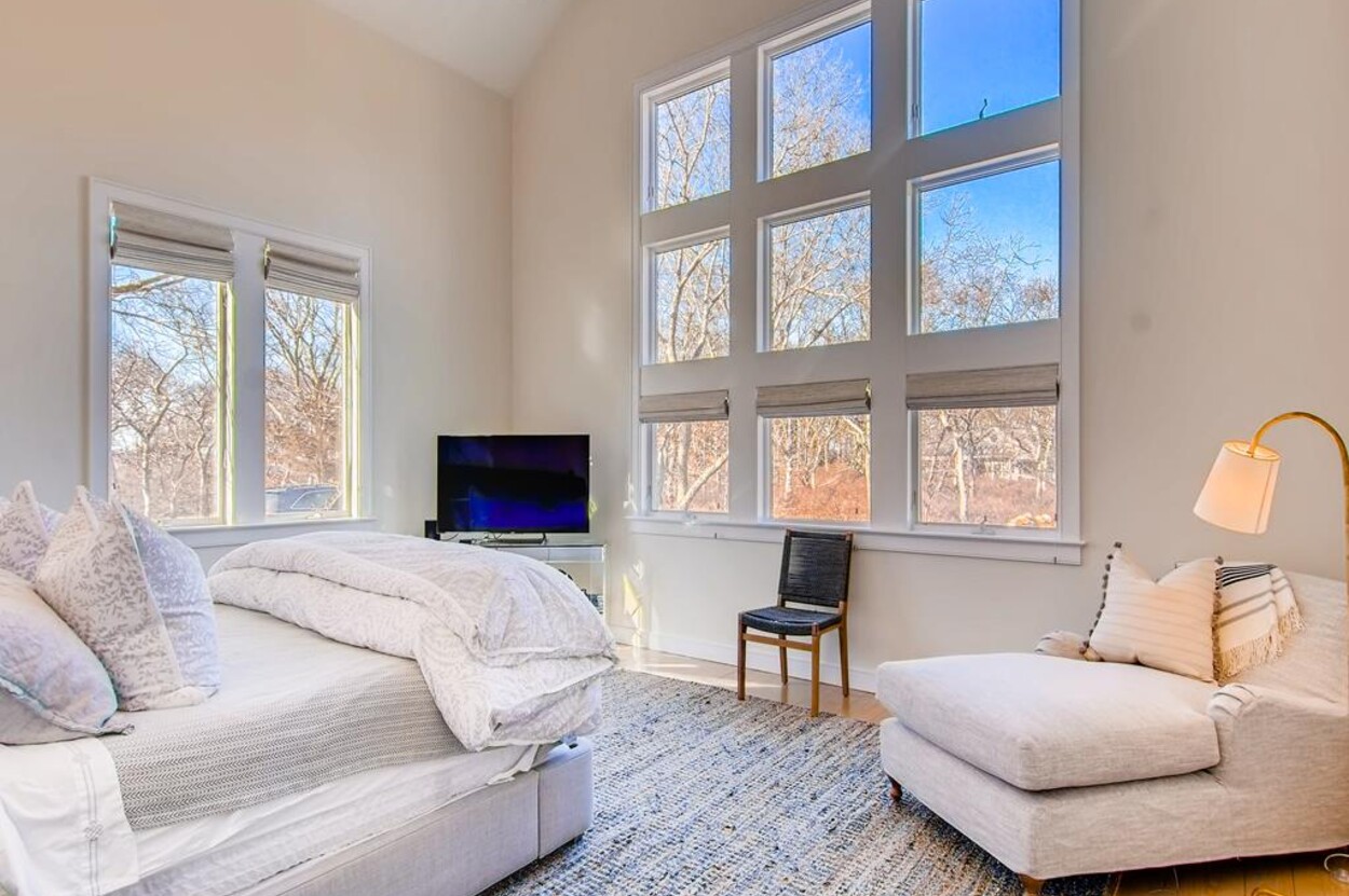 Spring Point Chilmark - Fabulous contemporary beach house. Renovated for 2019 with 4 bedrooms - 2 primary suites with private baths and glass enclosed showers and two more bedrooms share a bath. Open concept living/kitchen/dining and lovely large deck with outdoor furniture, grill and outdoor shower and peek at the water . Just a few minutes walk to a private association north shore beach. Stand on the shore and watch the sun set over the Elizabeth Islands. Plus Lucy Vincent and Squibncocket beach access. Association tennis court. Dog friendly (with prior agreement), AC. There is a distant narrow water view from the deck and primary bedroom..... it s small but you can see the sea!
