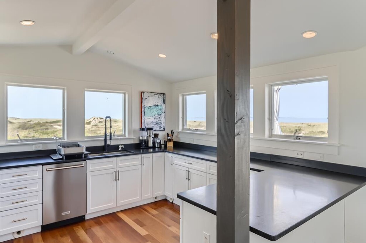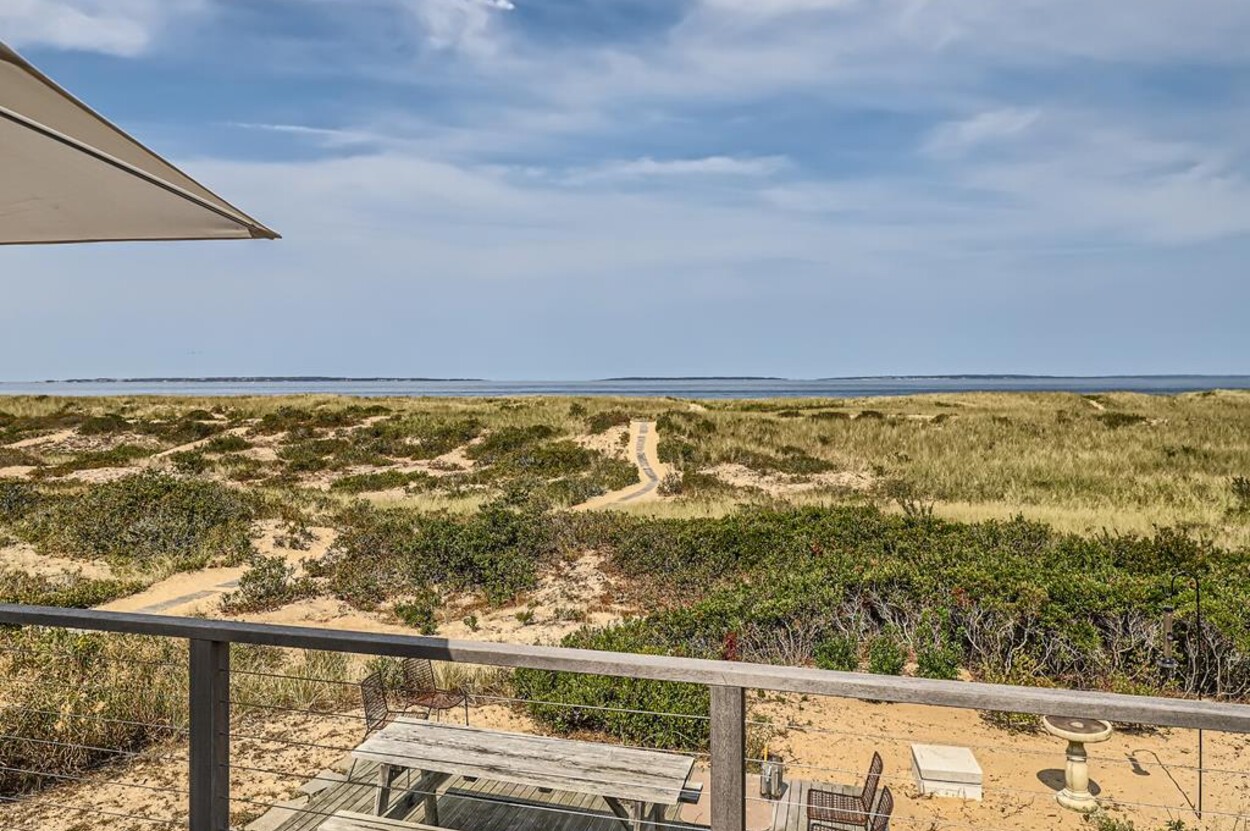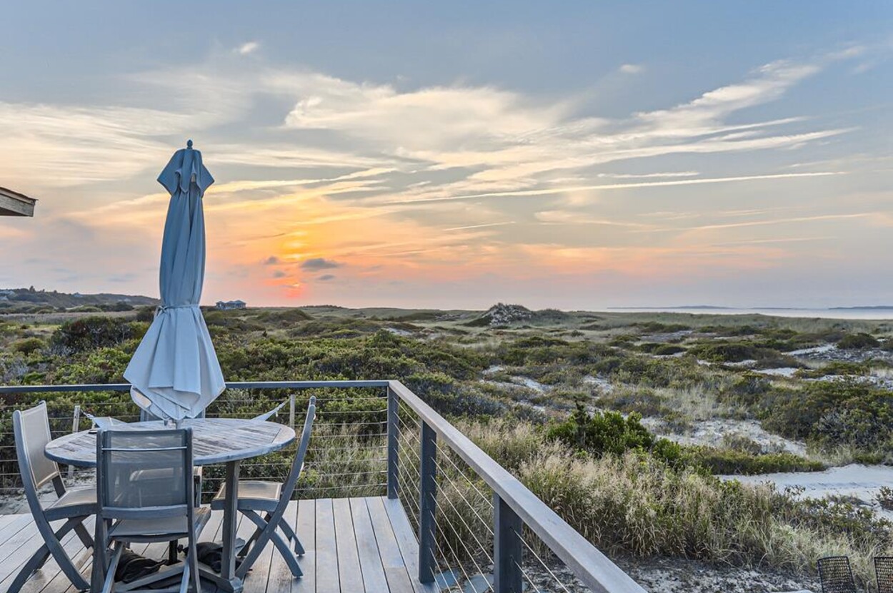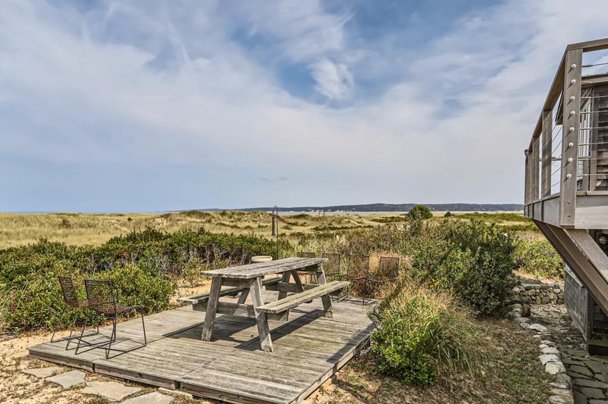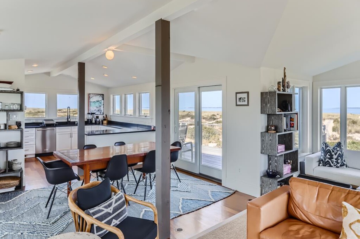 Privately situated waterfront beach house on Dogfish Bar in Aquinnah. This contemporary style beach house is set on rolling sand dunes and has panoramic views of the Aquinnah Lighthouse, Vineyard Sound, and the Elizabeth Islands. Private beach just steps in front of house. Gourmet kitchen, cherry floors, beautiful finishes and recently renovated bathrooms. Nice deck off the dining/kitchen area. Gorgeous sunsets! This is a magical spot on the Island.