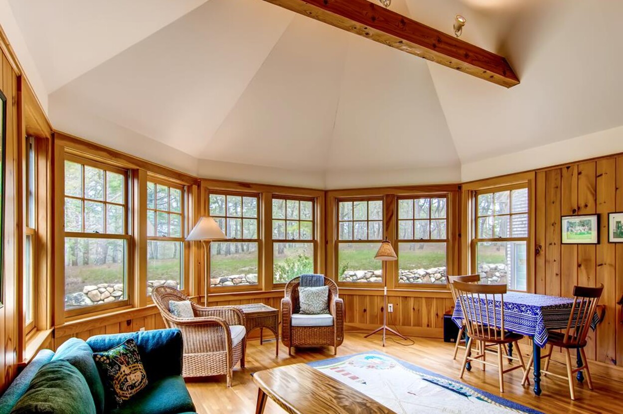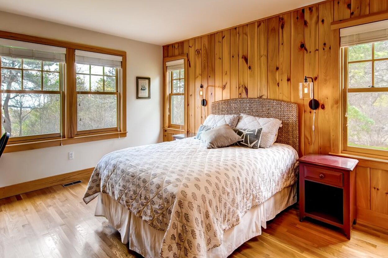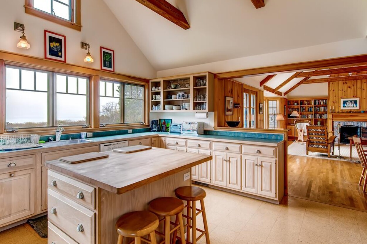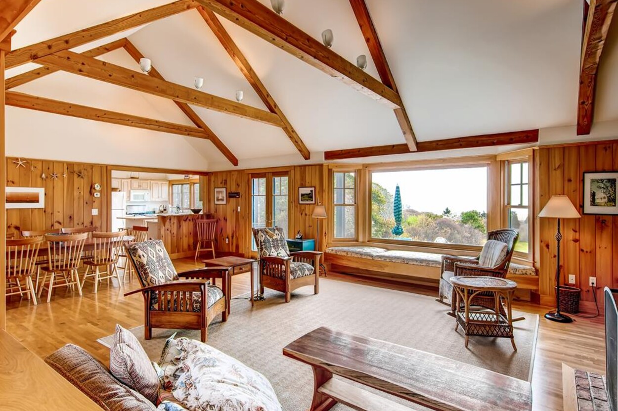 Central air conditioned waterfront home on Chilmark Pond and Abel's Hill Beach with exquisite 160 degree south shore views of the island and the Atlantic. Rights to Abel's Hill Beach and 3 private association tennis rights. Walk the private road, exclusive to the home, directly to the pond and beach. Lovely one story four bedroom home in a country style with warm wood paneling and separate apartment over garage. Large kitchen, open living room, dining room, high-speed 1000 MBPS wifi, separate den with Smart TV, music, and electric piano.
