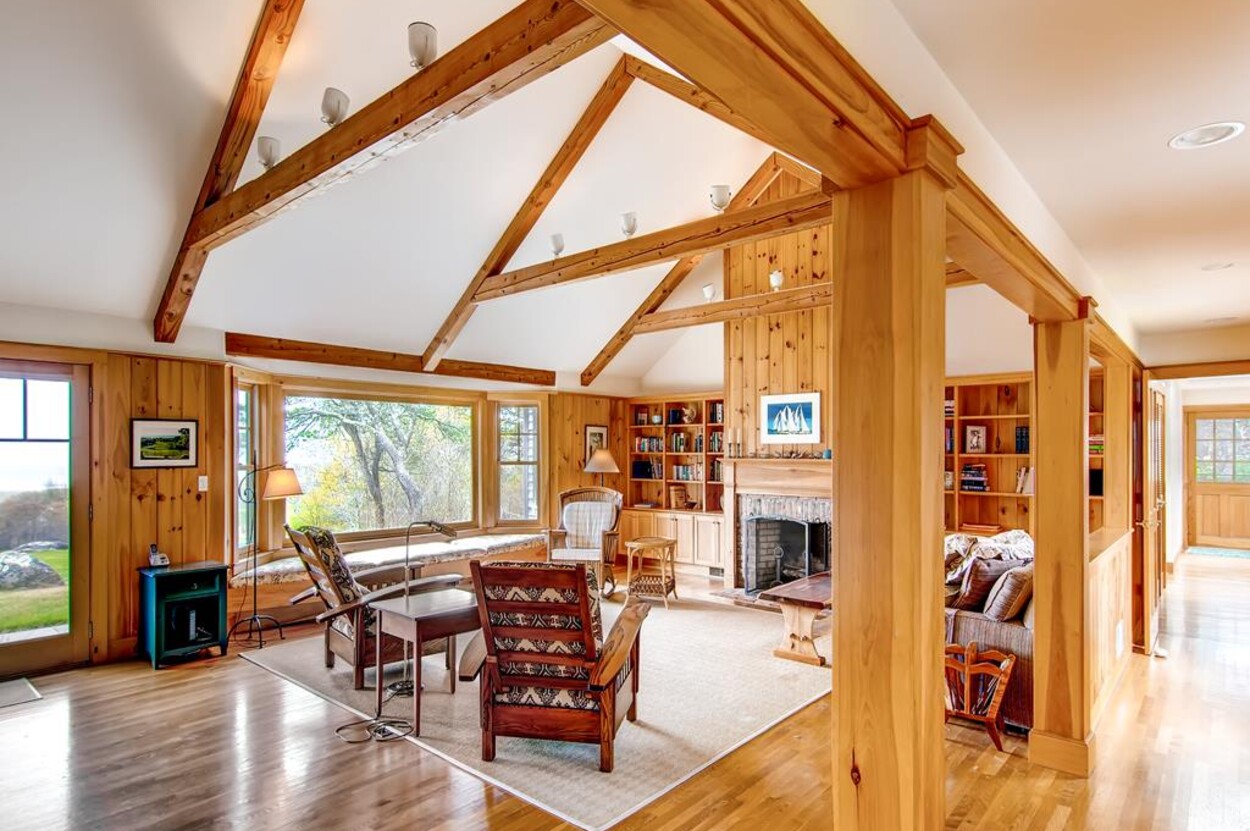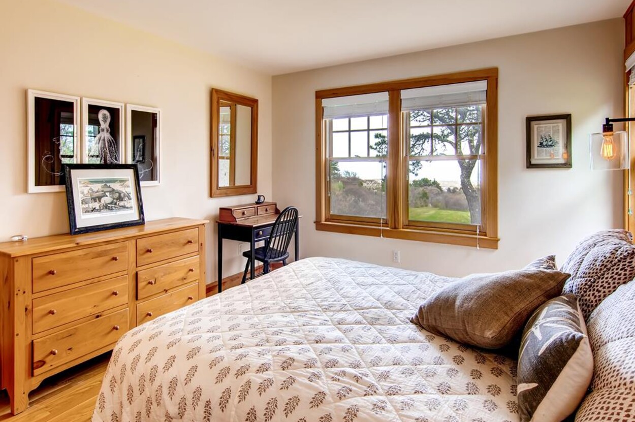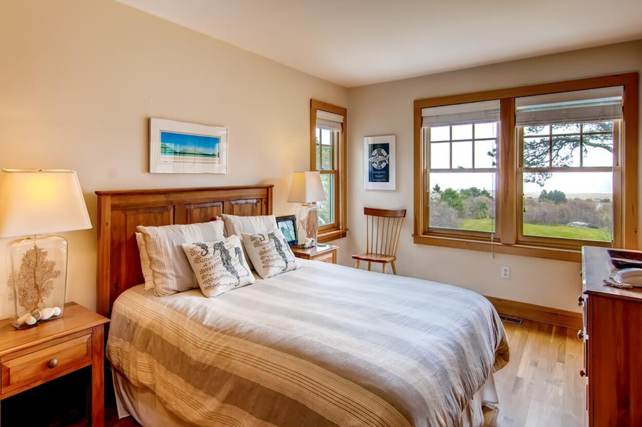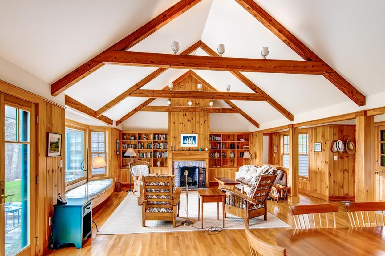 Central air conditioned waterfront home on Chilmark Pond and Abel's Hill Beach with exquisite 160 degree south shore views of the island and the Atlantic. Rights to Abel's Hill Beach and 3 private association tennis rights. Walk the private road, exclusive to the home, directly to the pond and beach. Lovely one story four bedroom home in a country style with warm wood paneling and separate apartment over garage. Large kitchen, open living room, dining room, high-speed 1000 MBPS wifi, separate den with Smart TV, music, and electric piano.