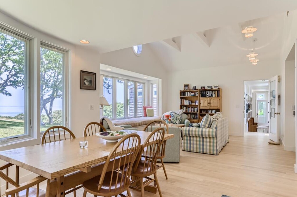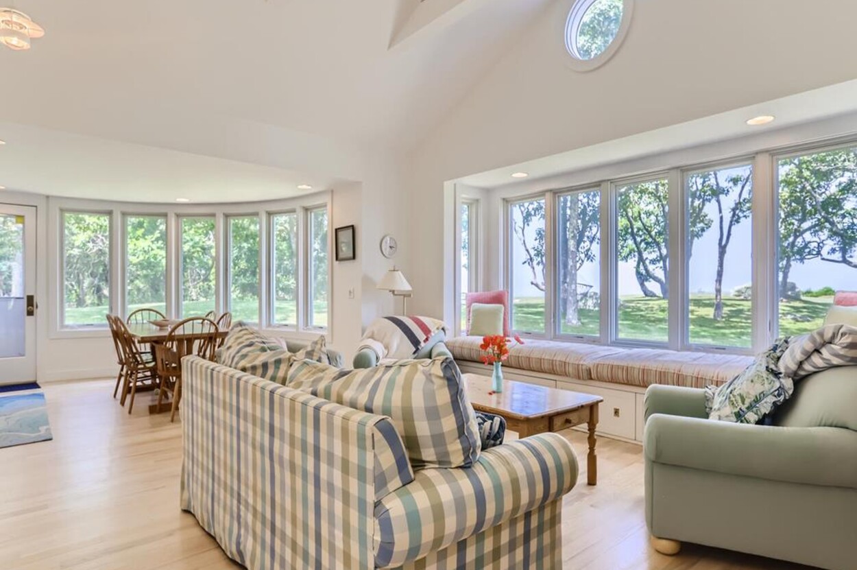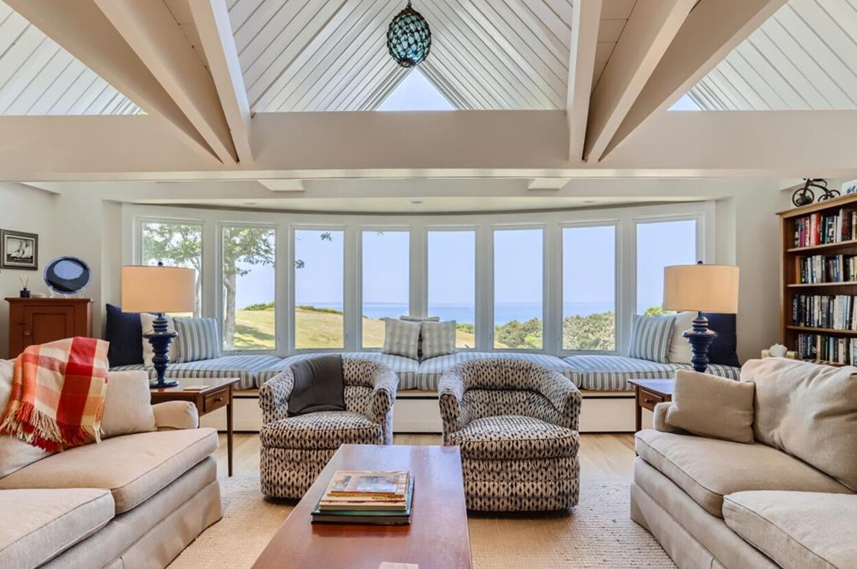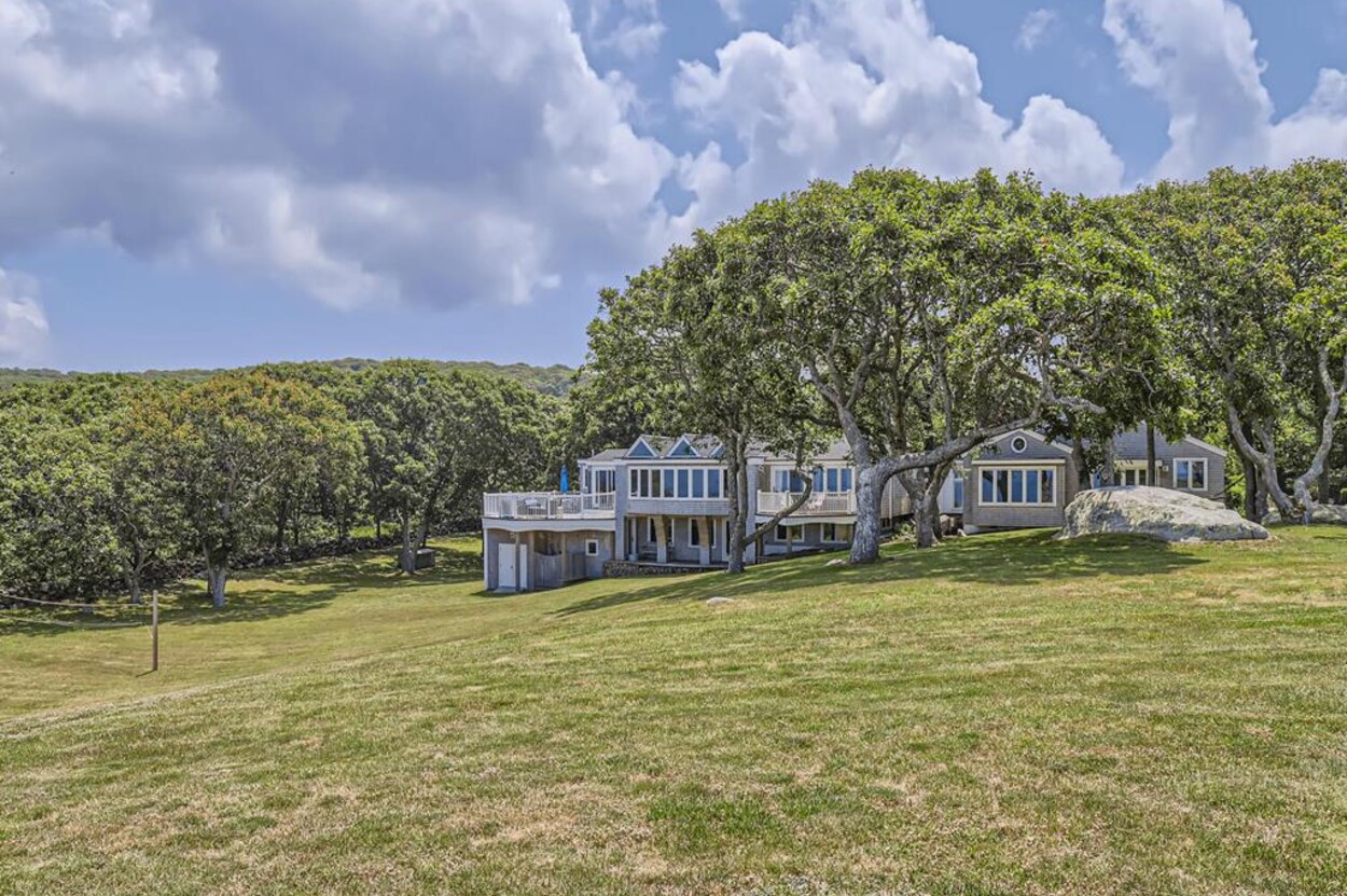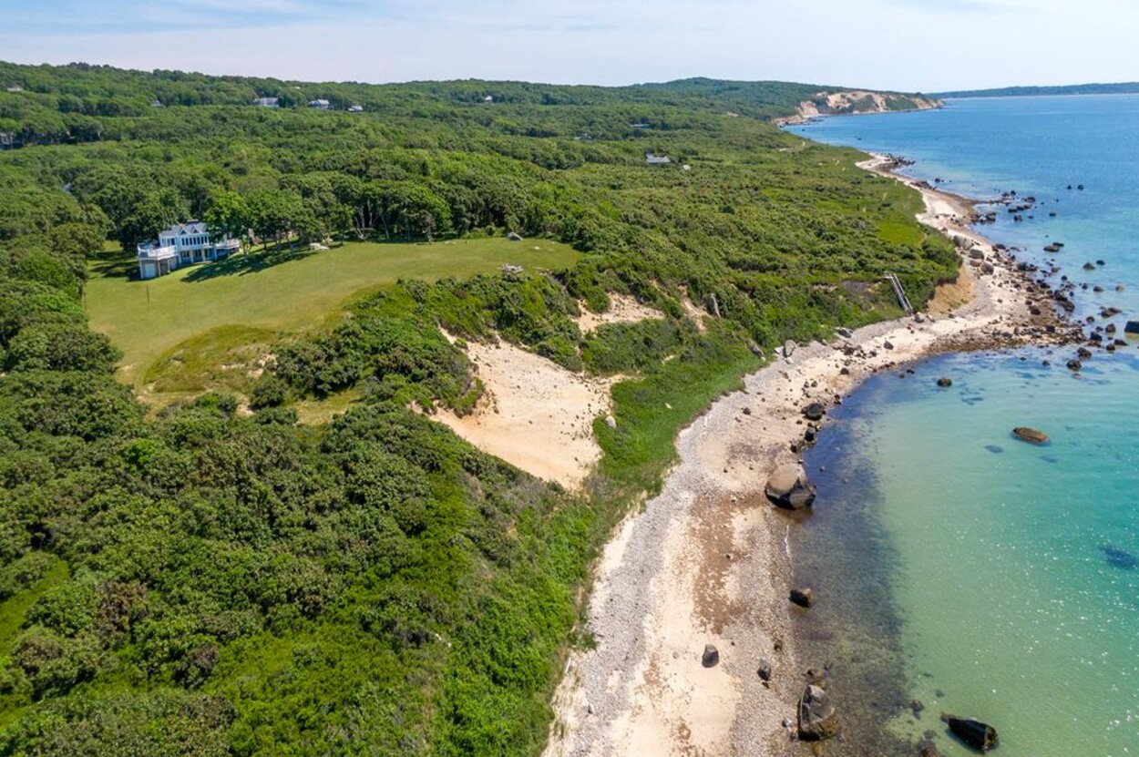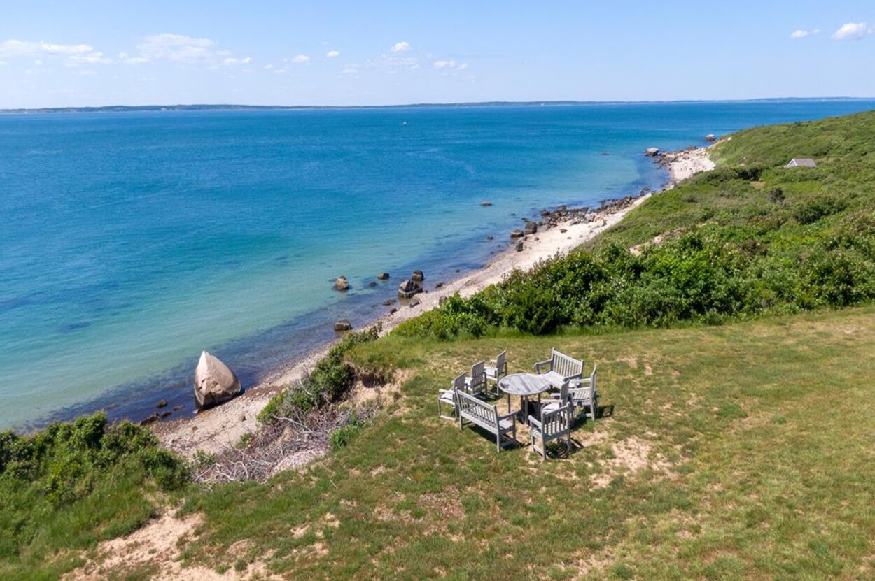 Stunning Chilmark north shore 4 acre waterfront paradise with wonderful sunsets and unique privacy nestled between a large wooded hill and a 200 acre private estate. The 6 bedroom 4 1/2 bath kitchen main house, (including primary suite and separate guest wing with additional living room and kitchenette), plus 2 bedroom, 2 bath guest house enjoy dramatic views of the Elizabeth Islands from the Gay Head Lighthouse to Woods Hole from every room. The property is beautifully landscaped with an enchanting contour stretching to the bluff overlooking a dreamy private cove and sandy beach. Four cleared acres are very rare on the heavily wooded north shore. Waterfront values on the rugged, elevated and protected Vineyard north shore are attracting more interest after Hurricane Sandy damaged the low elevation fragile south shore NY, NJ and New England coast line. The property is in the highly desirable 335 acre Spring Point community with 38 home sites with 135 acres of common land, 3/4 mile of private beach, 2 tennis courts and endless dirt roads and trails.