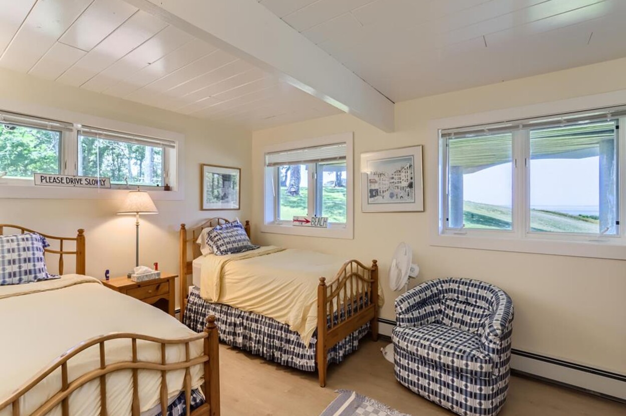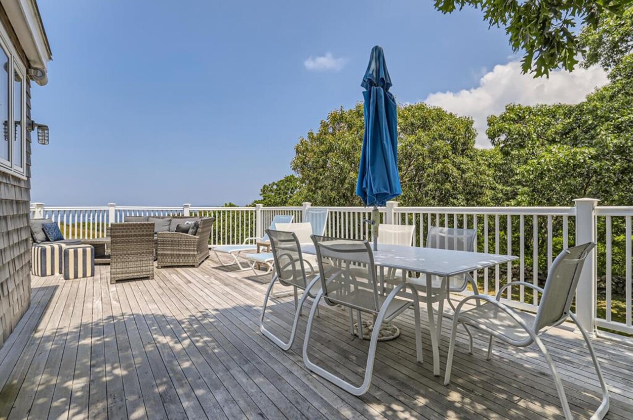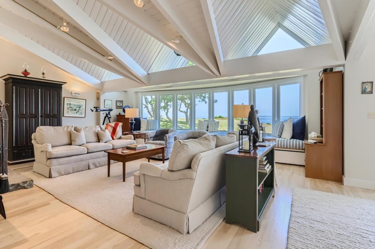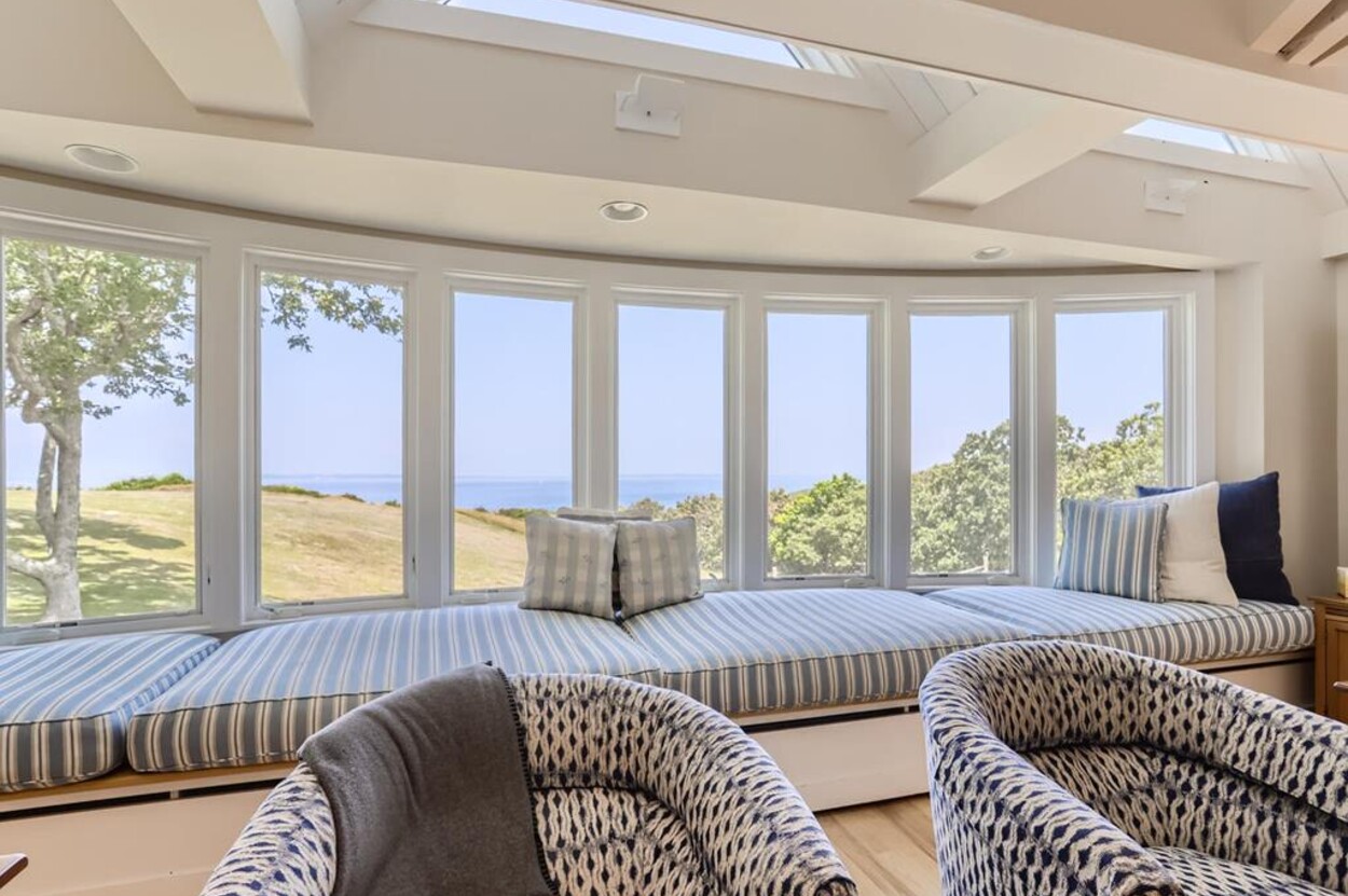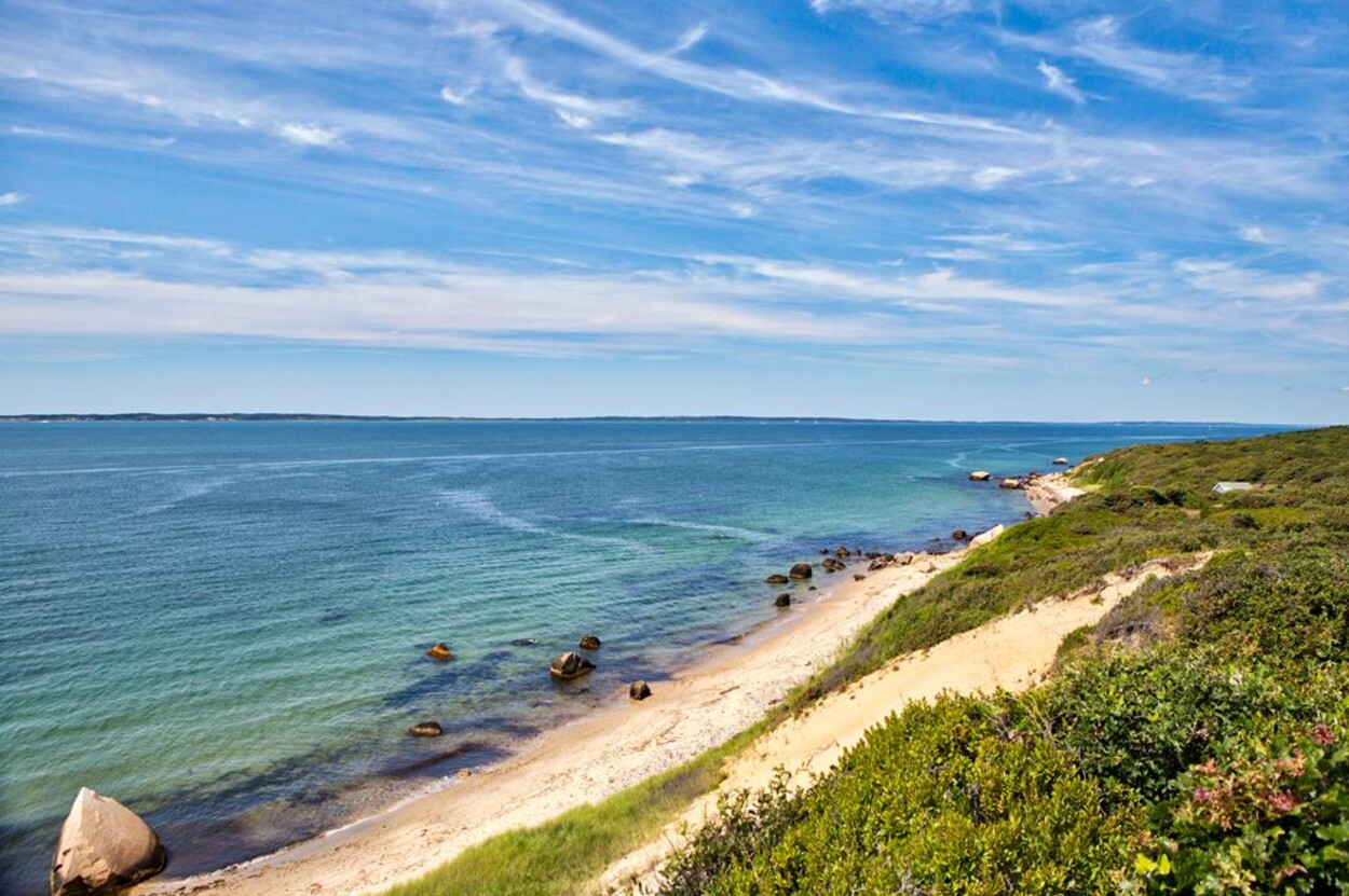 Stunning Chilmark north shore 4 acre waterfront paradise with wonderful sunsets and unique privacy nestled between a large wooded hill and a 200 acre private estate. The 6 bedroom 4 1/2 bath kitchen main house, (including primary suite and separate guest wing with additional living room and kitchenette), plus 2 bedroom, 2 bath guest house enjoy dramatic views of the Elizabeth Islands from the Gay Head Lighthouse to Woods Hole from every room. The property is beautifully landscaped with an enchanting contour stretching to the bluff overlooking a dreamy private cove and sandy beach. Four cleared acres are very rare on the heavily wooded north shore. Waterfront values on the rugged, elevated and protected Vineyard north shore are attracting more interest after Hurricane Sandy damaged the low elevation fragile south shore NY, NJ and New England coast line. The property is in the highly desirable 335 acre Spring Point community with 38 home sites with 135 acres of common land, 3/4 mile of private beach, 2 tennis courts and endless dirt roads and trails.