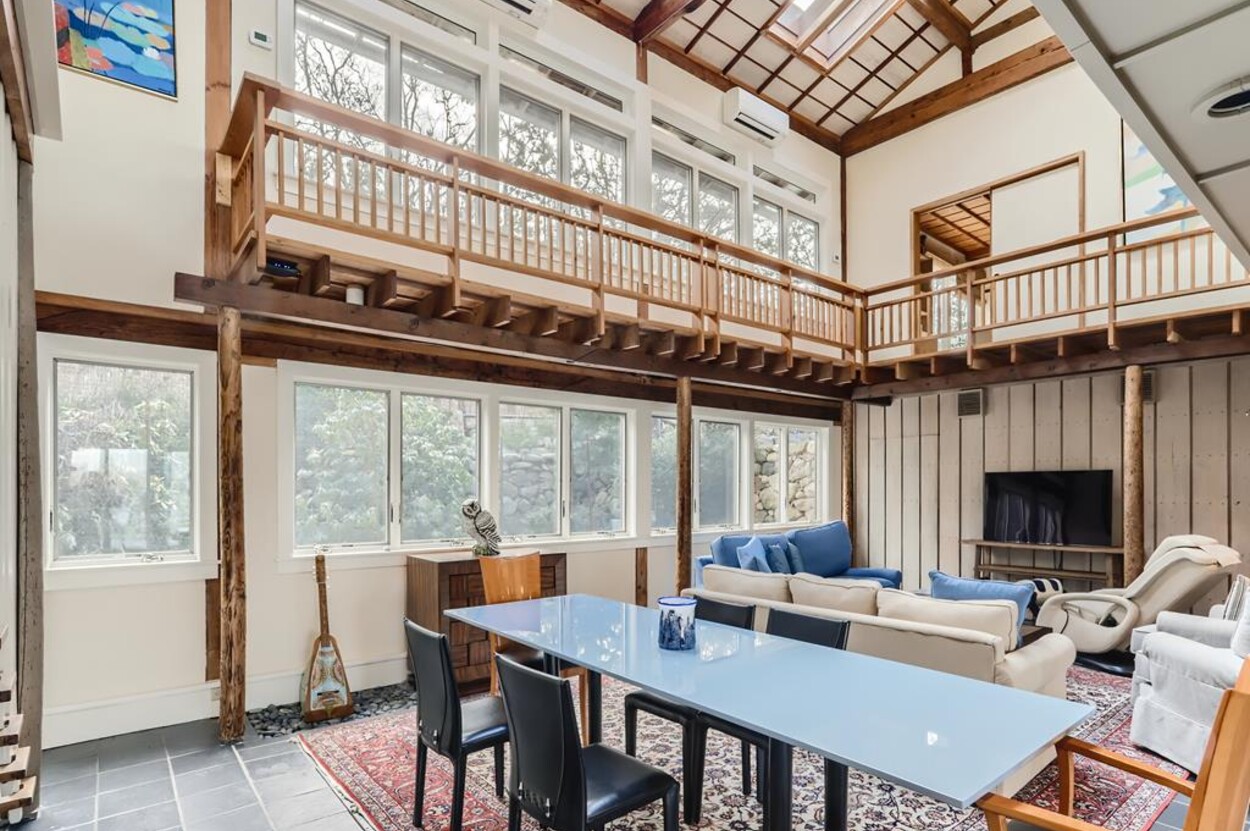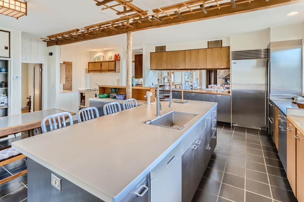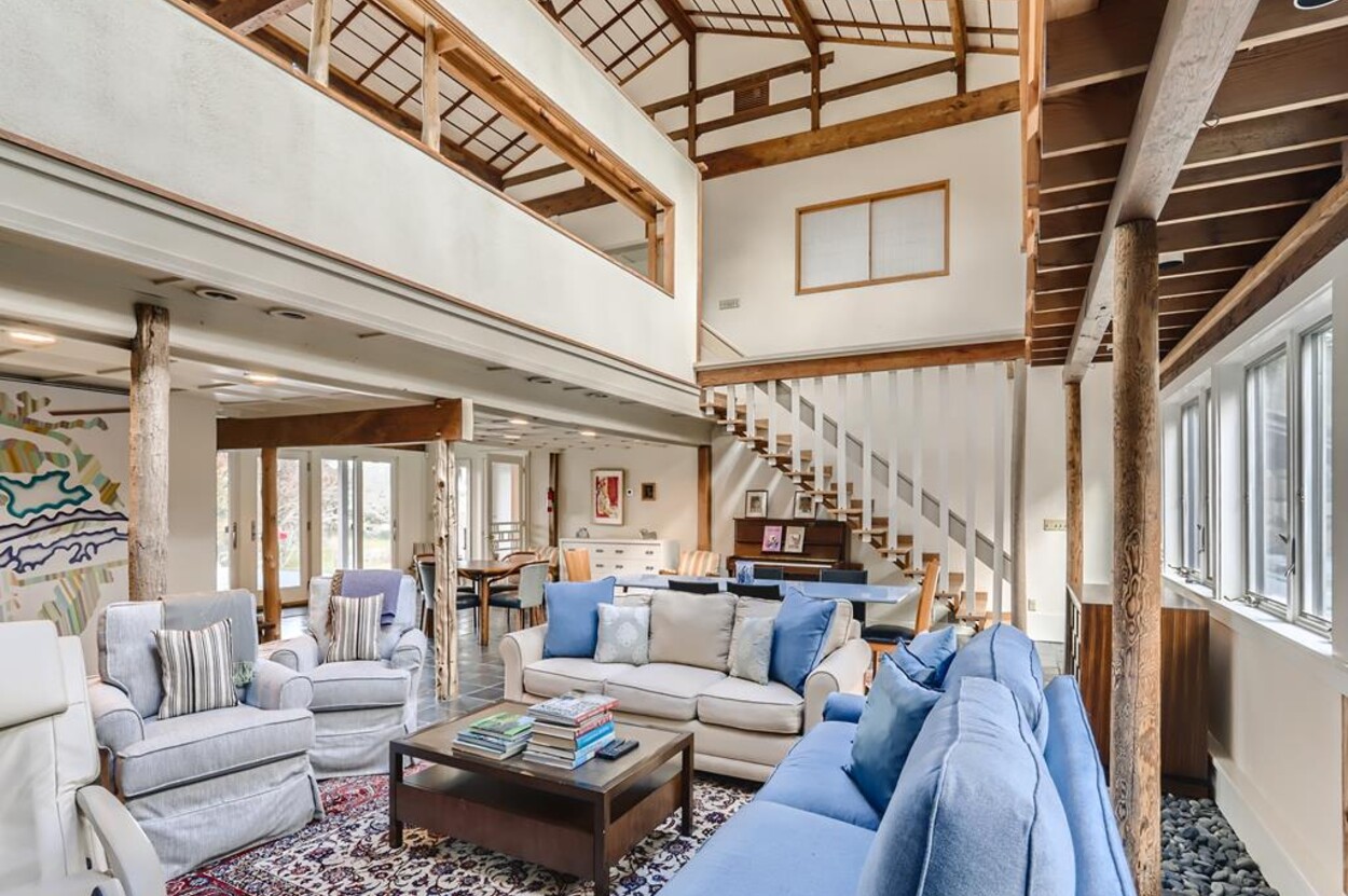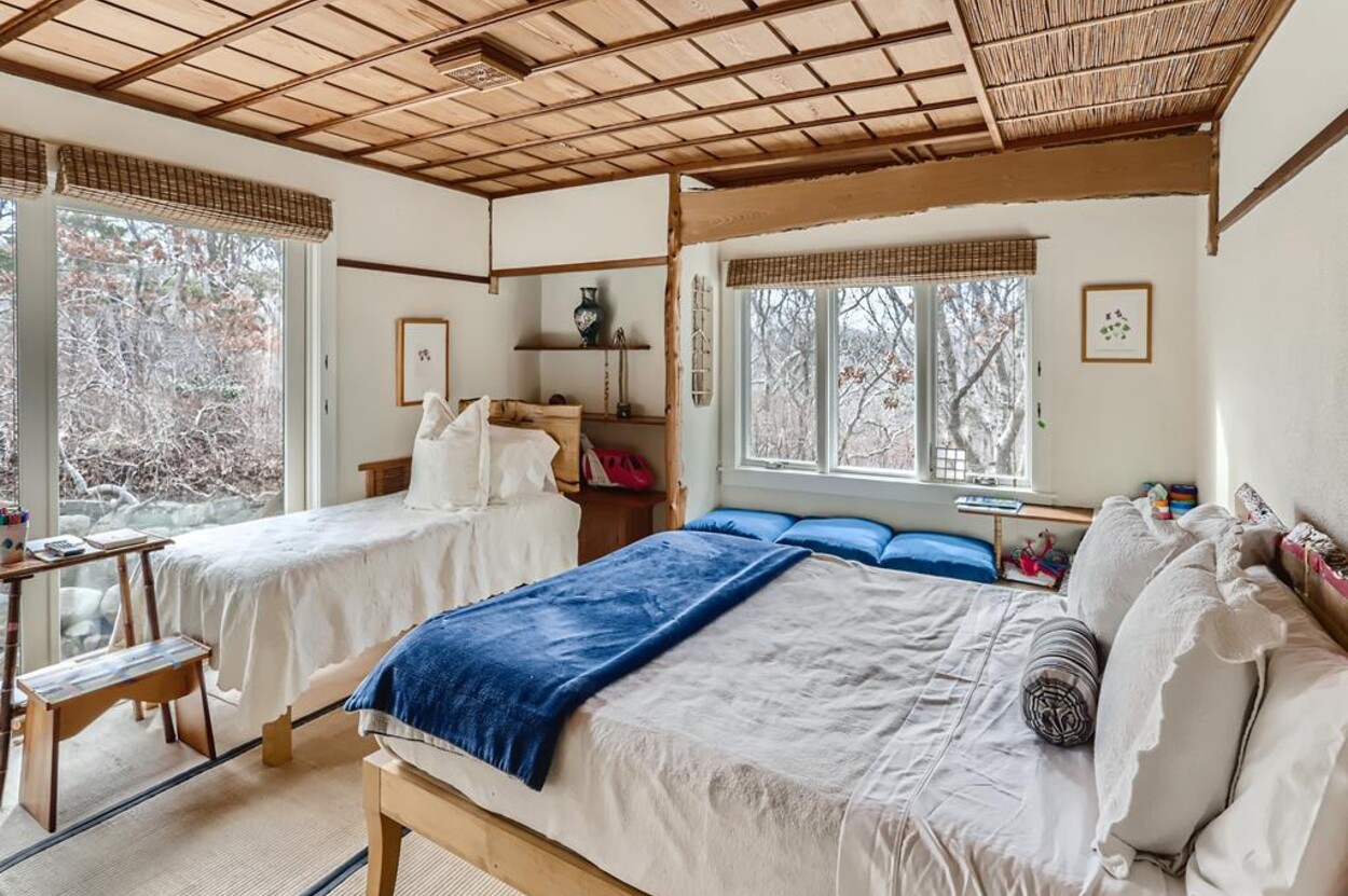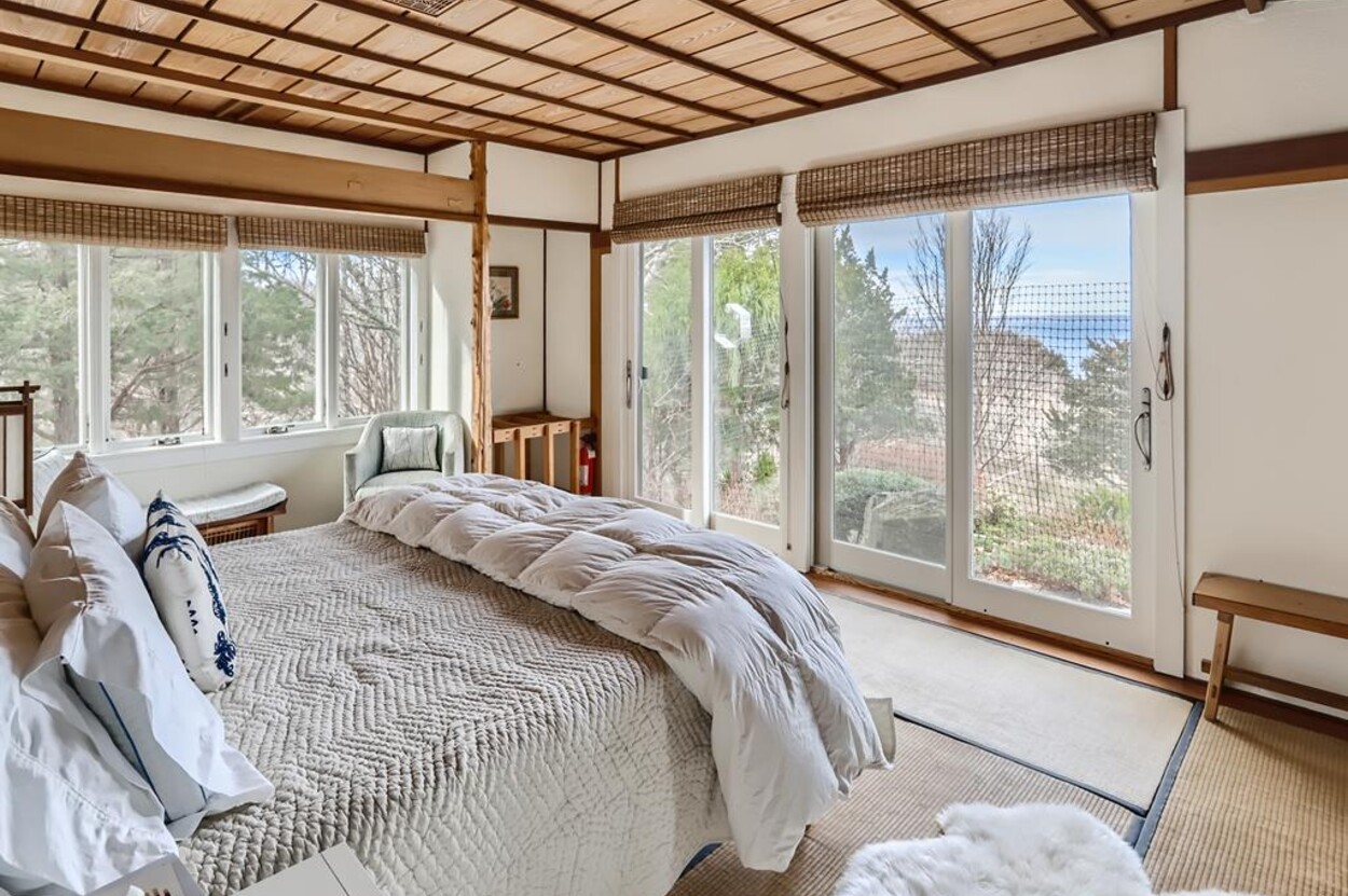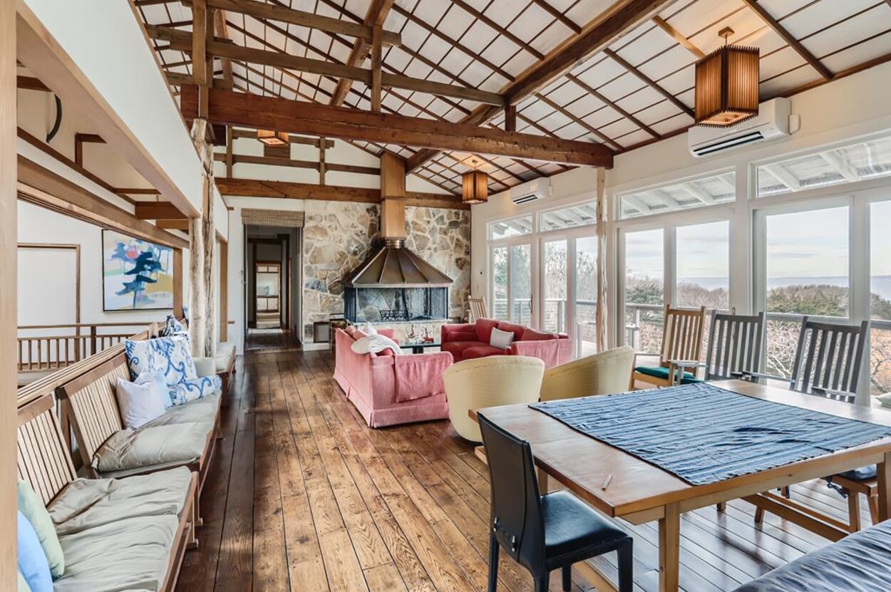 Zen Gates located in Seven Gates Farm is a stunningly beautiful tranquil setting within a 1600 acre association on Chilmarks North Shore. There are two and a half miles of private association beaches with two large docks for swimming and boating, two tennis courts and miles of natural trails. Path in front of the home leads to the quiet beach. The Japanese Farm House style home sits on 6 acres with exquisite landscaping. It has a gourmet fully equipped kitchen, 5 bedrooms and 5 baths with water views. The one bedroom, one bath guest house is fully equipped and newly built with water views. There is a newly built free standing and fully equipped gym as well. Property tour at https://vimeo.com/810958791/6155713aae
