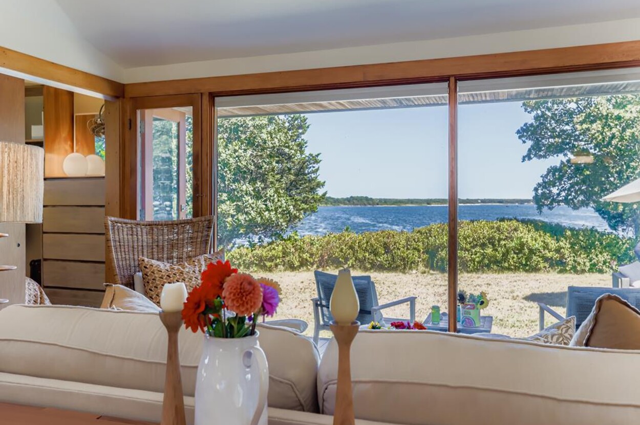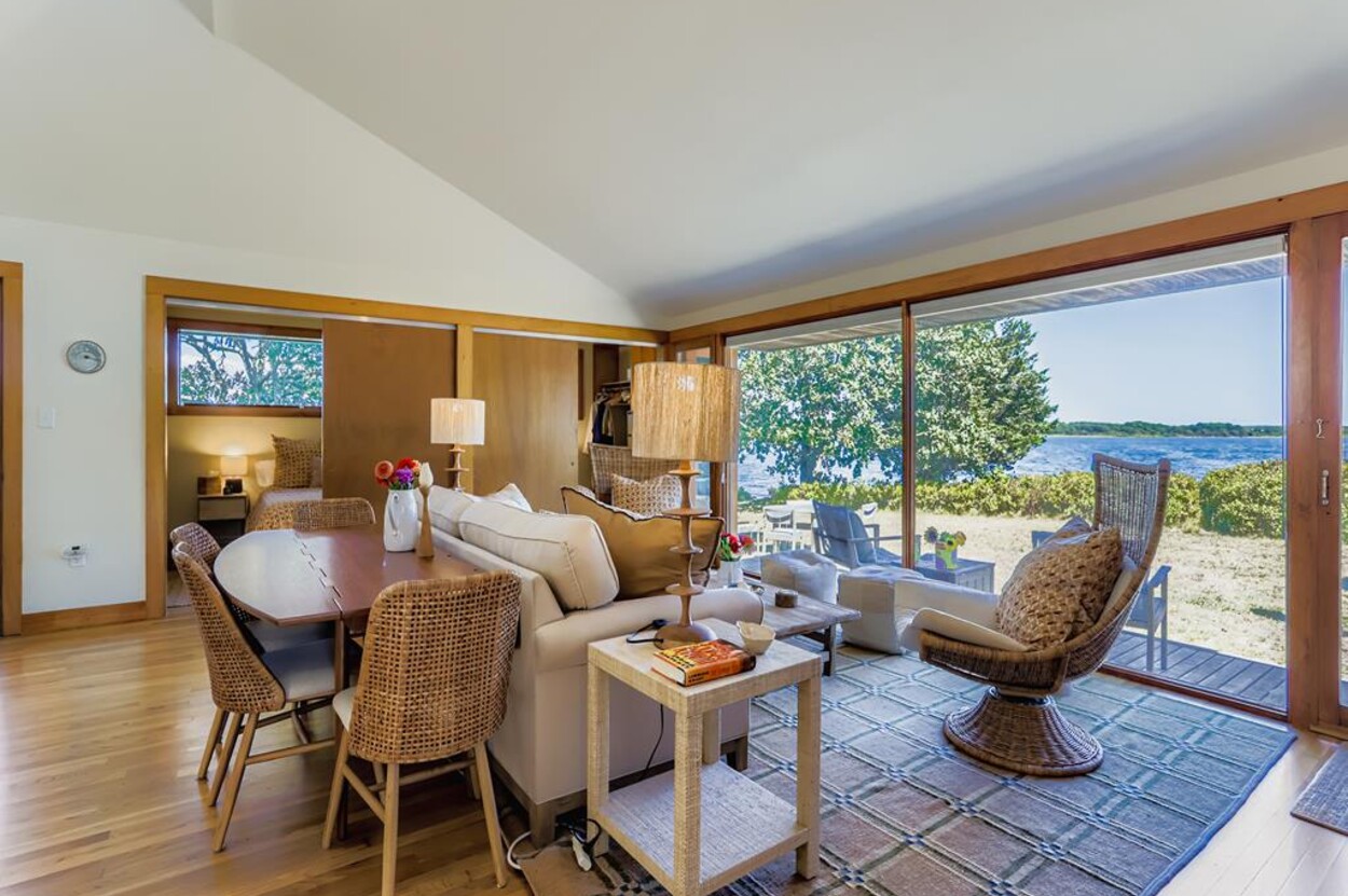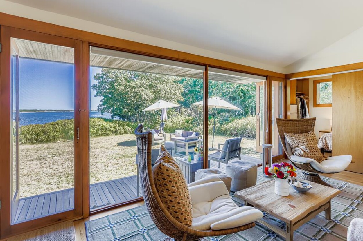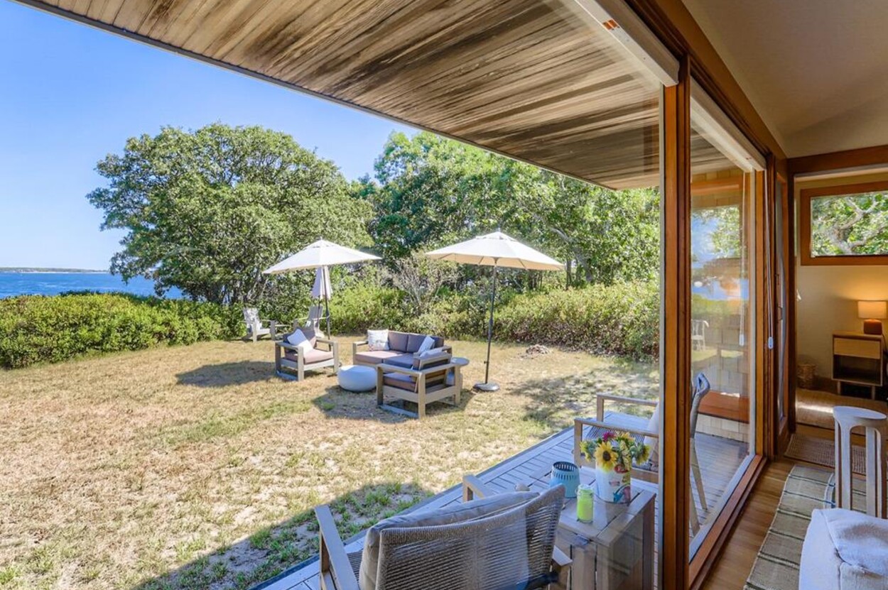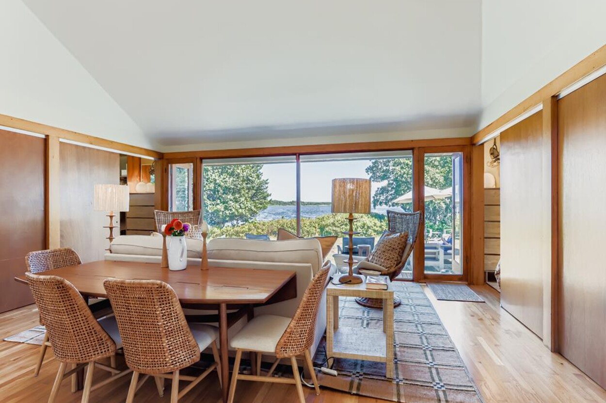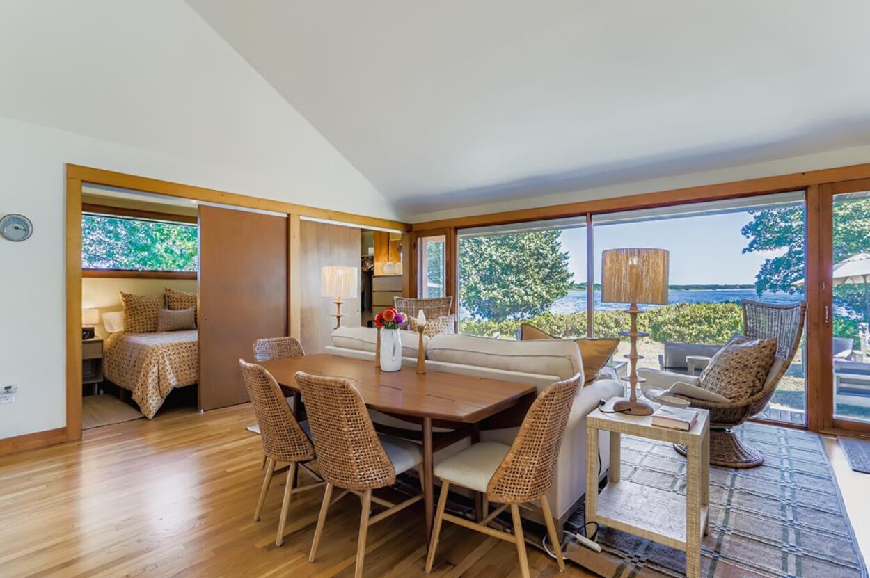 This mid century modern cottage has had recent tasteful upgrades to the entire space. New furnishings, and fresh paint throughout, all whilst retaining its original architectural character. The central living room has expansive water-views of the pond from the huge floor to ceiling picture window and is flanked by 3 pod-style bedrooms (with full size beds) with the original sliding privacy doors that evoke a boat cabin like feel. Plus there's a 4th pod set up as an office if you need to work or study while on vacation. Modern amenities like AC, and high speed internet complete the property. Note: there is no TV - a deliberate decision by the owners. Step outside to a private grassy yard with outdoor shower, seating and dining table. If you like to be away from it all and surrounded by nature with your own sandy pond beach just steps from the house ... plus walk or drive to beautiful Quansoo beach, then this is for you!