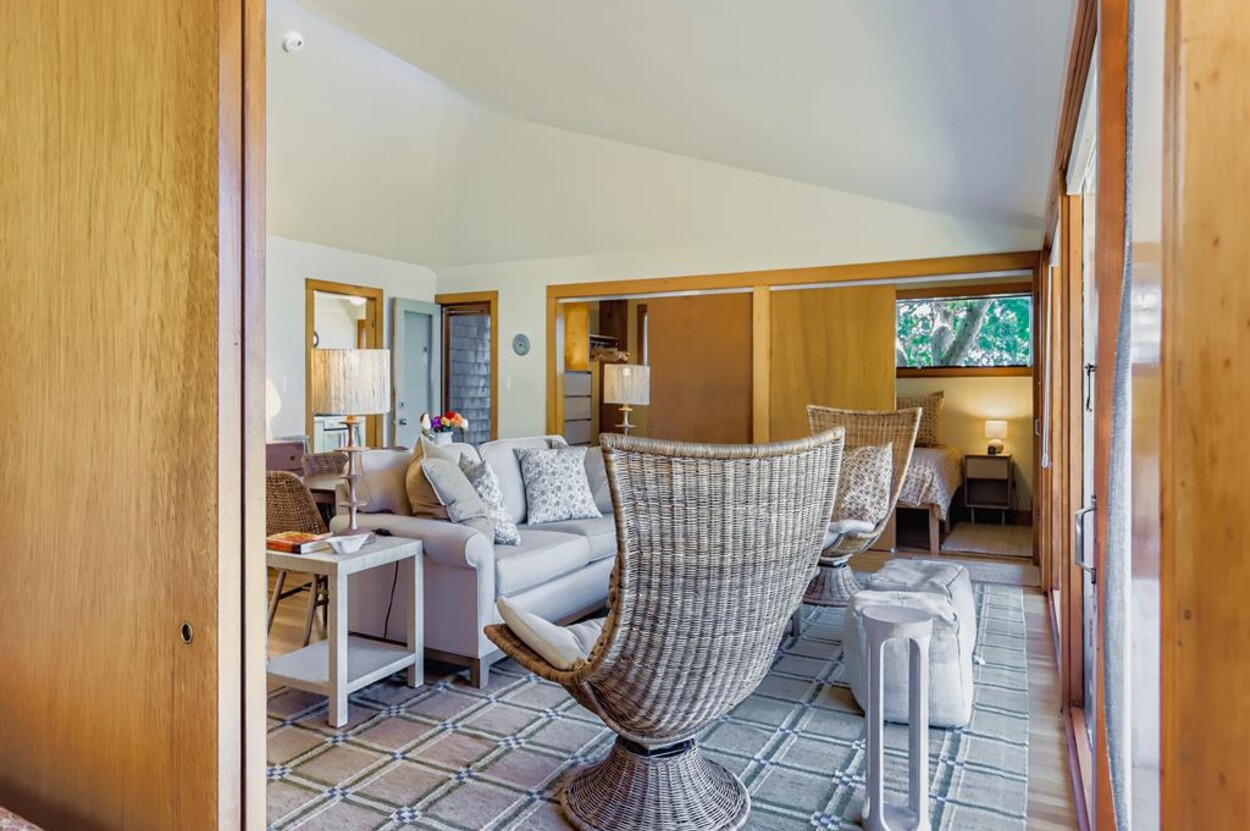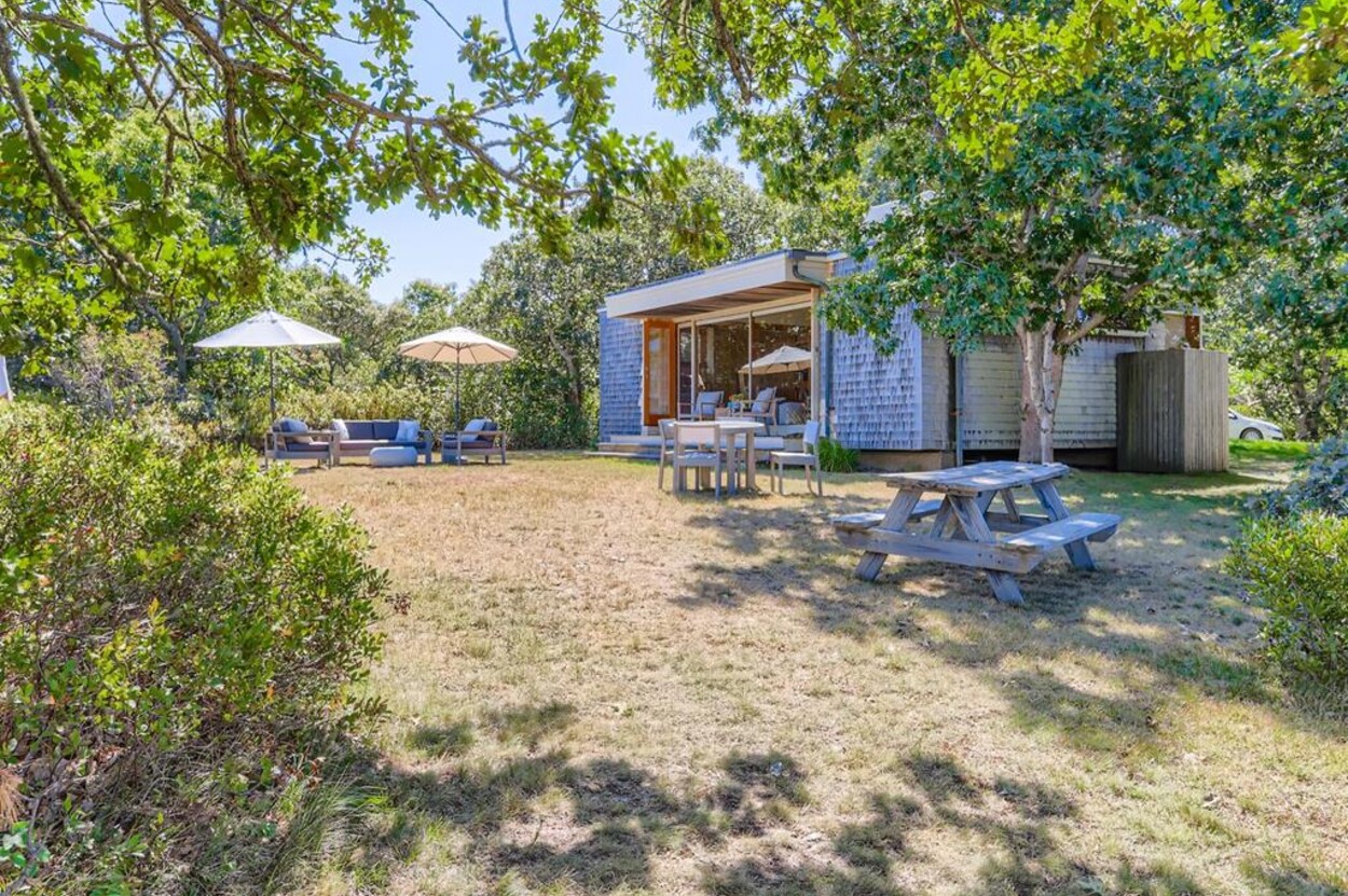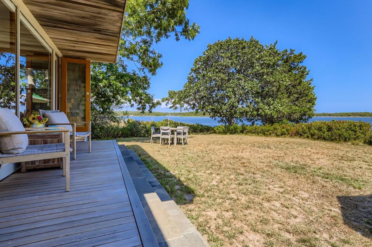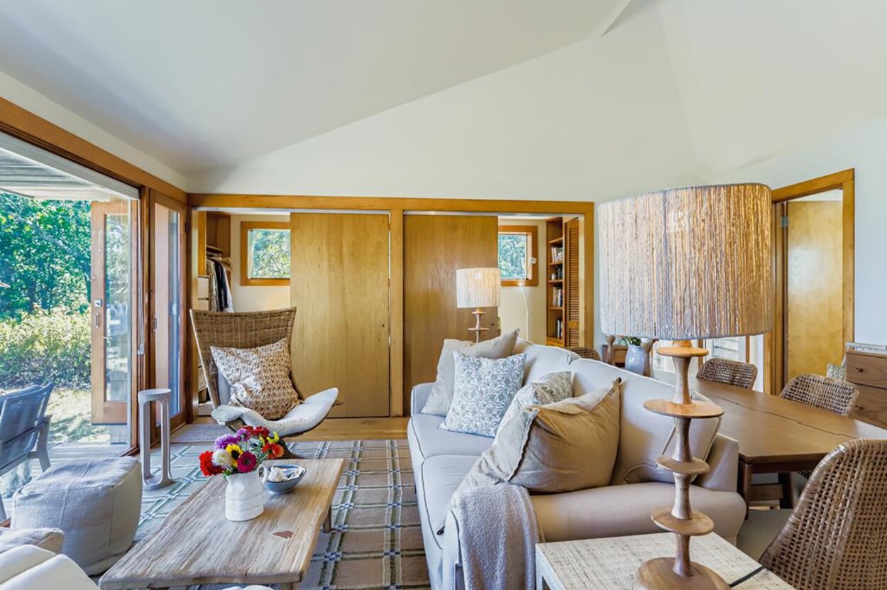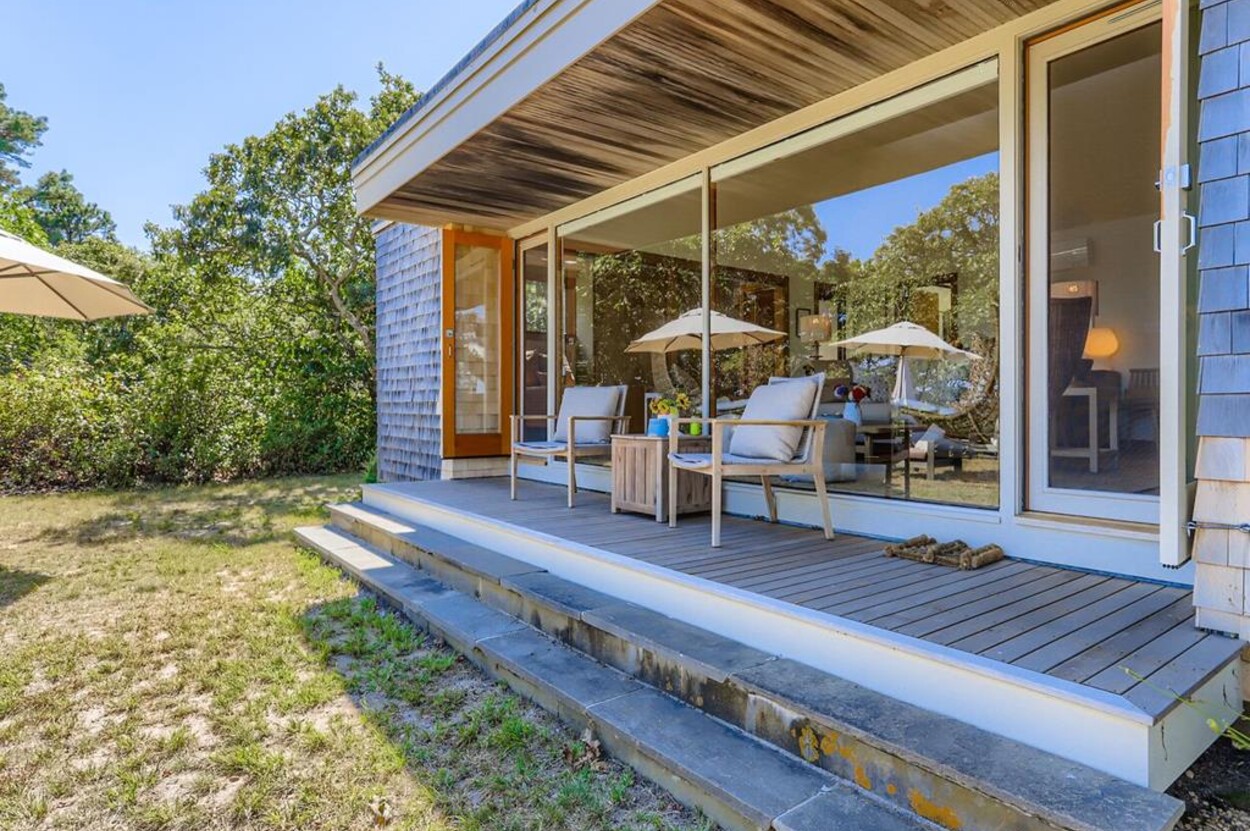 This mid century modern cottage has had recent tasteful upgrades to the entire space. New furnishings, and fresh paint throughout, all whilst retaining its original architectural character. The central living room has expansive water-views of the pond from the huge floor to ceiling picture window and is flanked by 3 pod-style bedrooms (with full size beds) with the original sliding privacy doors that evoke a boat cabin like feel. Plus there's a 4th pod set up as an office if you need to work or study while on vacation. Modern amenities like AC, and high speed internet complete the property. Note: there is no TV - a deliberate decision by the owners. Step outside to a private grassy yard with outdoor shower, seating and dining table. If you like to be away from it all and surrounded by nature with your own sandy pond beach just steps from the house ... plus walk or drive to beautiful Quansoo beach, then this is for you!