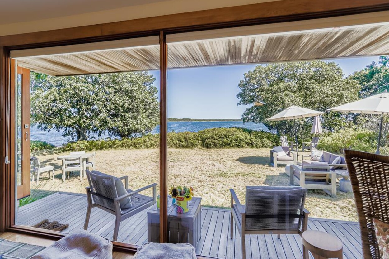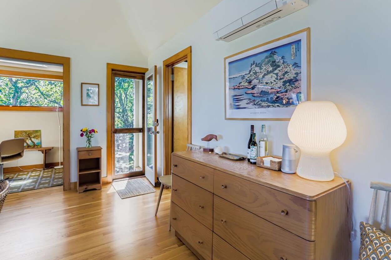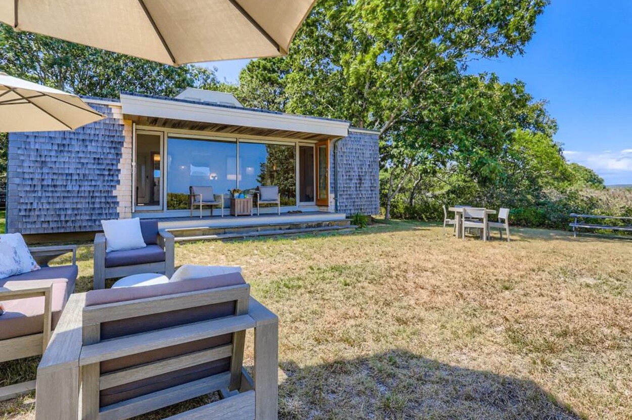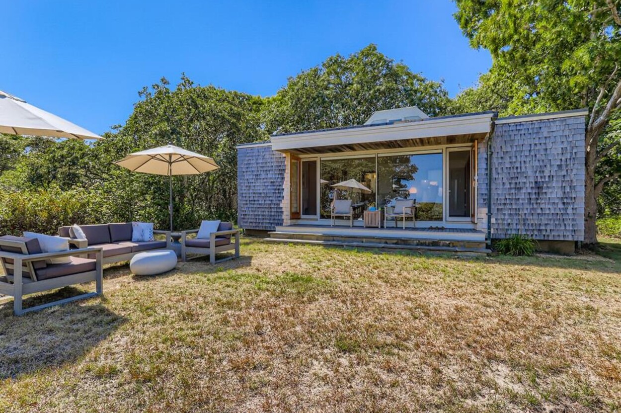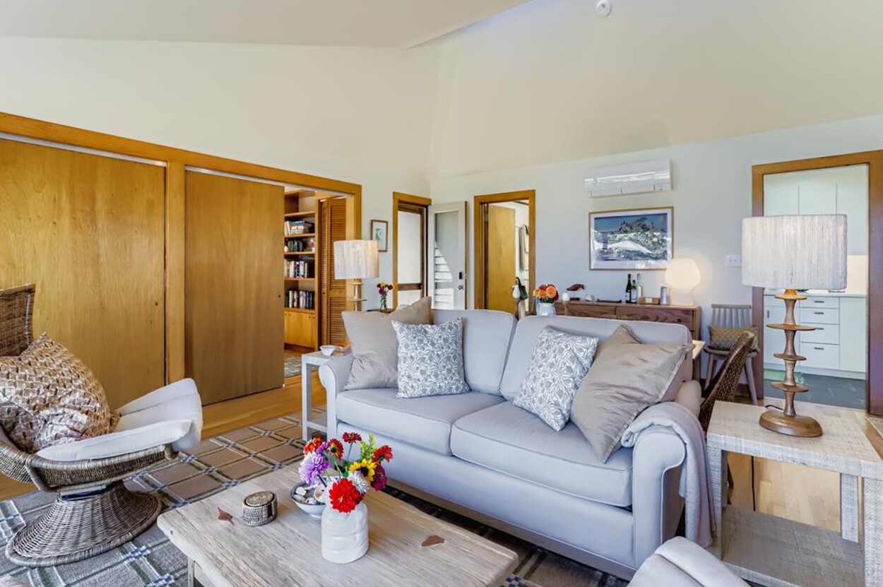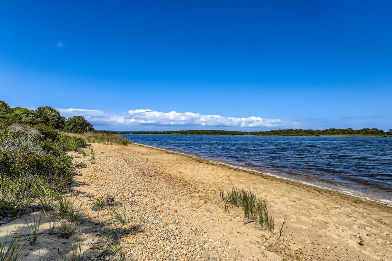 This mid century modern cottage has had recent tasteful upgrades to the entire space. New furnishings, and fresh paint throughout, all whilst retaining its original architectural character. The central living room has expansive water-views of the pond from the huge floor to ceiling picture window and is flanked by 3 pod-style bedrooms (with full size beds) with the original sliding privacy doors that evoke a boat cabin like feel. Plus there's a 4th pod set up as an office if you need to work or study while on vacation. Modern amenities like AC, and high speed internet complete the property. Note: there is no TV - a deliberate decision by the owners. Step outside to a private grassy yard with outdoor shower, seating and dining table. If you like to be away from it all and surrounded by nature with your own sandy pond beach just steps from the house ... plus walk or drive to beautiful Quansoo beach, then this is for you!