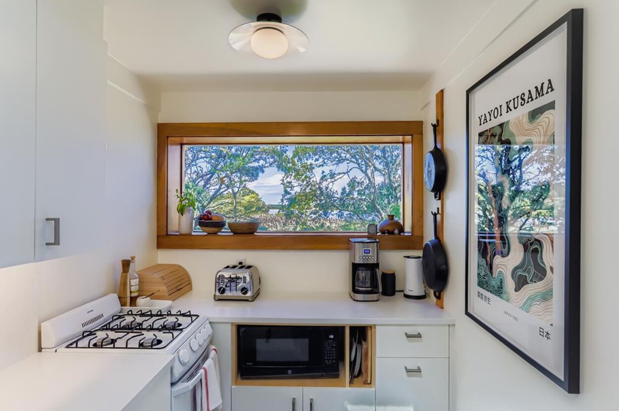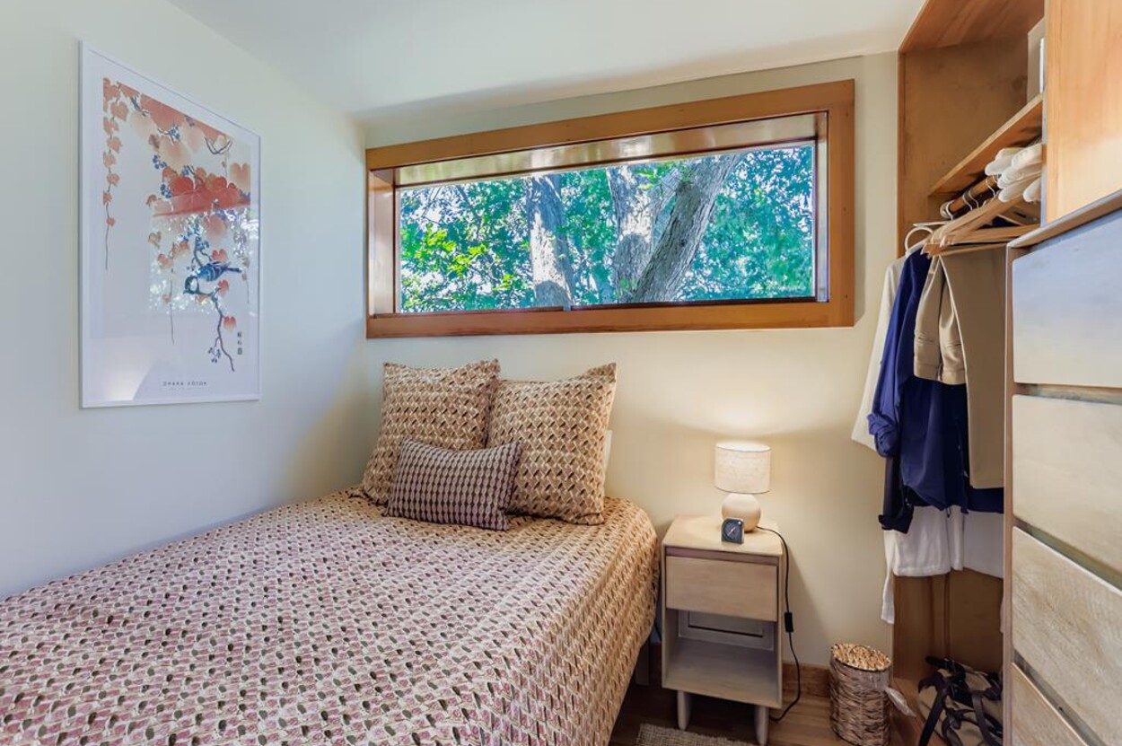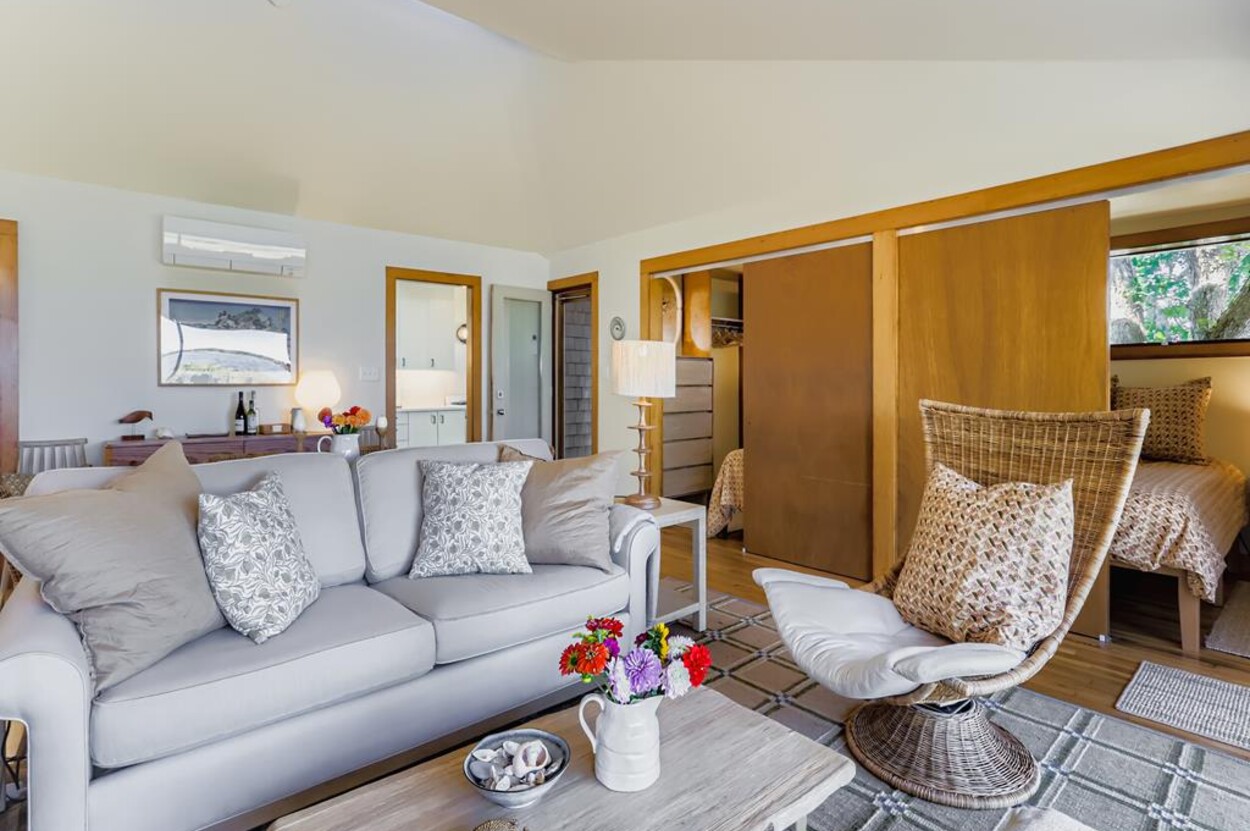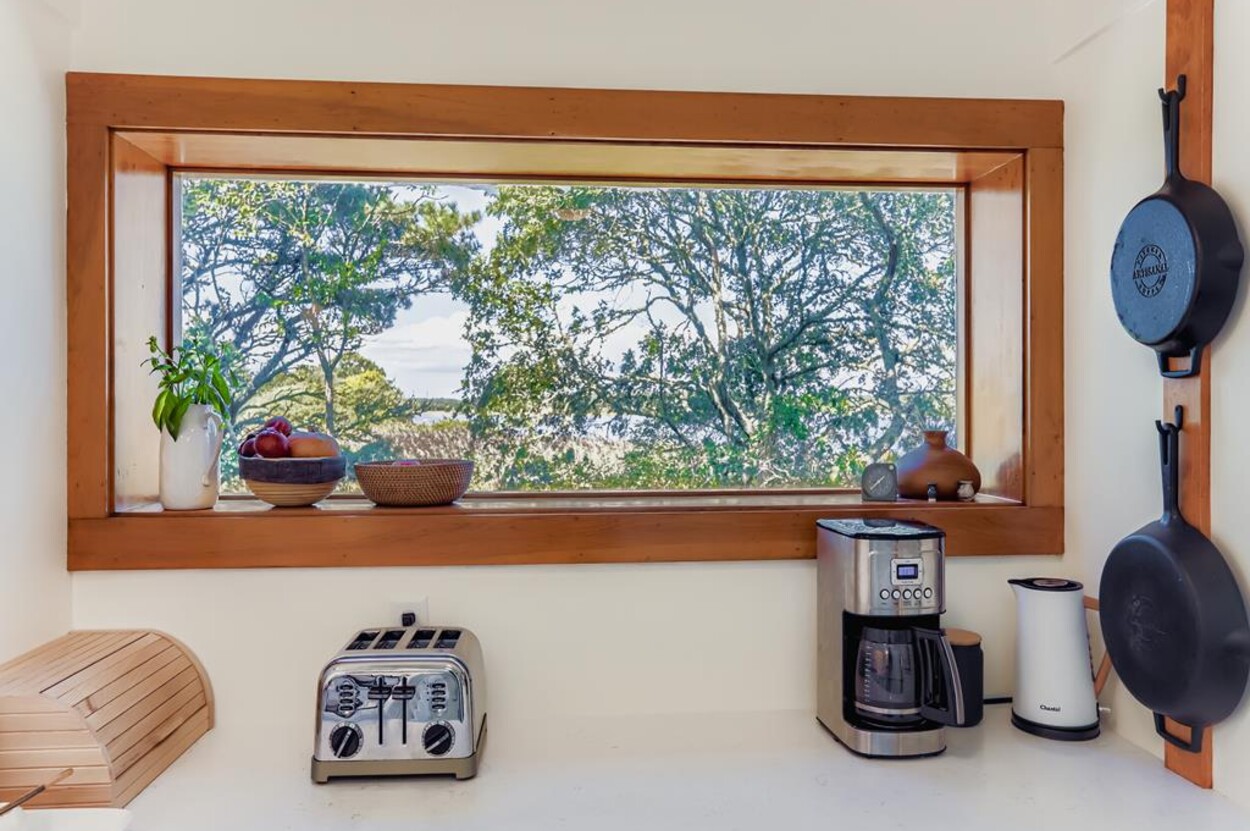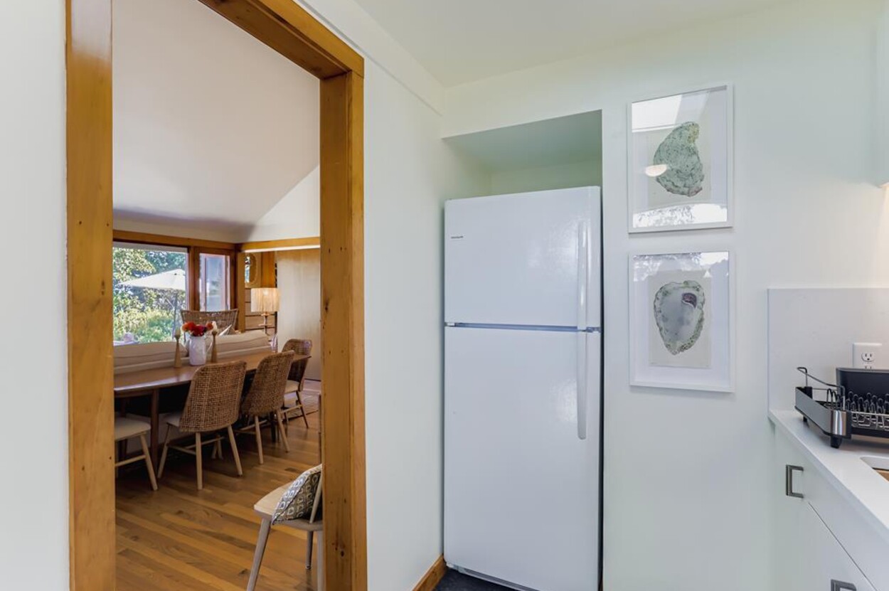 This mid century modern cottage has had recent tasteful upgrades to the entire space. New furnishings, and fresh paint throughout, all whilst retaining its original architectural character. The central living room has expansive water-views of the pond from the huge floor to ceiling picture window and is flanked by 3 pod-style bedrooms (with full size beds) with the original sliding privacy doors that evoke a boat cabin like feel. Plus there's a 4th pod set up as an office if you need to work or study while on vacation. Modern amenities like AC, and high speed internet complete the property. Note: there is no TV - a deliberate decision by the owners. Step outside to a private grassy yard with outdoor shower, seating and dining table. If you like to be away from it all and surrounded by nature with your own sandy pond beach just steps from the house ... plus walk or drive to beautiful Quansoo beach, then this is for you!