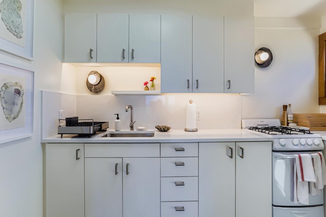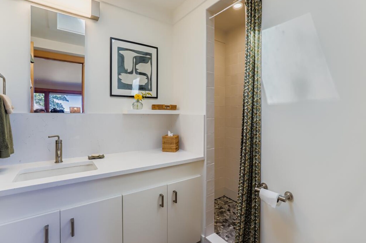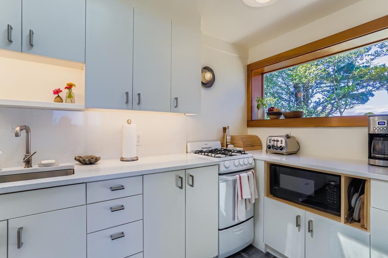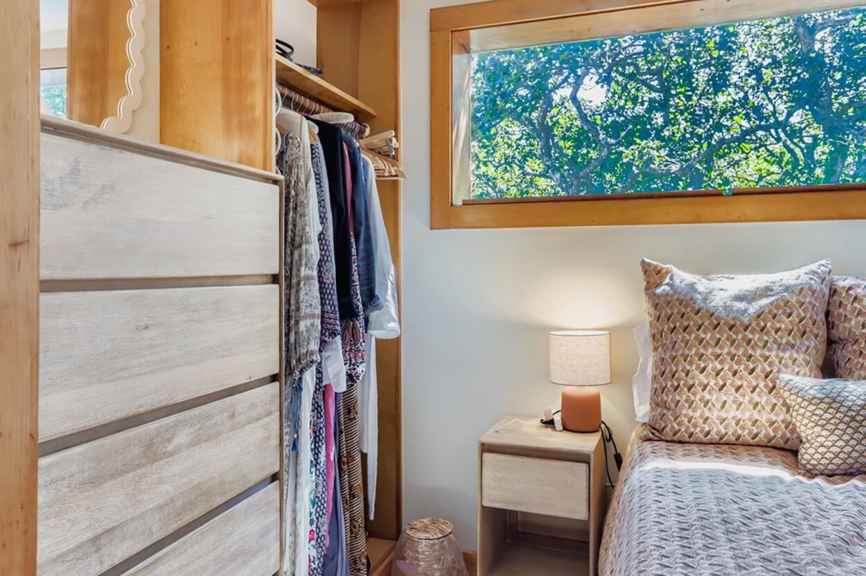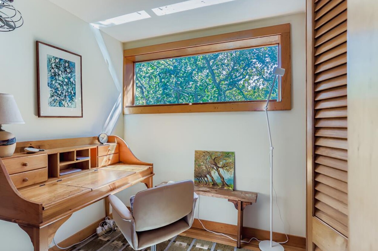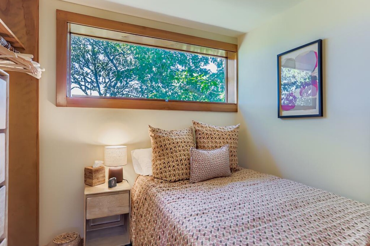 This mid century modern cottage has had recent tasteful upgrades to the entire space. New furnishings, and fresh paint throughout, all whilst retaining its original architectural character. The central living room has expansive water-views of the pond from the huge floor to ceiling picture window and is flanked by 3 pod-style bedrooms (with full size beds) with the original sliding privacy doors that evoke a boat cabin like feel. Plus there's a 4th pod set up as an office if you need to work or study while on vacation. Modern amenities like AC, and high speed internet complete the property. Note: there is no TV - a deliberate decision by the owners. Step outside to a private grassy yard with outdoor shower, seating and dining table. If you like to be away from it all and surrounded by nature with your own sandy pond beach just steps from the house ... plus walk or drive to beautiful Quansoo beach, then this is for you!