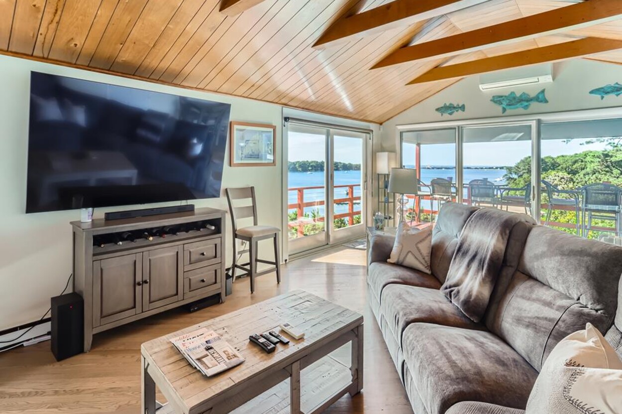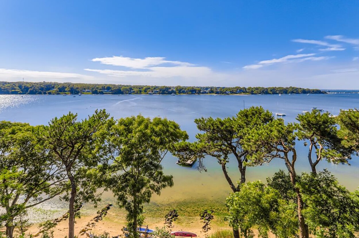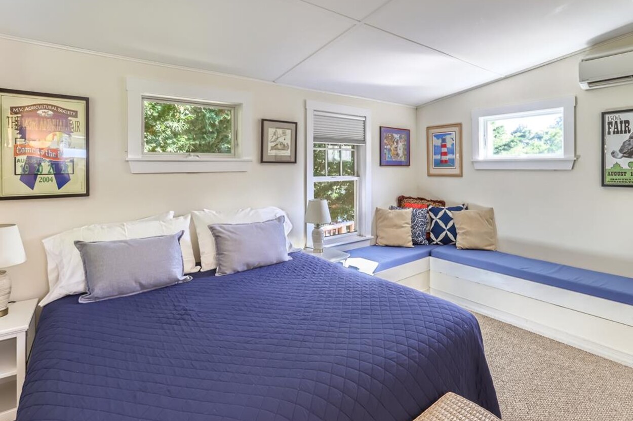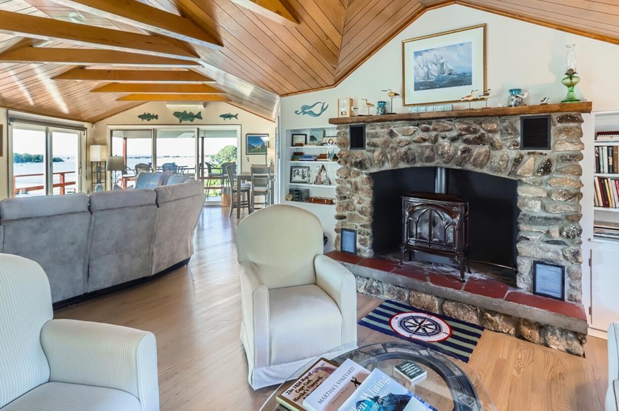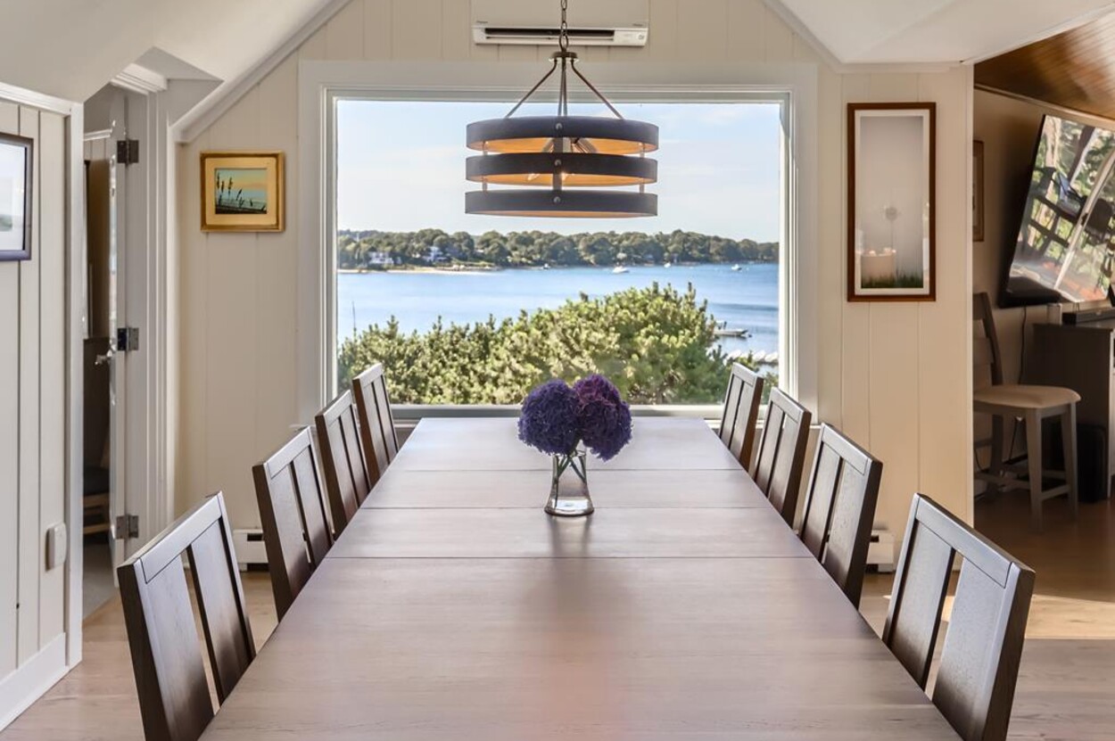 This welcoming air conditioned waterfront house and guest house is privately set with panoramic water views of Lagoon Pond, Hines Point, the draw bridge, Vineyard Sound and Cape Cod. The main house has a generous open layout with substantial living room, dining, and sitting areas that allow for togetherness and/or privacy. The kitchen is huge, while the two screened porches are great for watching the boating and wildlife activity as well as the incredible sunsets. The primary bedroom has floor to ceiling water views that will keep you in bed or tempt you to have breakfast in bed. There is a second lovely bedroom with water views and full bath on this level.