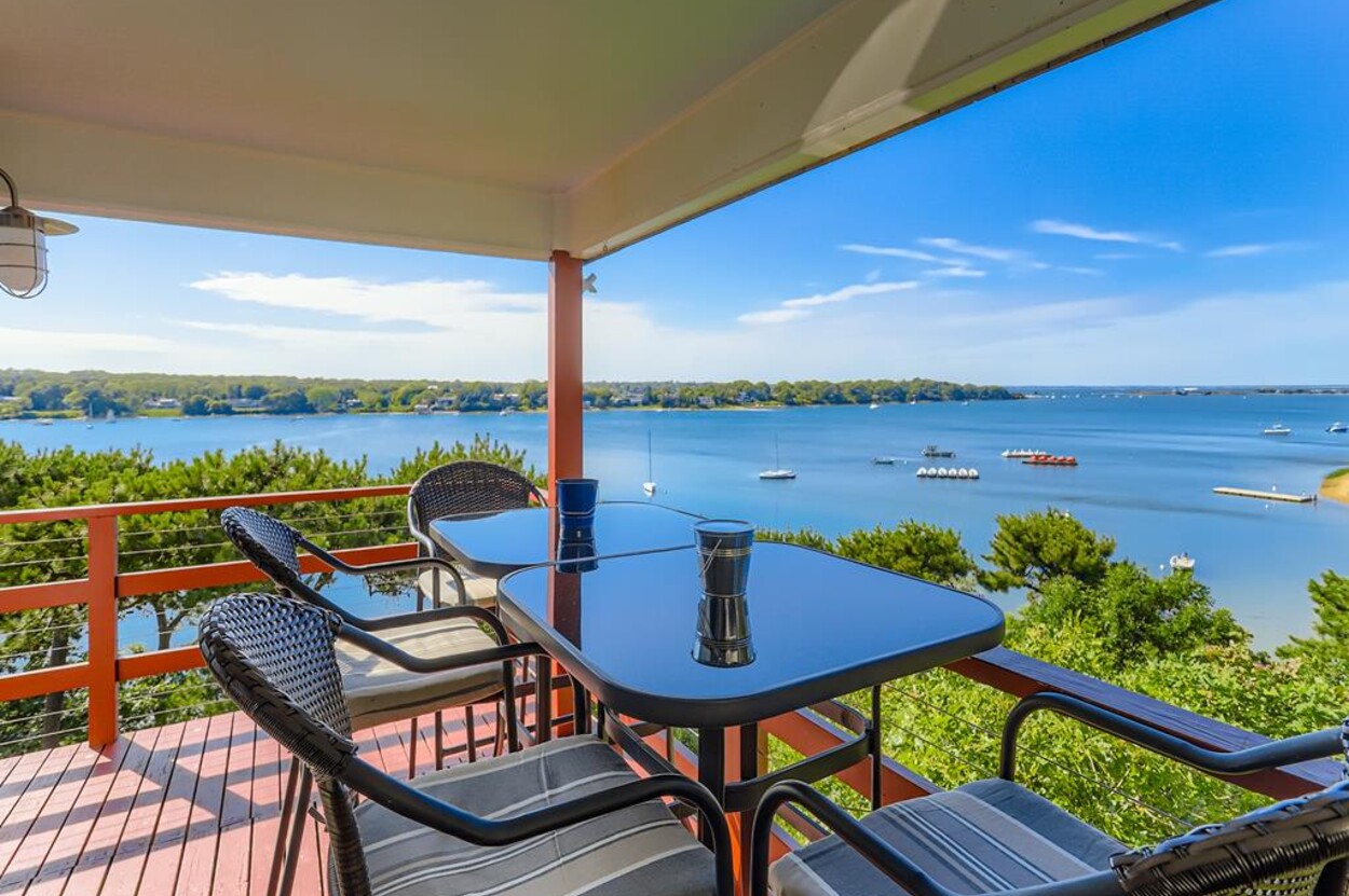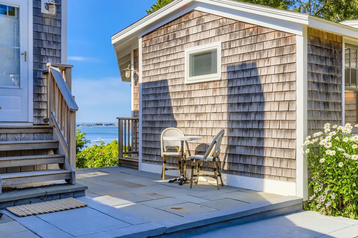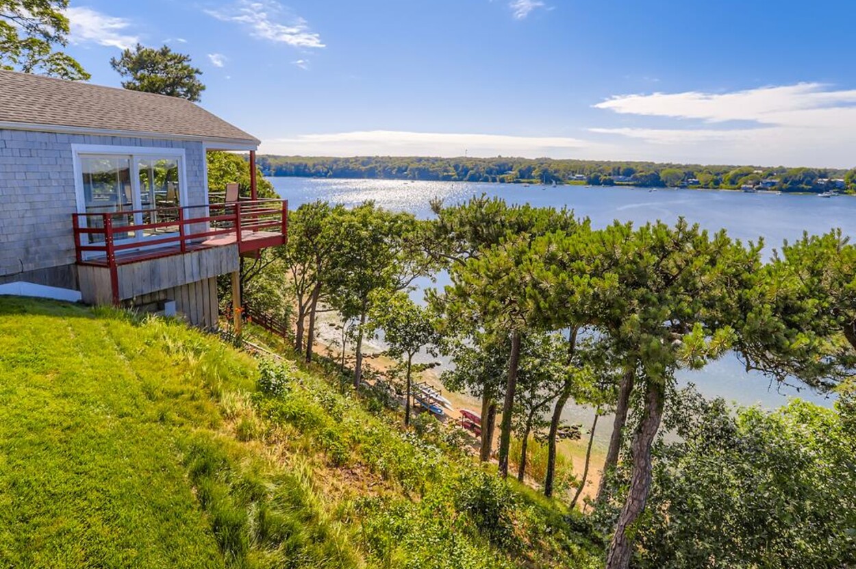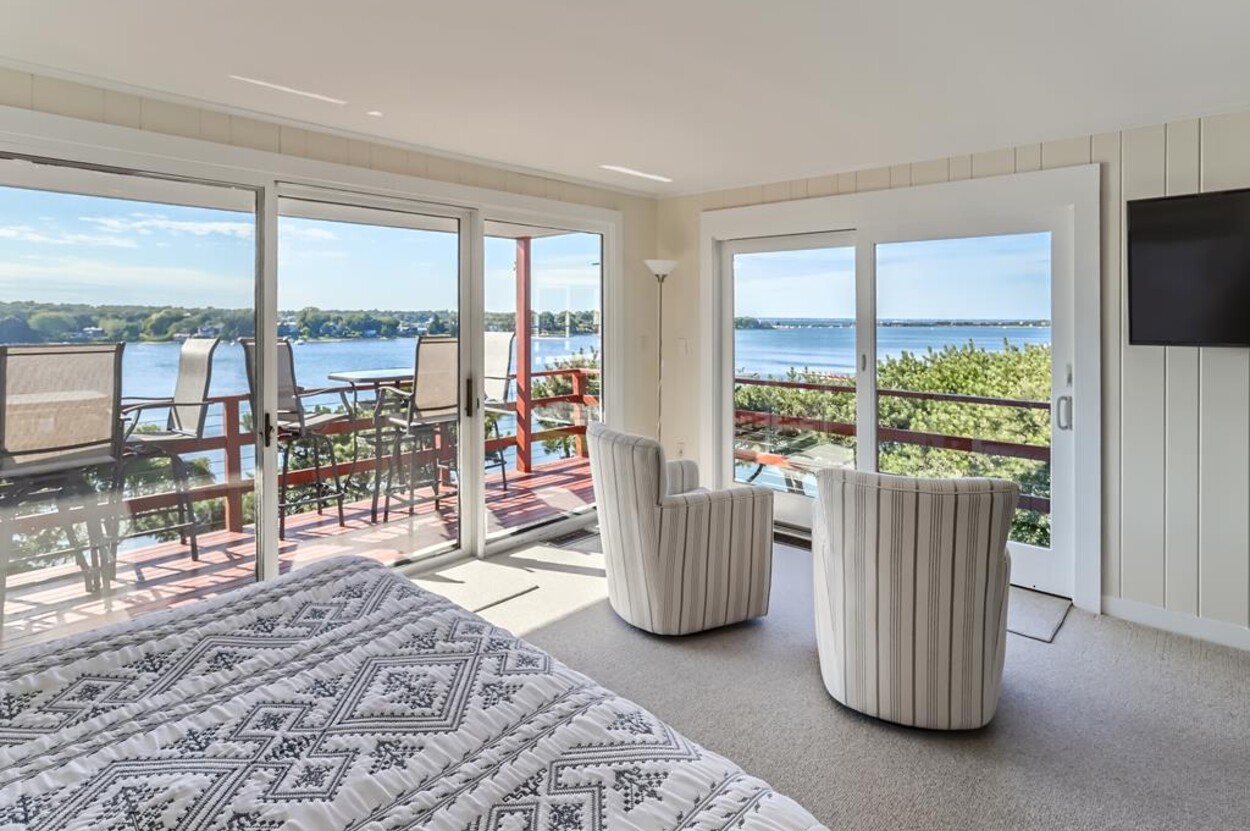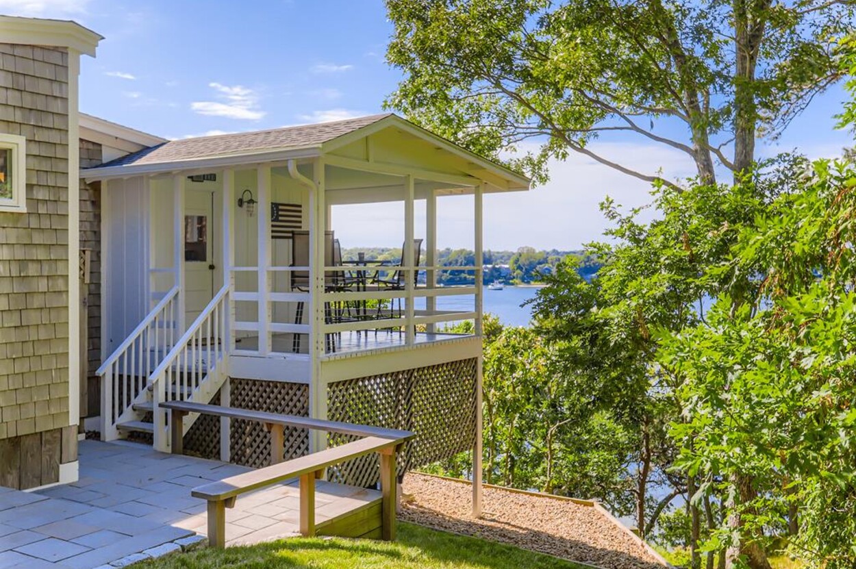 This welcoming air conditioned waterfront house and guest house is privately set with panoramic water views of Lagoon Pond, Hines Point, the draw bridge, Vineyard Sound and Cape Cod. The main house has a generous open layout with substantial living room, dining, and sitting areas that allow for togetherness and/or privacy. The kitchen is huge, while the two screened porches are great for watching the boating and wildlife activity as well as the incredible sunsets. The primary bedroom has floor to ceiling water views that will keep you in bed or tempt you to have breakfast in bed. There is a second lovely bedroom with water views and full bath on this level.