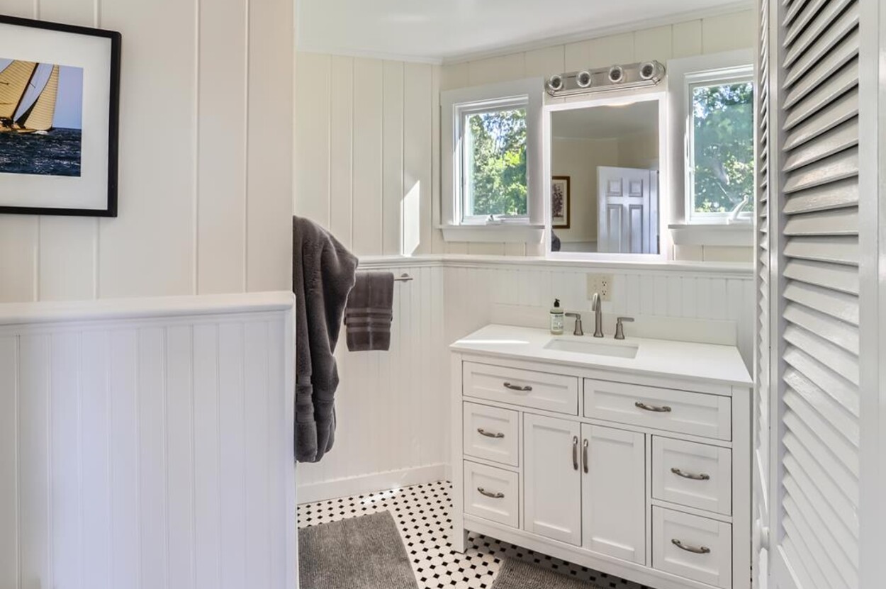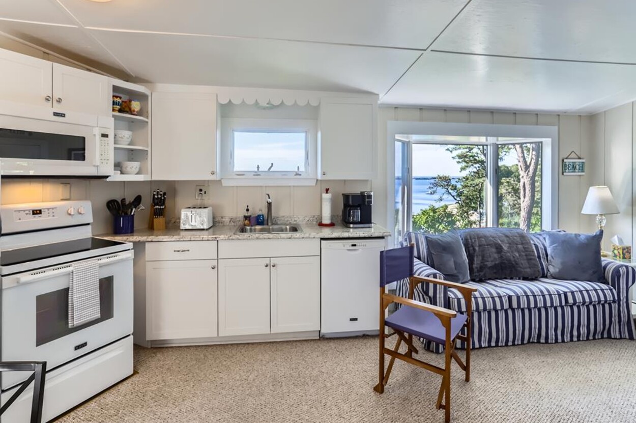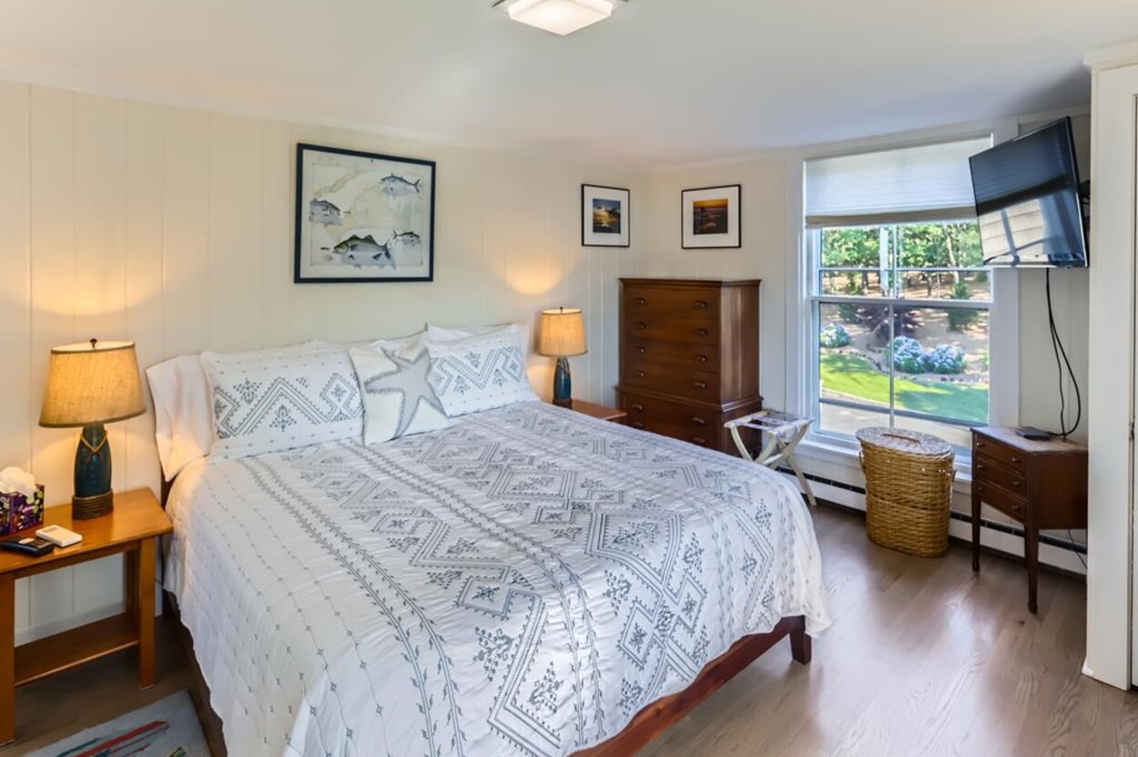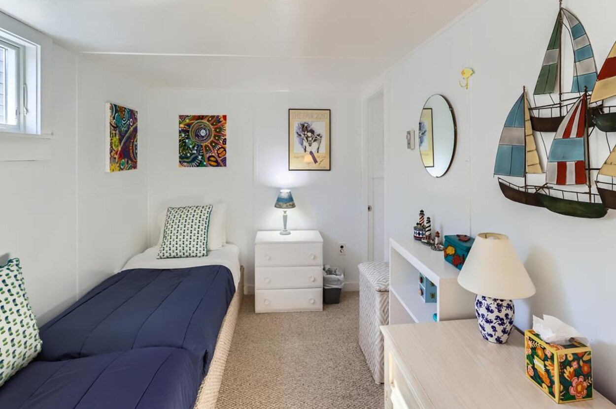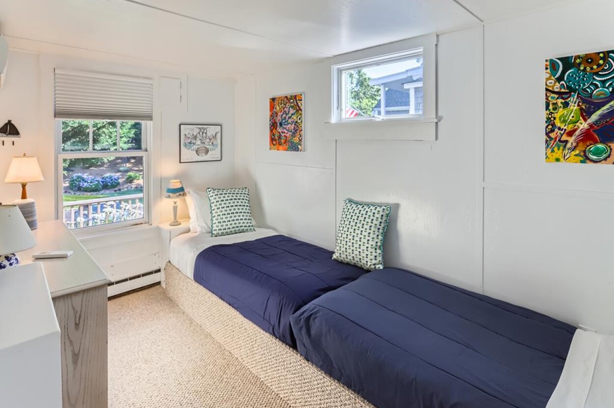 The guest house is precious with equally stunning views of the Lagoon and Sound and its own screened porch. The adult bedroom has a king sized bed and is very large while the other bedroom is perfect for two kids or one adult given the “toe to toe” bed configuration (two twins).