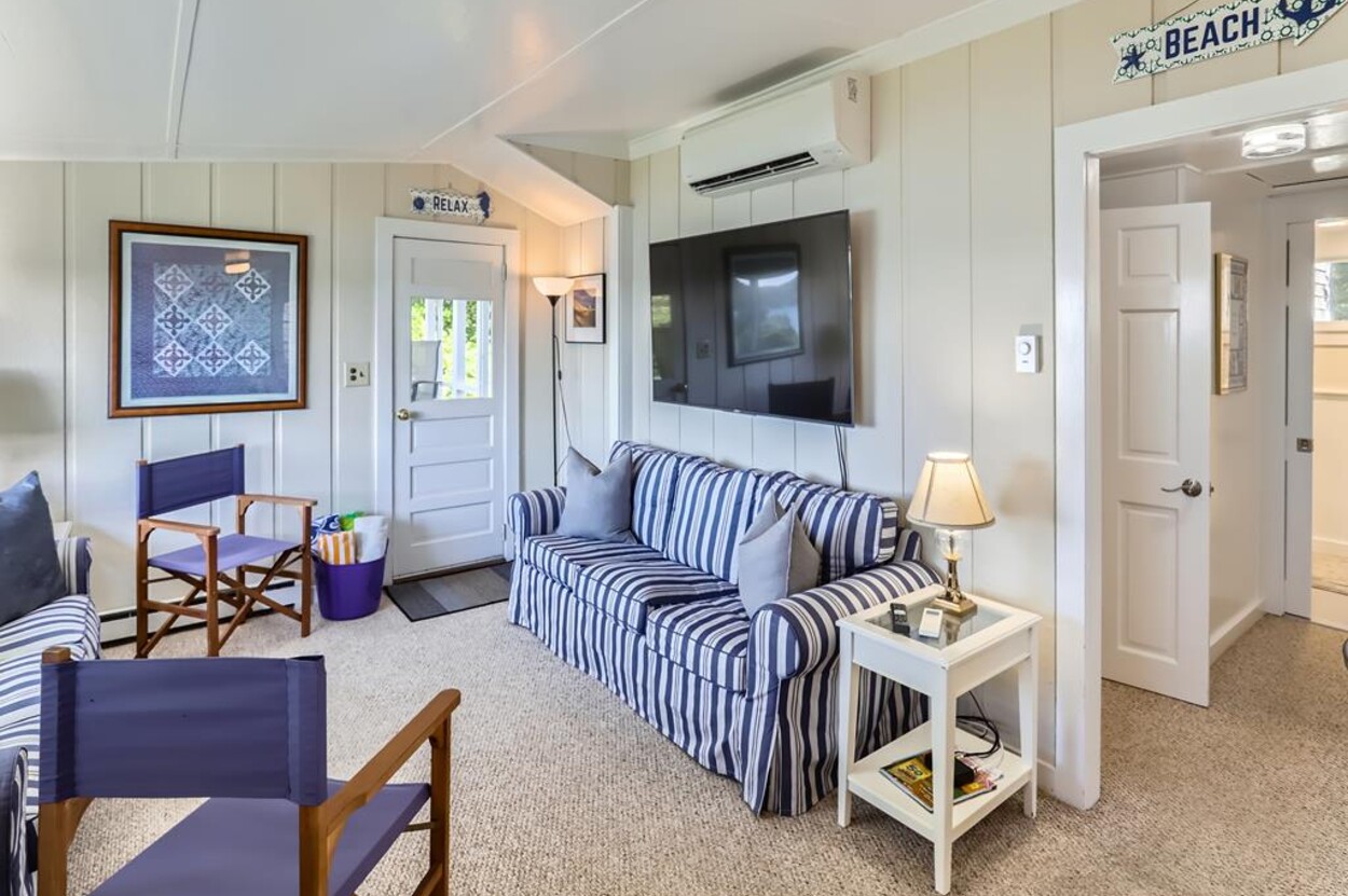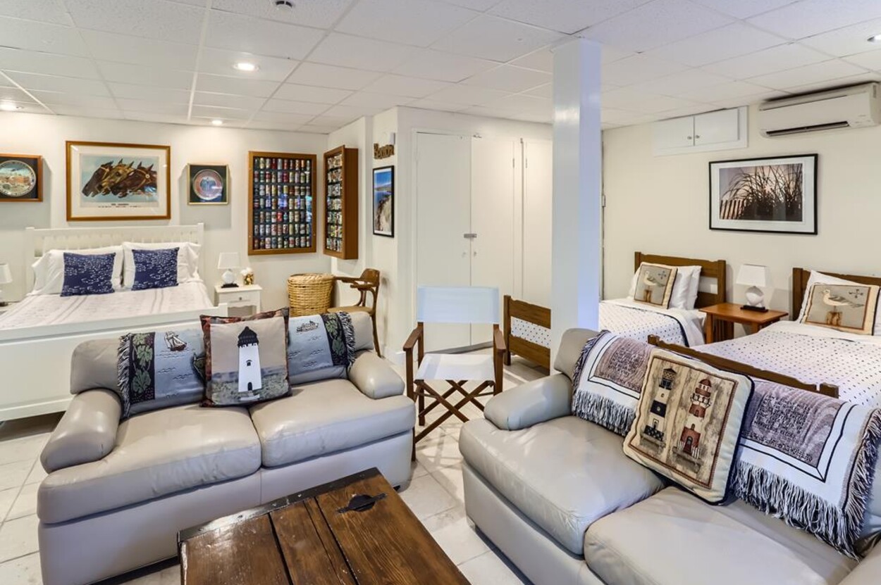The lower level has a bright open third bedroom with a queen and two twins as well as a sitting area with tv and full bath.