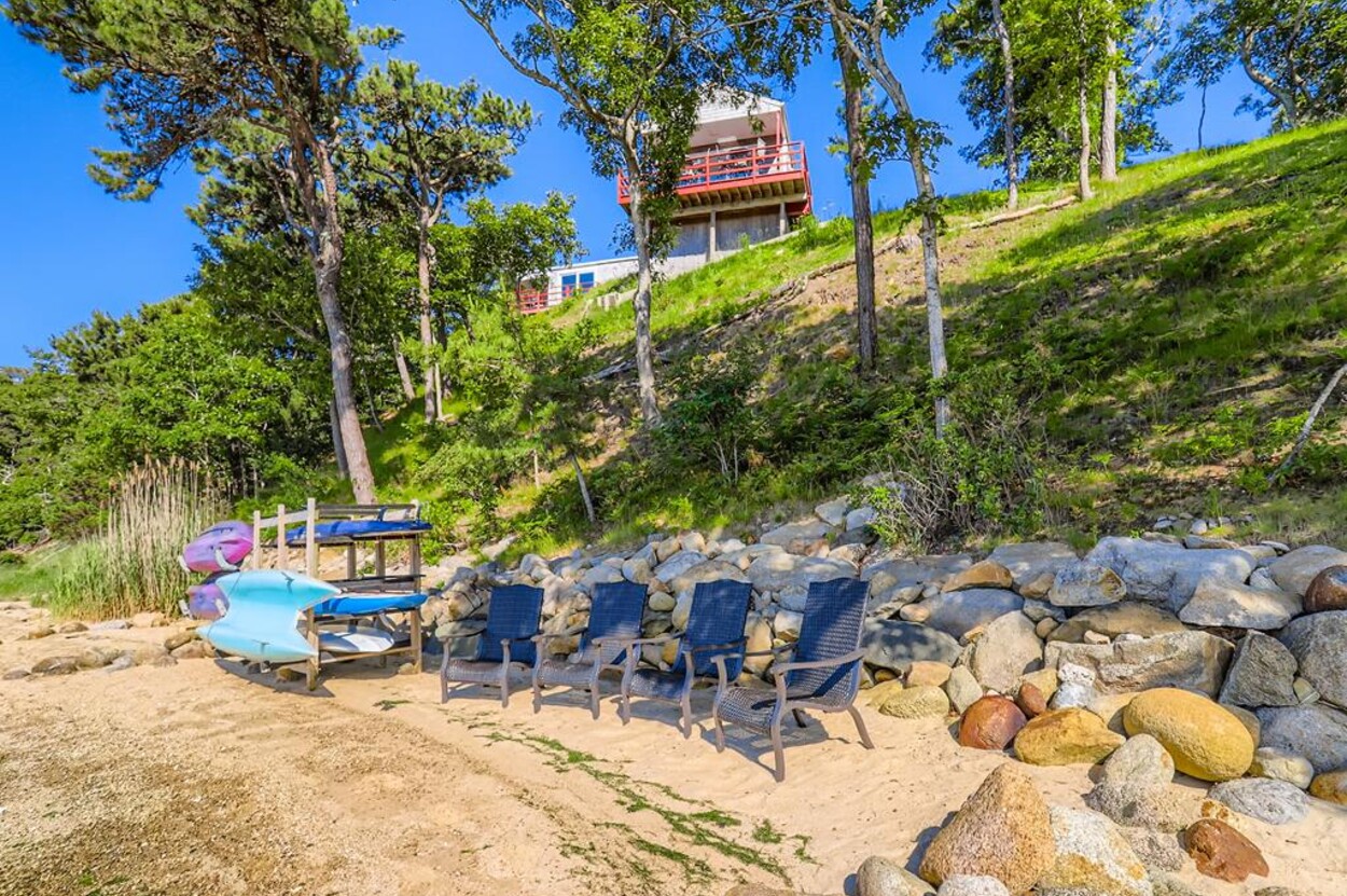 The property is just under two acres which is unique for this neighborhood and has private steps to its private beach. Great for fishing, paddle boarding, kayaking and swimming and the sunsets are INCREDIBLE. Kayaks (2 single), paddleboards, paddles and life jackets are available on site. 16 by 8 ft swimming platform just offshore from the house. The property abuts 14 acres of conservation land with walking trails.
