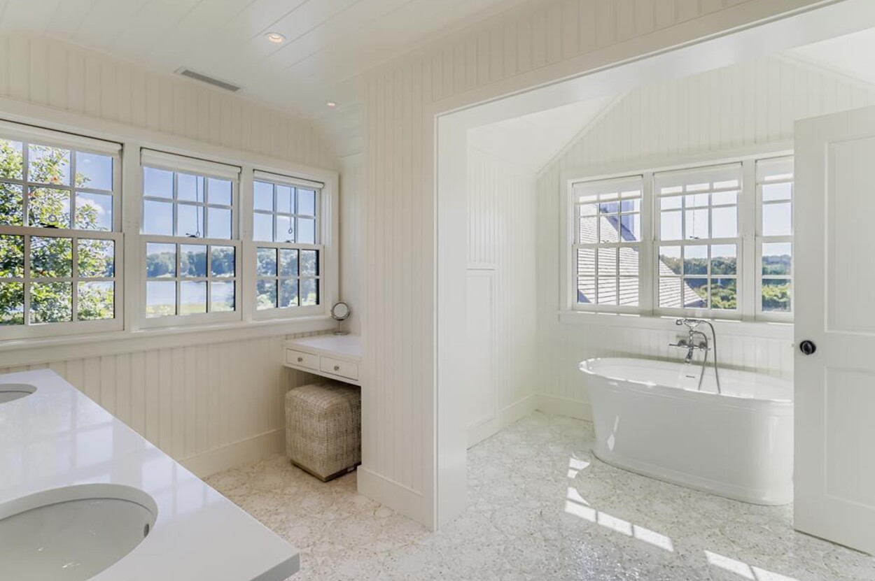 At its heart is the wood-paneled great room—where one can easily imagine artists, musicians, and political figures of the mid-20th century gathering in spirited conversation. The room features dramatic, opposing floor-to-ceiling sliding glass doors that capture both sunrise over the pond and sunset over the Sound. This central space invites both quiet retreat and grand entertaining.