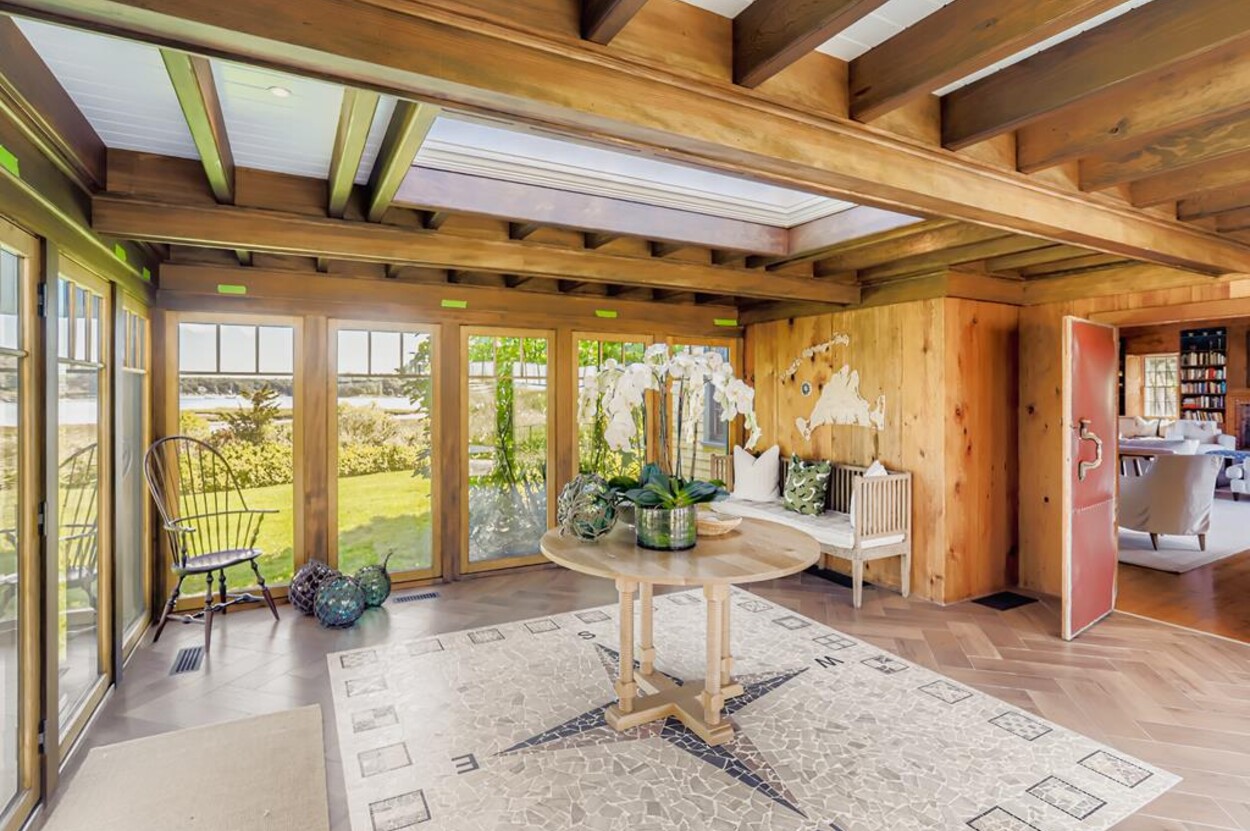 At its heart is the wood-paneled great room—where one can easily imagine artists, musicians, and political figures of the mid-20th century gathering in spirited conversation. The room features dramatic, opposing floor-to-ceiling sliding glass doors that capture both sunrise over the pond and sunset over the Sound. This central space invites both quiet retreat and grand entertaining.