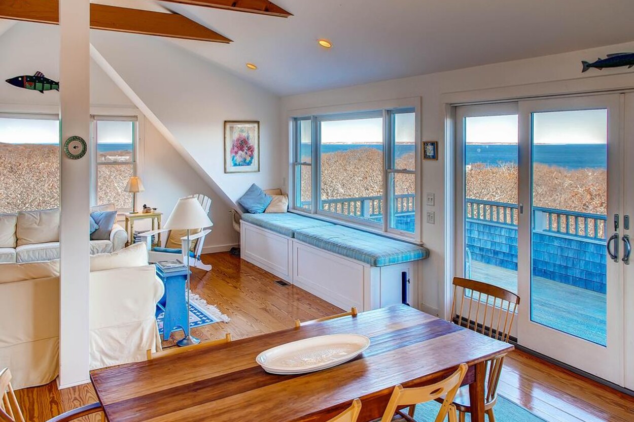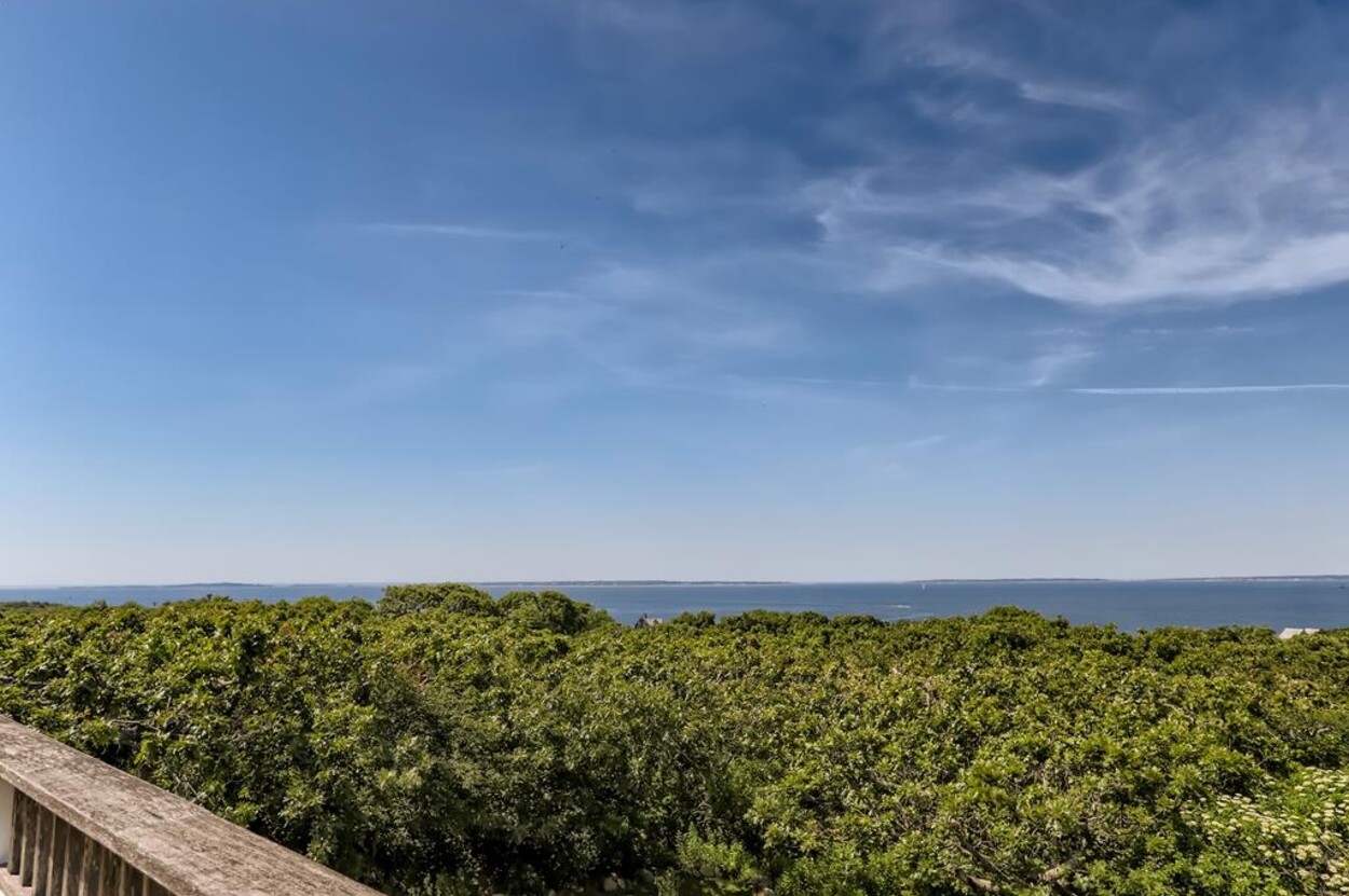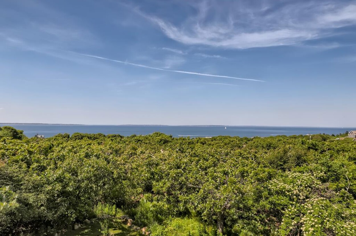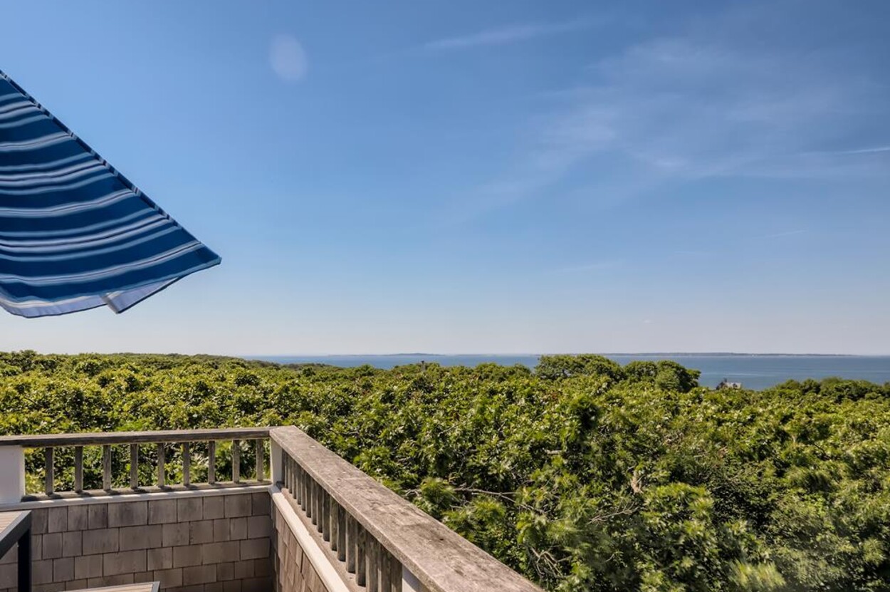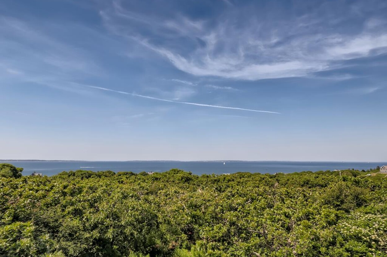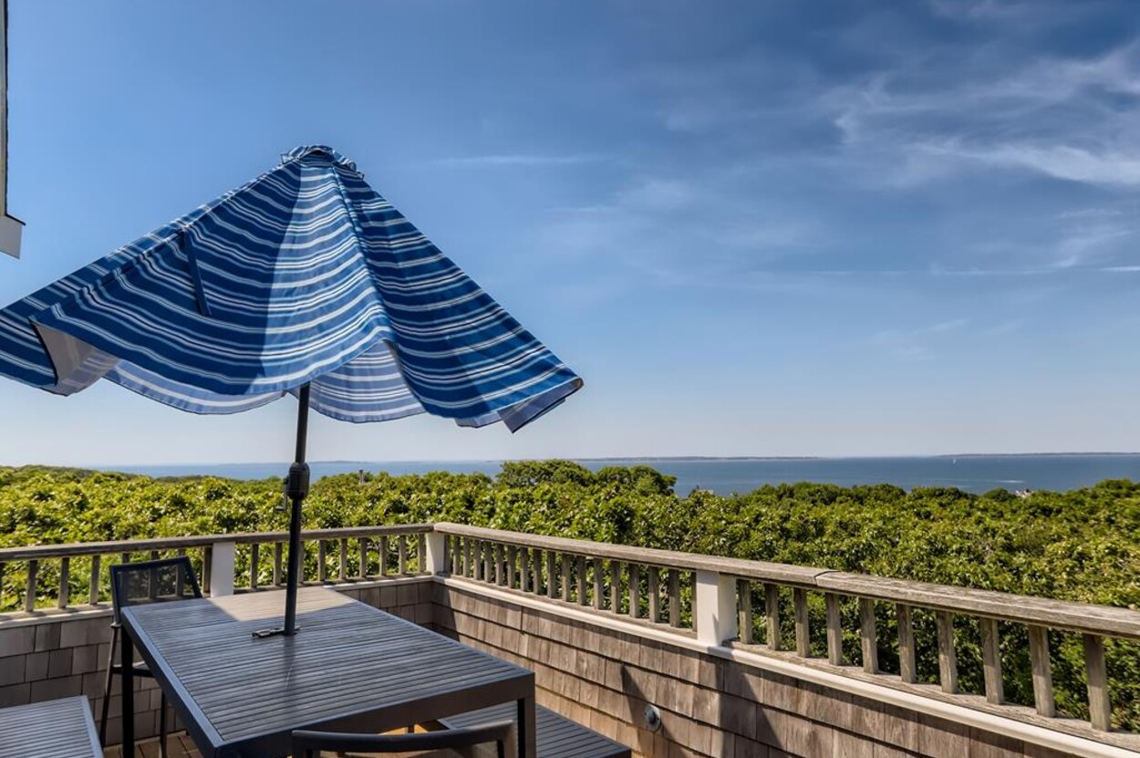 Contemporary farmhouse with panoramic views of Vineyard Sound, the Elizabeth Islands, and the Aquinnah Lighthouse. Upstairs open living/dining/kitchen area with cathedral ceilings is light and airy. Sliders out to deck to further enjoy the beautiful 180-degree views. Primary bedroom and full bath upstairs; four additional bedrooms on the first floor. A downstairs family room offers a cozy place to watch TV and a well-stocked library of books for adults and children. Additionally, there is a lovely sunroom, perfect for sipping coffee or a quiet work area away from the main activity. Home has an outdoor shower, central AC, and a wood-burning stove. 100% of electricity is supplied by solar panels. This lovely home is located at the western end of the island. It is a 10-15 minute walk to the Lighthouse and the stunning National Historic Landmark-designated red clay cliffs and south-facing ocean beach. It is a short car ride to the Menemsha bike ferry and the famous Chilmark Store, or a 35 minute drive to Vineyard Haven, Oak Bluffs, and Edgartown.