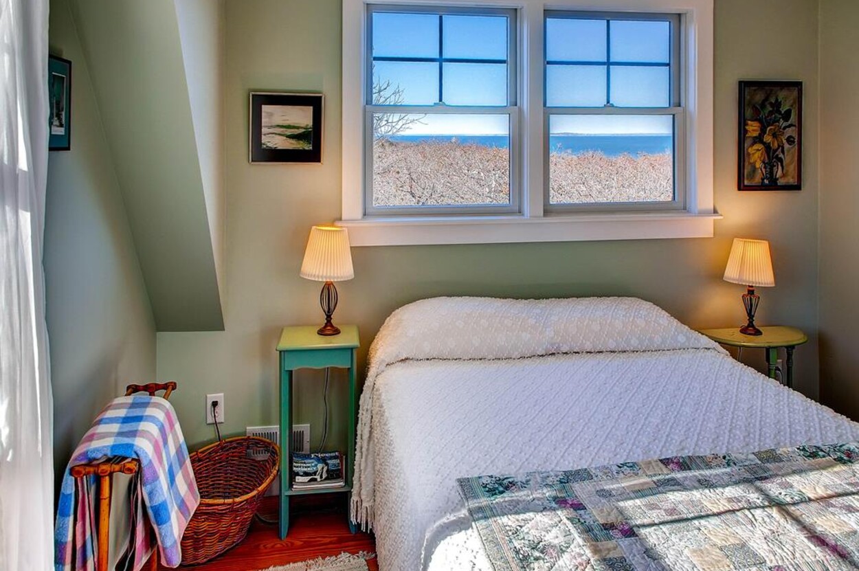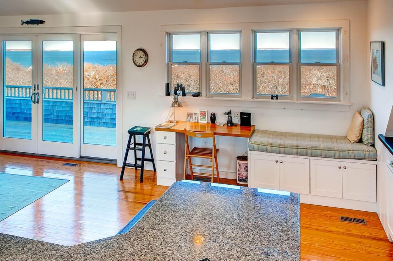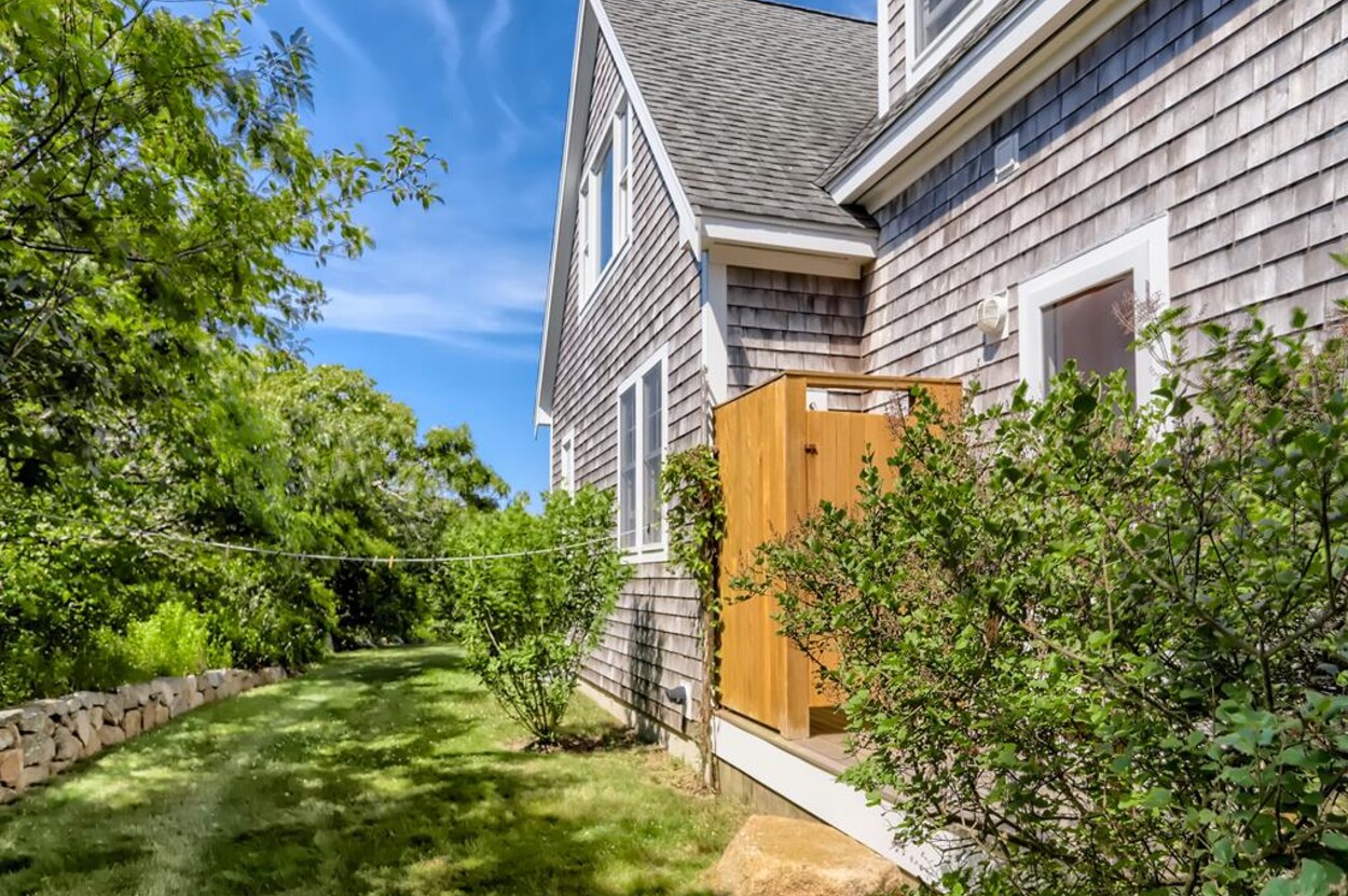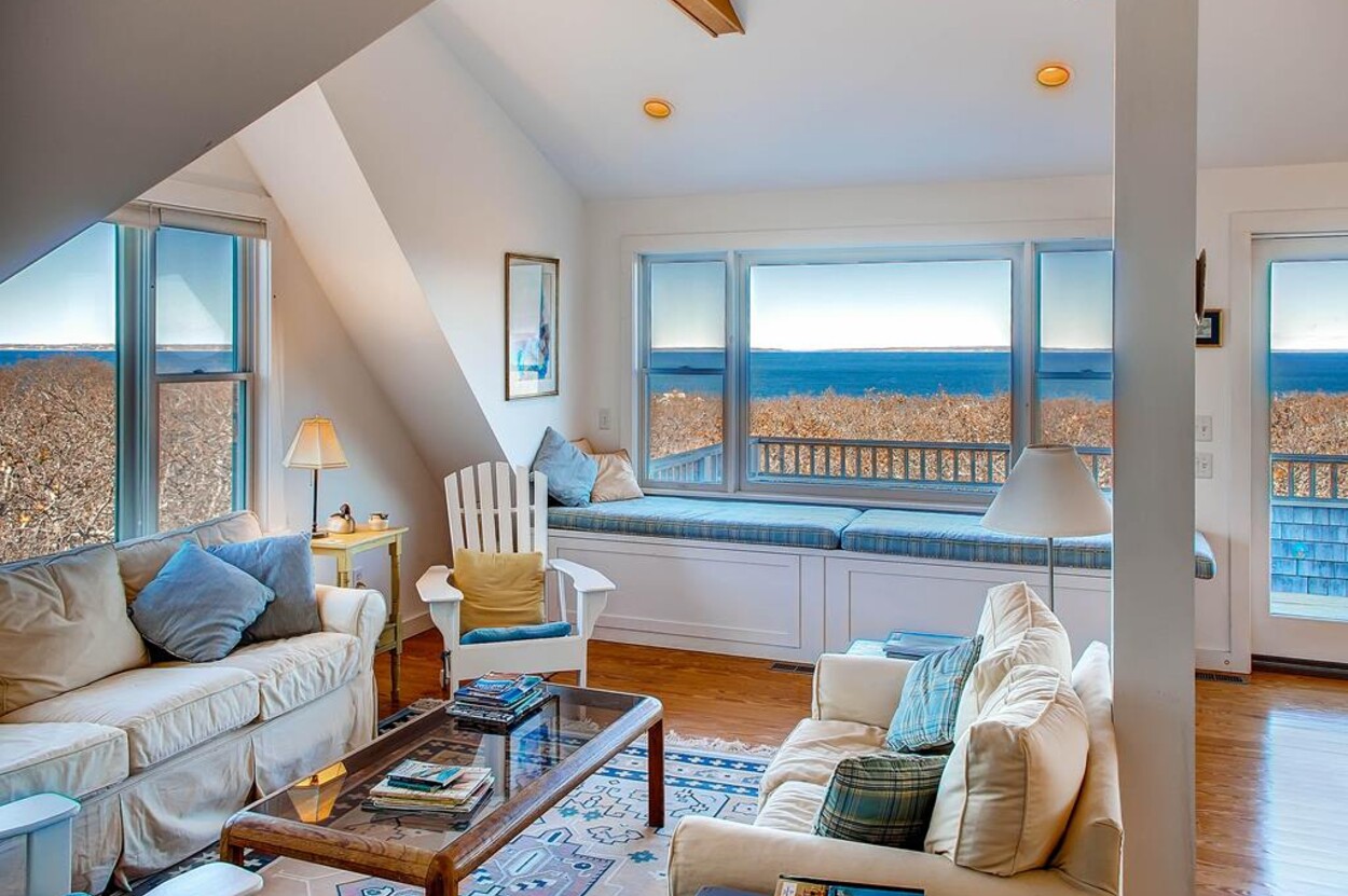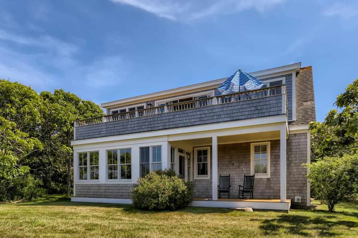 Contemporary farmhouse with panoramic views of Vineyard Sound, the Elizabeth Islands, and the Aquinnah Lighthouse. Upstairs open living/dining/kitchen area with cathedral ceilings is light and airy. Sliders out to deck to further enjoy the beautiful 180-degree views. Primary bedroom and full bath upstairs; four additional bedrooms on the first floor. A downstairs family room offers a cozy place to watch TV and a well-stocked library of books for adults and children. Additionally, there is a lovely sunroom, perfect for sipping coffee or a quiet work area away from the main activity. Home has an outdoor shower, central AC, and a wood-burning stove. 100% of electricity is supplied by solar panels. This lovely home is located at the western end of the island. It is a 10-15 minute walk to the Lighthouse and the stunning National Historic Landmark-designated red clay cliffs and south-facing ocean beach. It is a short car ride to the Menemsha bike ferry and the famous Chilmark Store, or a 35 minute drive to Vineyard Haven, Oak Bluffs, and Edgartown.