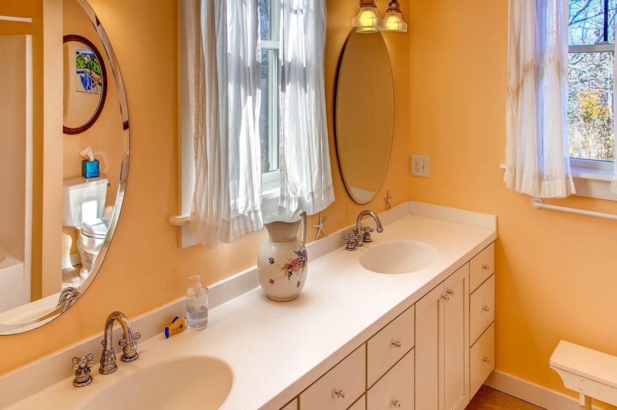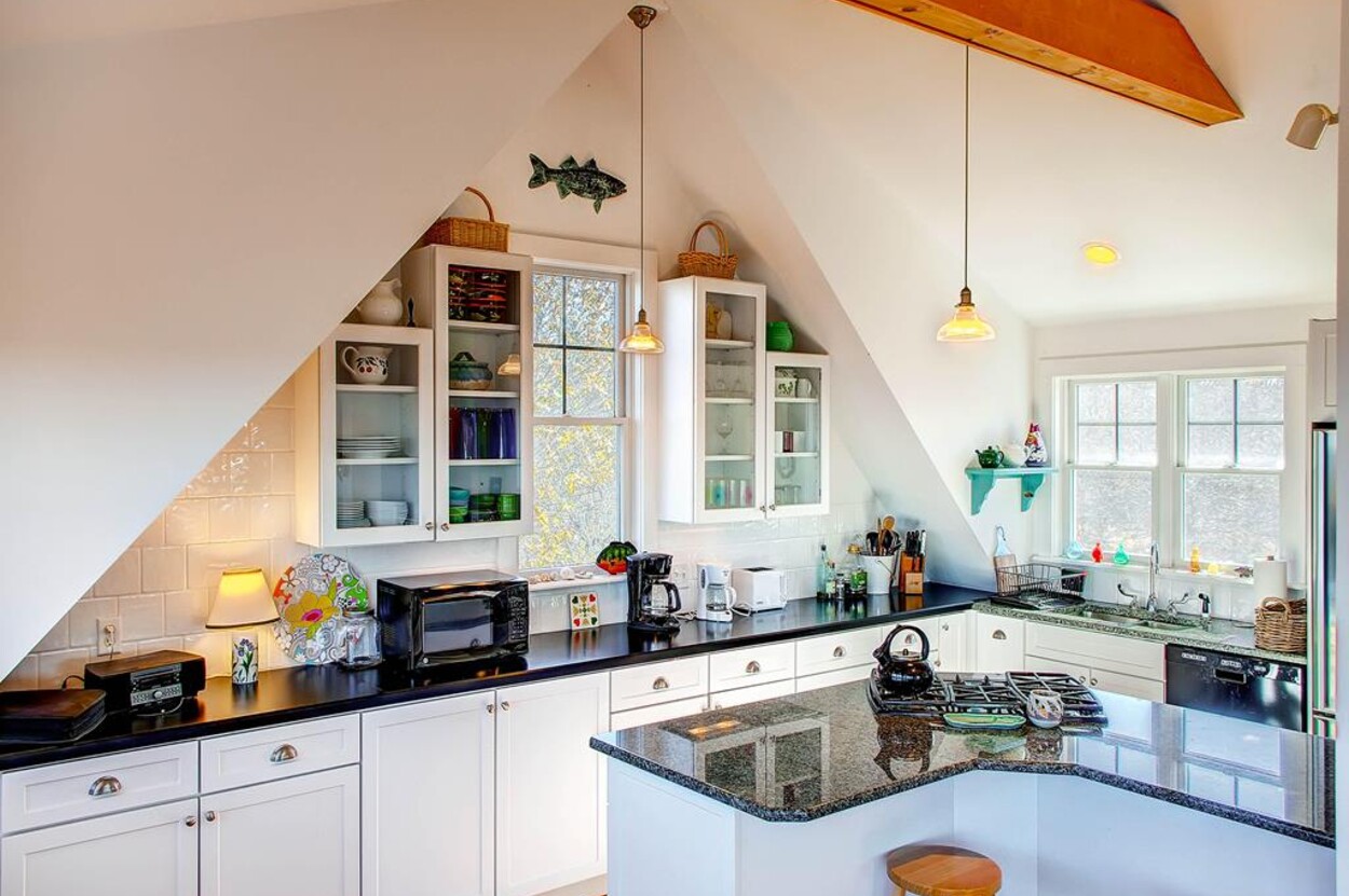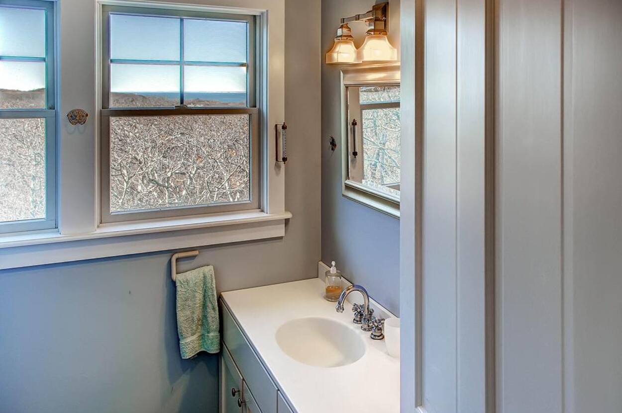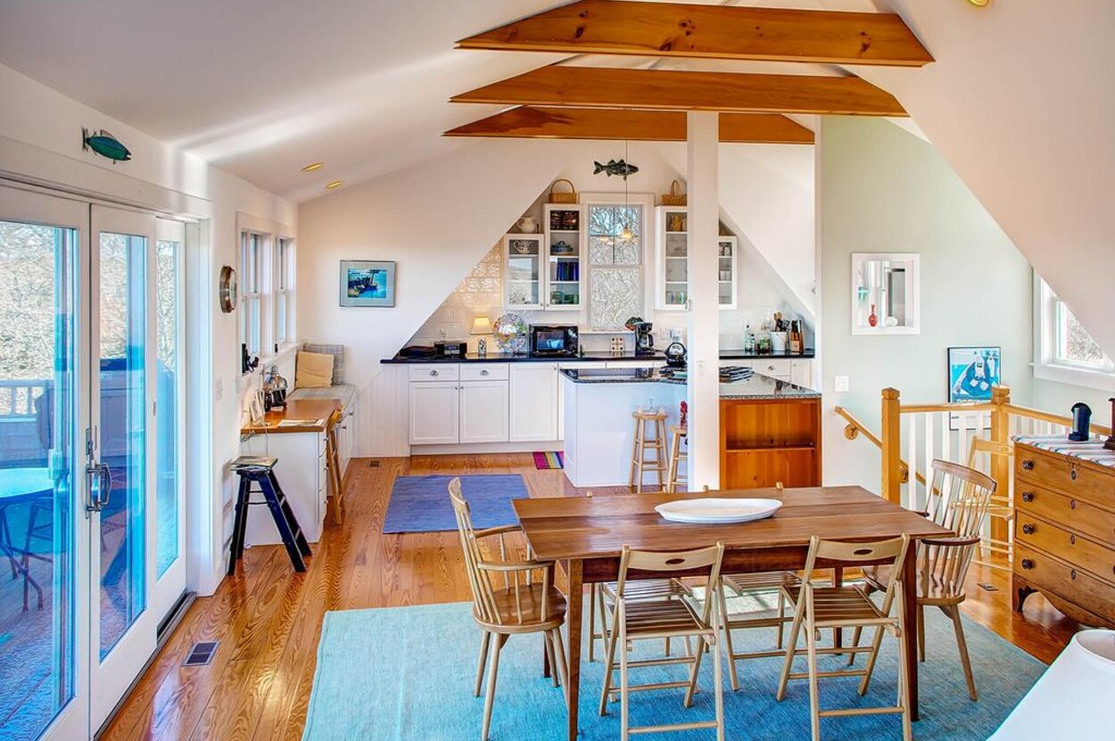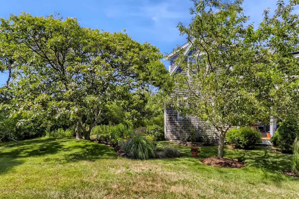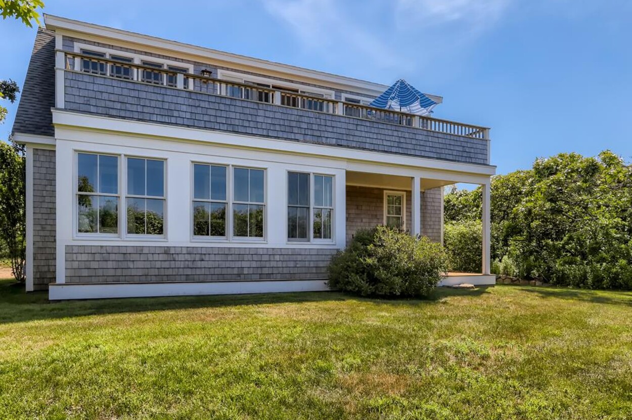 Contemporary farmhouse with panoramic views of Vineyard Sound, the Elizabeth Islands, and the Aquinnah Lighthouse. Upstairs open living/dining/kitchen area with cathedral ceilings is light and airy. Sliders out to deck to further enjoy the beautiful 180-degree views. Primary bedroom and full bath upstairs; four additional bedrooms on the first floor. A downstairs family room offers a cozy place to watch TV and a well-stocked library of books for adults and children. Additionally, there is a lovely sunroom, perfect for sipping coffee or a quiet work area away from the main activity. Home has an outdoor shower, central AC, and a wood-burning stove. 100% of electricity is supplied by solar panels. This lovely home is located at the western end of the island. It is a 10-15 minute walk to the Lighthouse and the stunning National Historic Landmark-designated red clay cliffs and south-facing ocean beach. It is a short car ride to the Menemsha bike ferry and the famous Chilmark Store, or a 35 minute drive to Vineyard Haven, Oak Bluffs, and Edgartown.