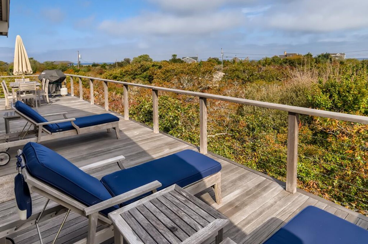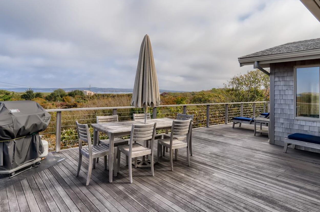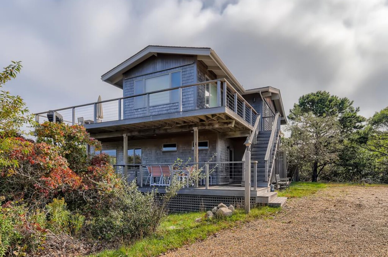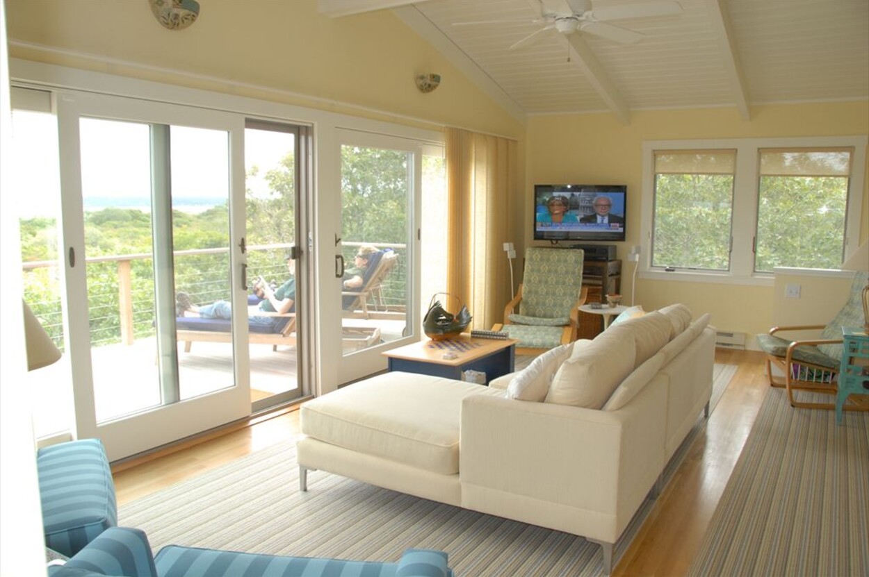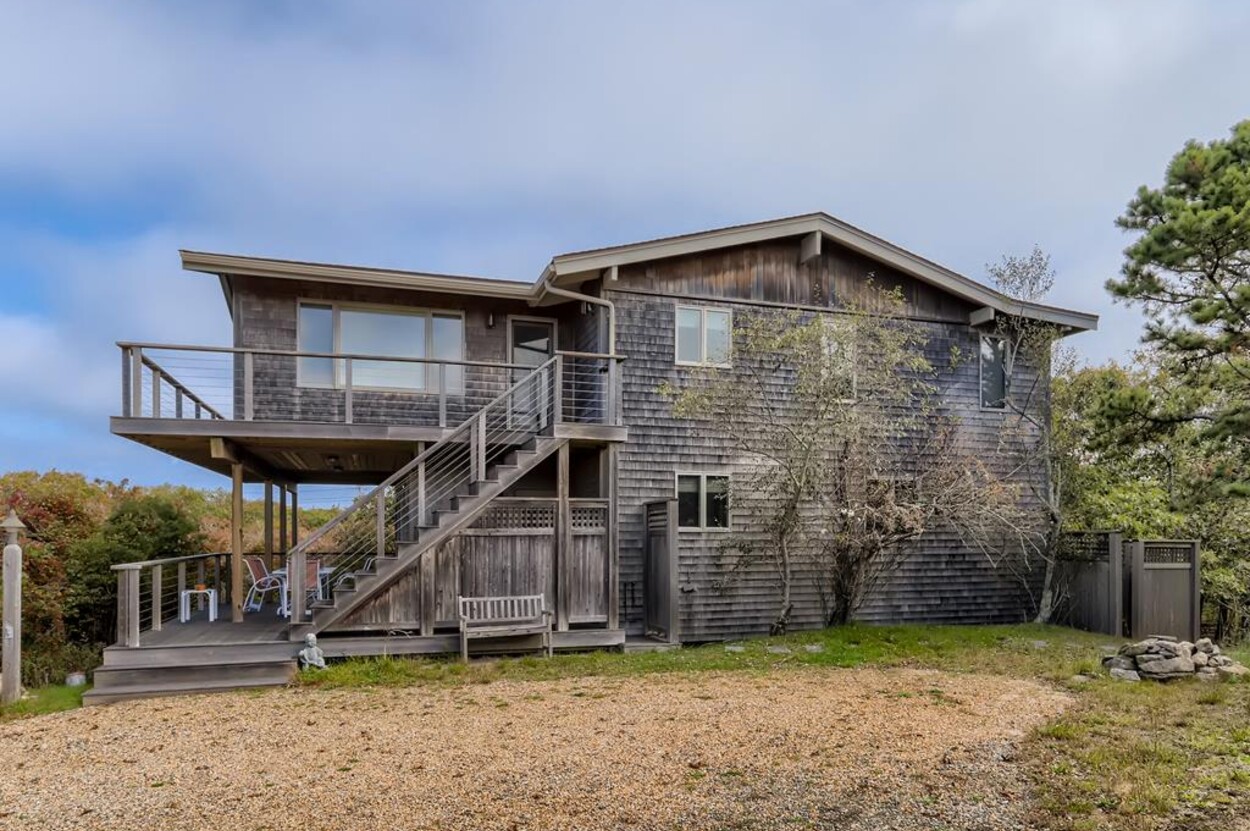 This beach cottage in the dunes off Dog Fish Bar offers waterviews and short walk across the quiet sandy road to the beach. Plus private ocean beach access and Aquinnah town beaches. The upside-down floor plan allows for bright open living area, kitchen and dining on the upper level, all opening to an expansive deck overlooking the Vineyard Sound. The primary bedroom and bathroom is upstairs as well plus two bedroom, office, bathroom and mud room downstairs. House is fully air conditioned. Casual comfortable house in a tranquil beach setting.