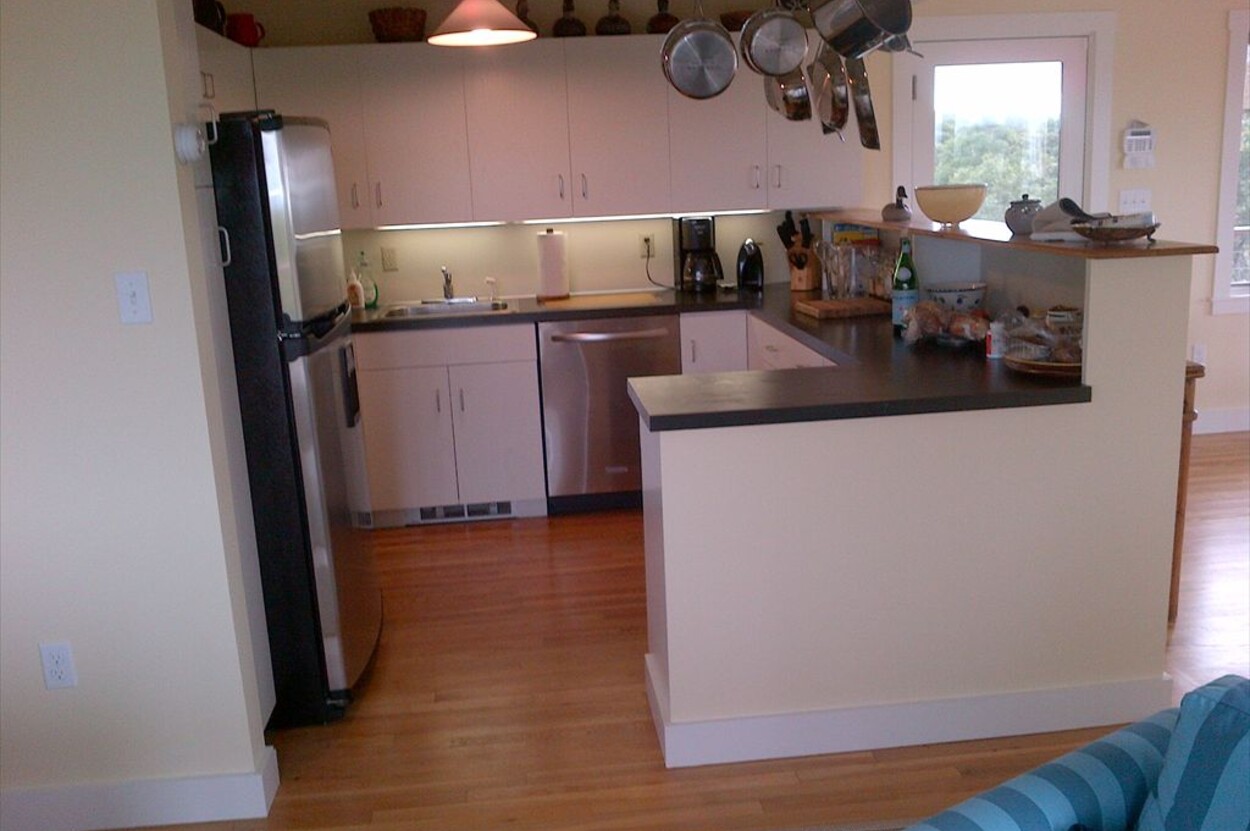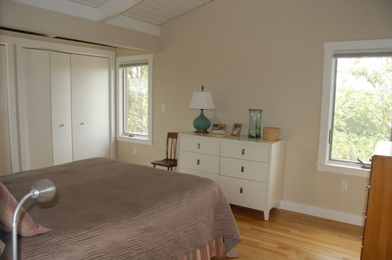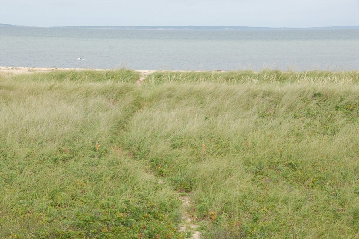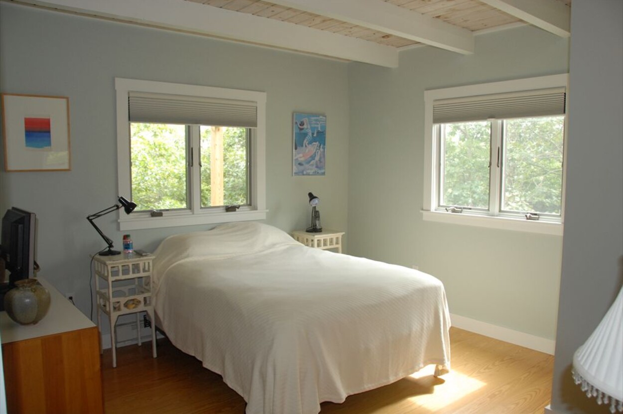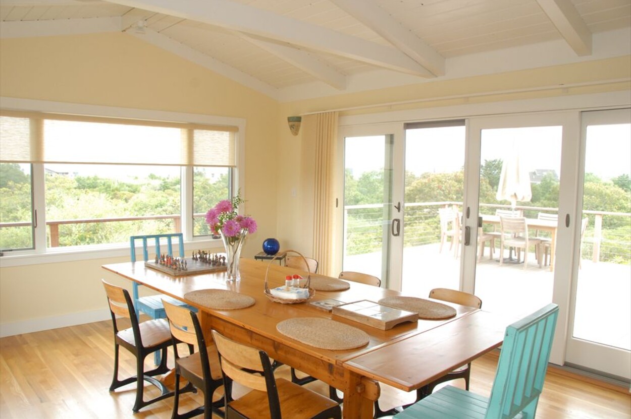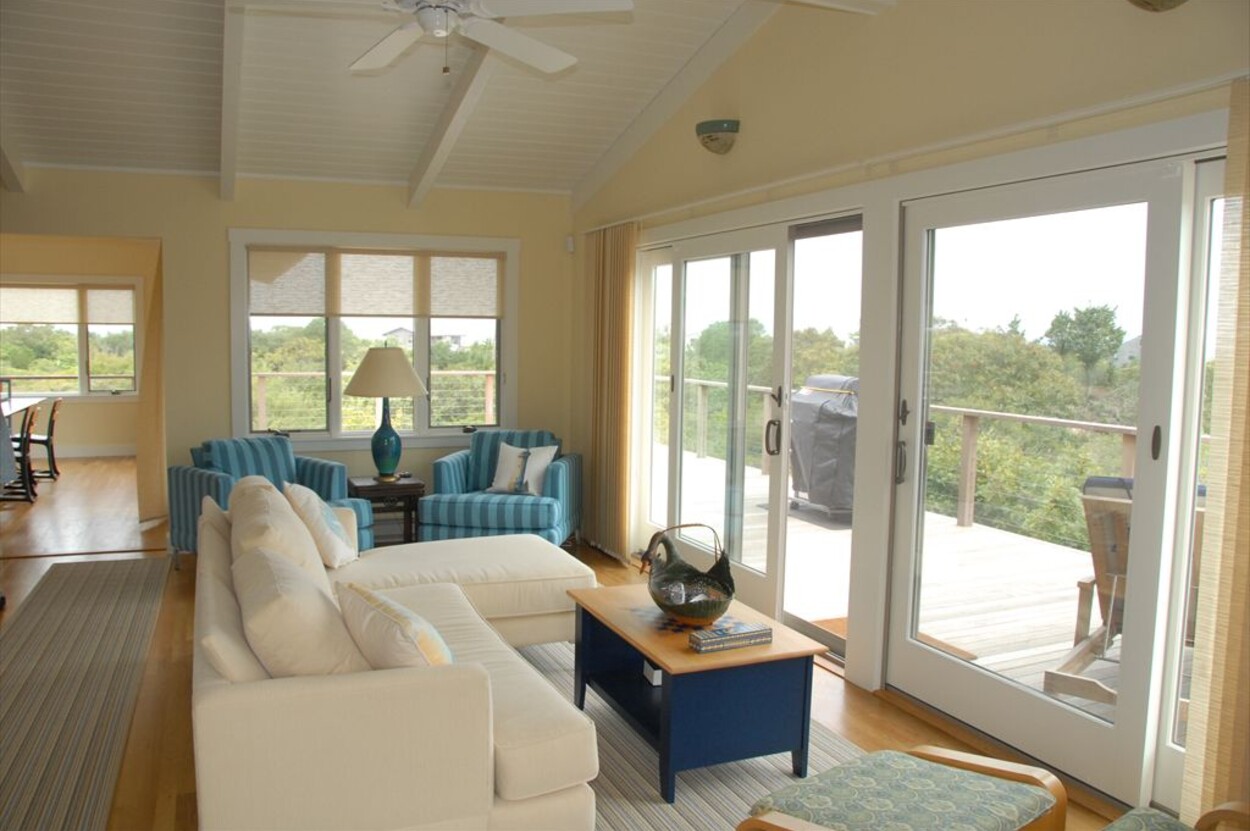 This beach cottage in the dunes off Dog Fish Bar offers waterviews and short walk across the quiet sandy road to the beach. Plus private ocean beach access and Aquinnah town beaches. The upside-down floor plan allows for bright open living area, kitchen and dining on the upper level, all opening to an expansive deck overlooking the Vineyard Sound. The primary bedroom and bathroom is upstairs as well plus two bedroom, office, bathroom and mud room downstairs. House is fully air conditioned. Casual comfortable house in a tranquil beach setting.