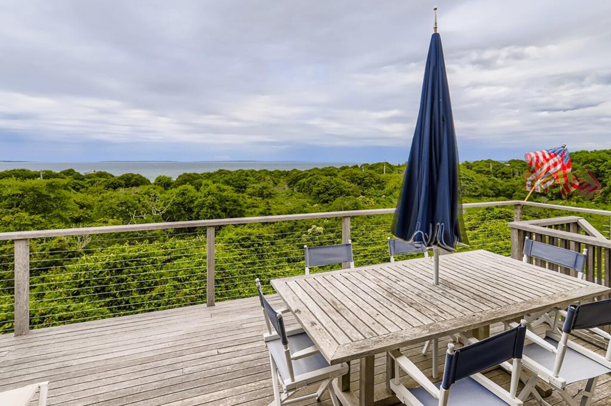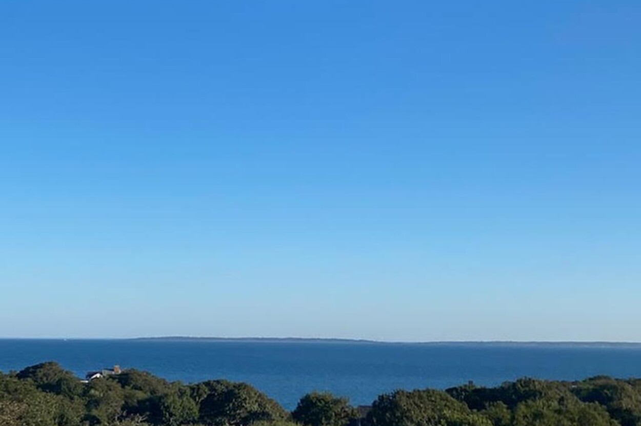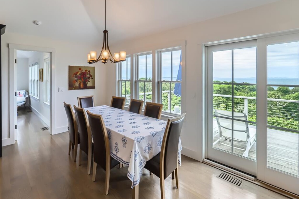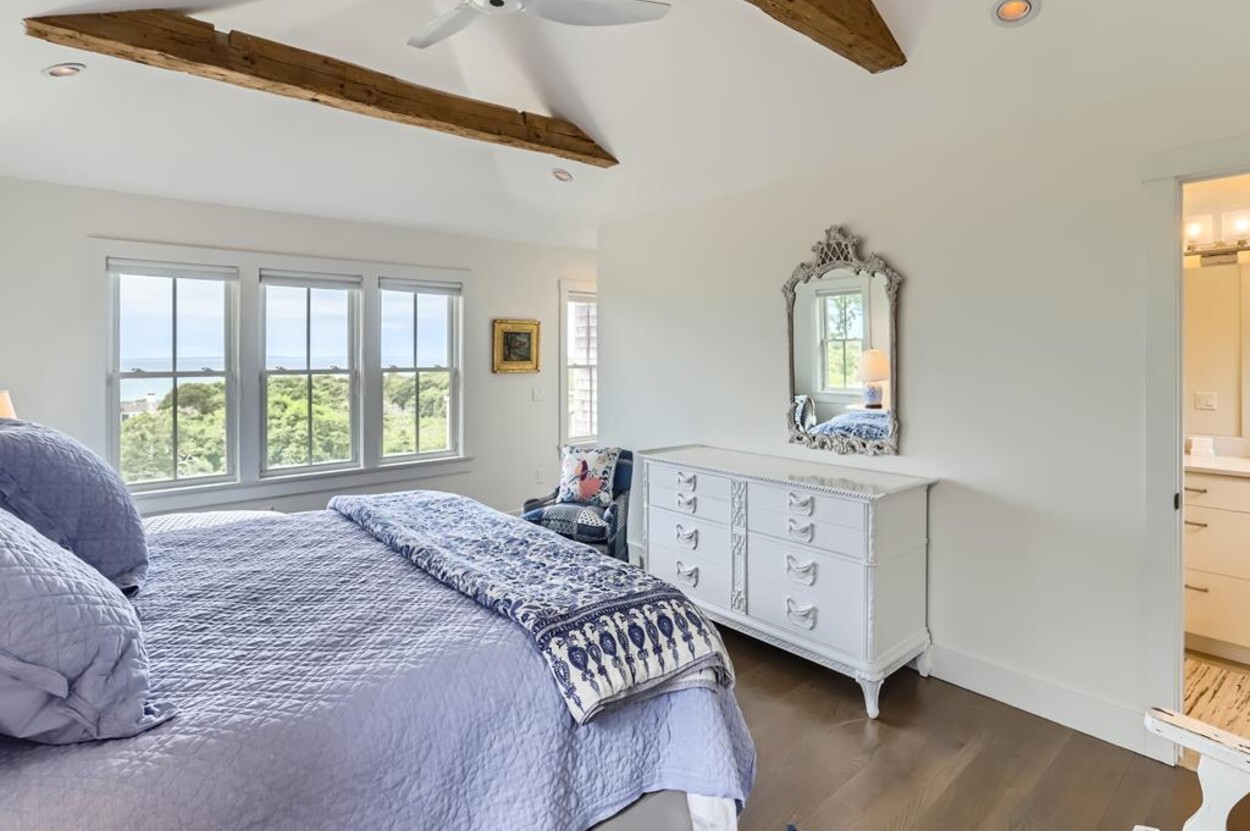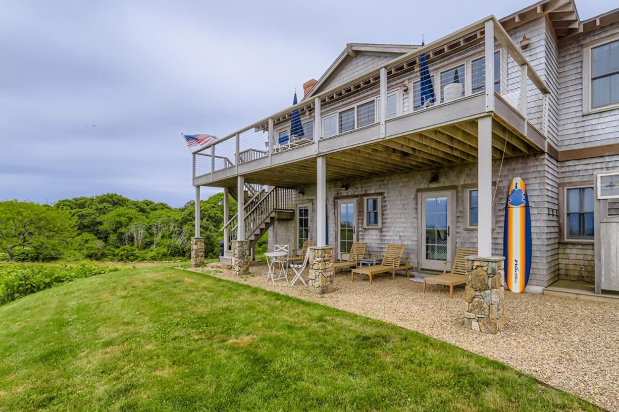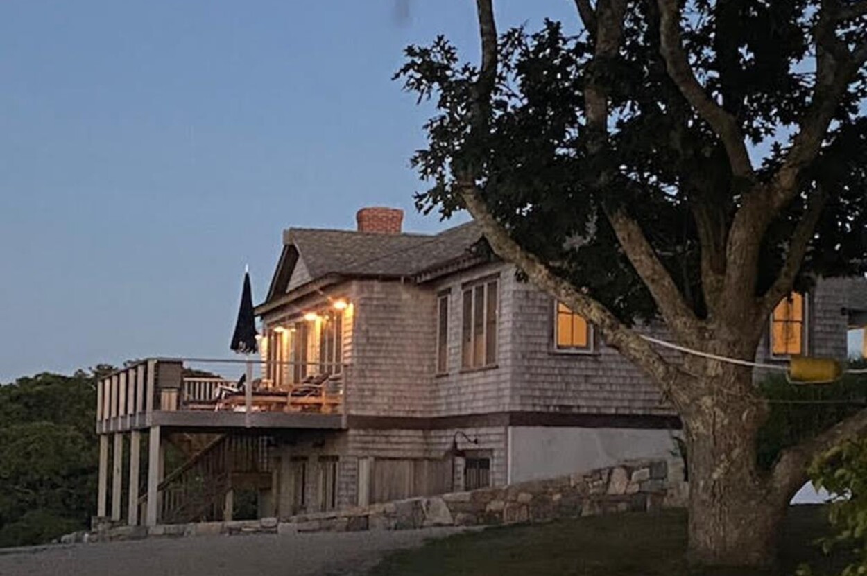 Set atop a hill this beautifully designed modern home has amazing views over the Elizabeth Islands and Sound. Comfortable and bright open concept main level consists of a fully equipped kitchen, stylish living room, dining room and powder room. The en suite primary bedroom completes the main level. Downstairs there is a second entertainment room, a bedroom with an en suite bath and two more bedrooms share a full bath. Walk out the doors to enjoy views from the Adirondack chairs on the patio. Spectacular views and sunsets from almost every room in this thoughtfully updated home. Bike to town beaches. No pets please.