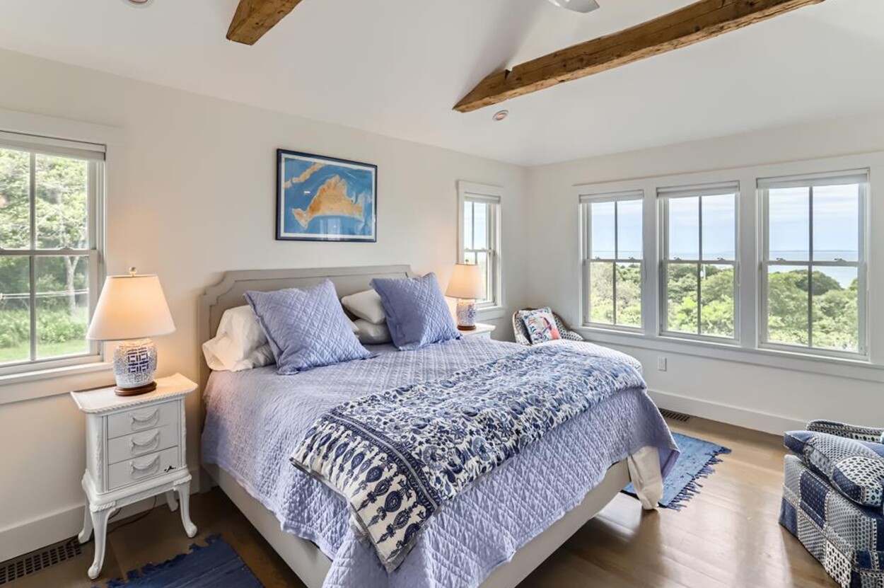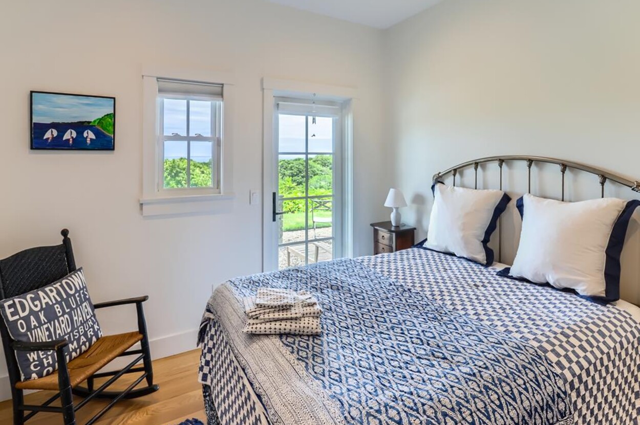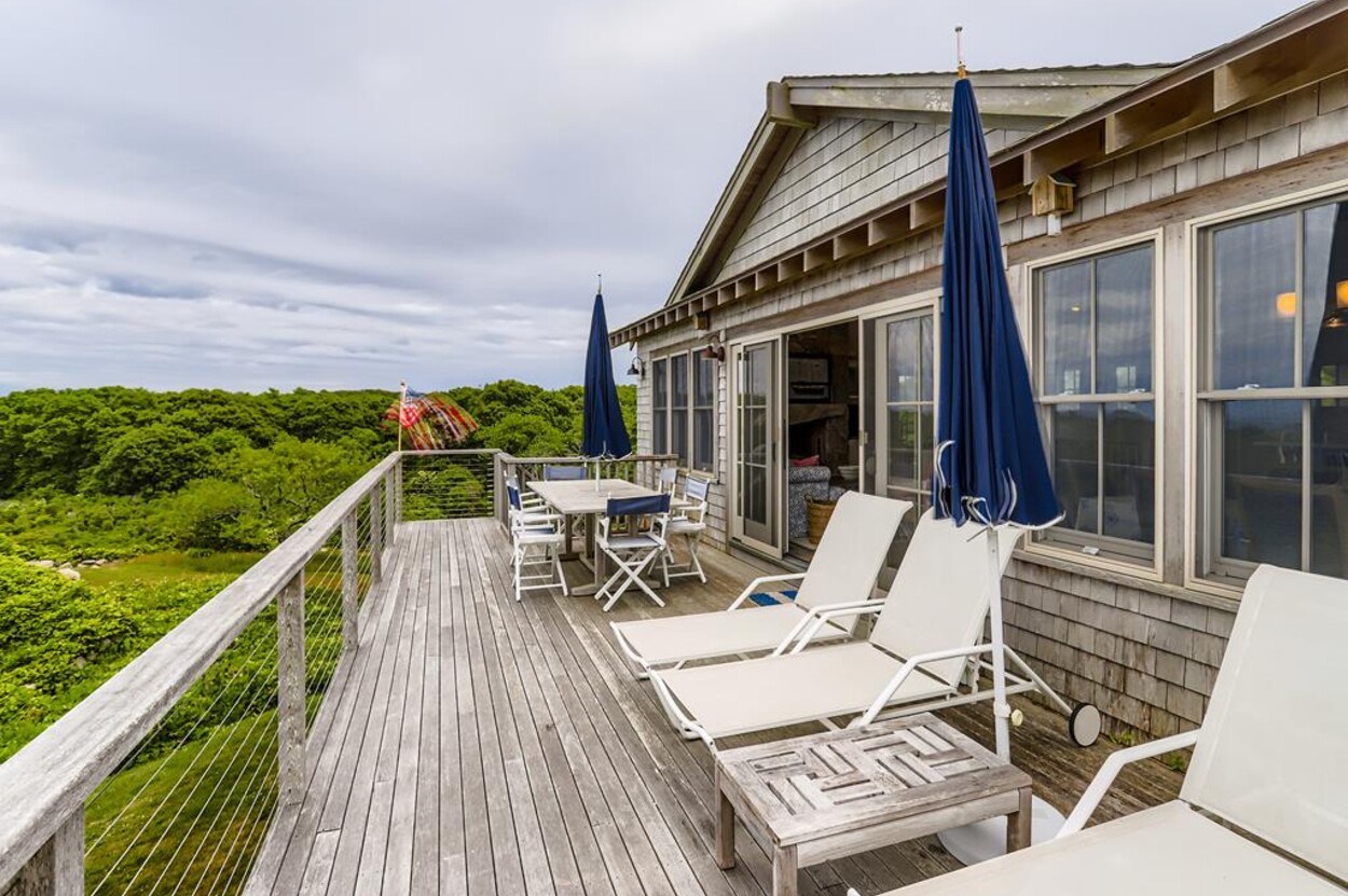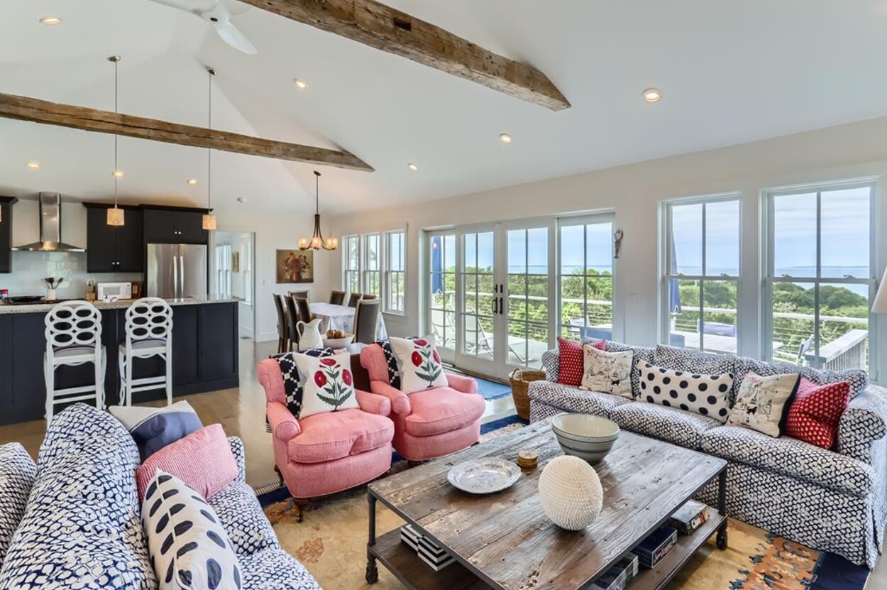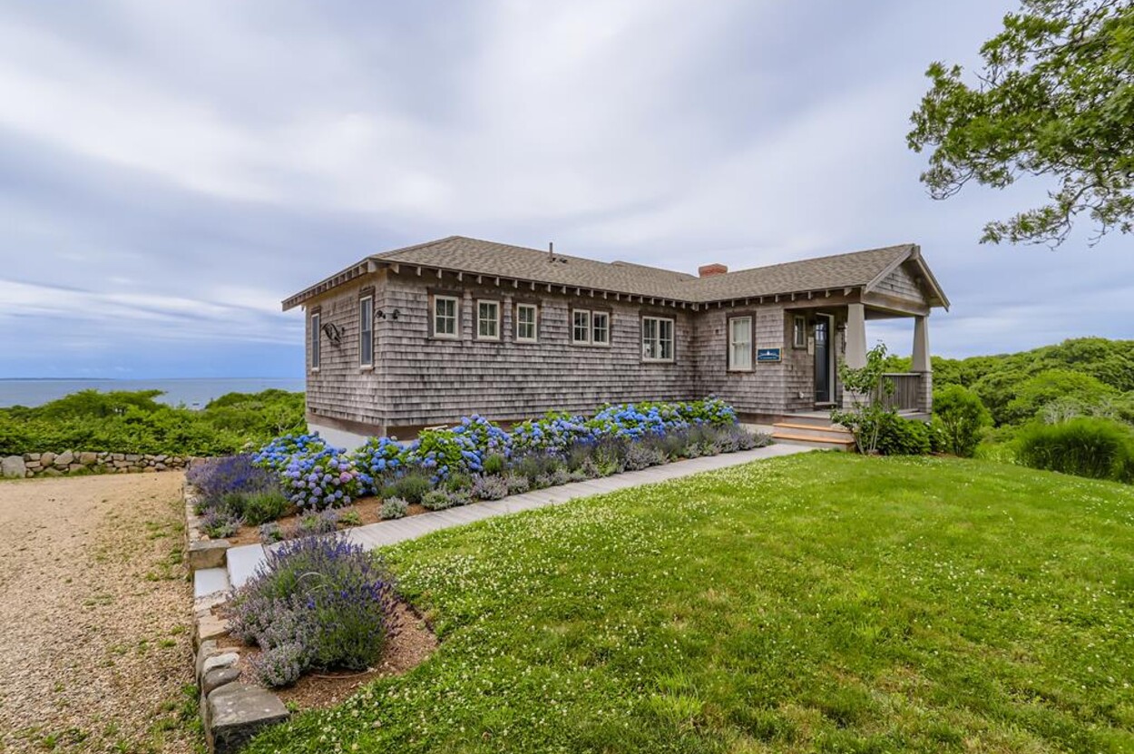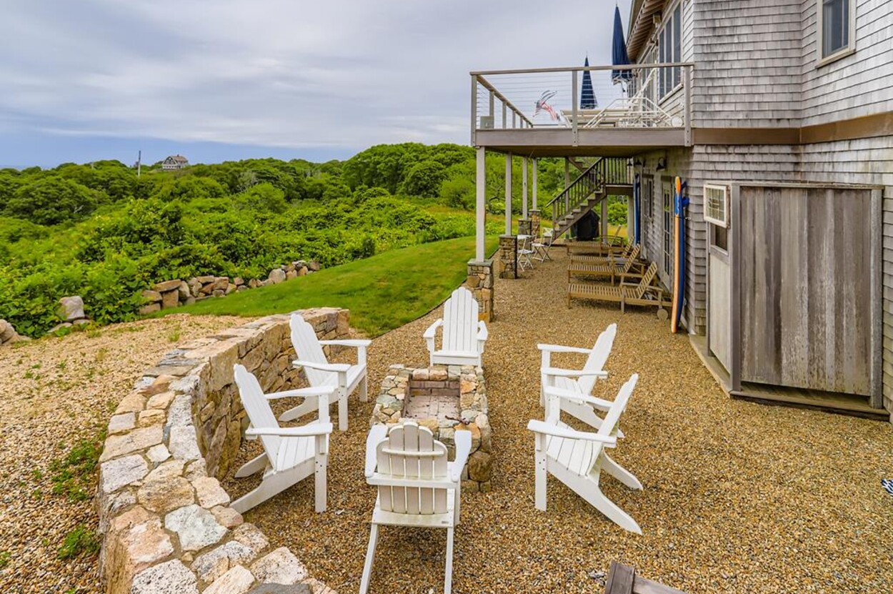 Set atop a hill this beautifully designed modern home has amazing views over the Elizabeth Islands and Sound. Comfortable and bright open concept main level consists of a fully equipped kitchen, stylish living room, dining room and powder room. The en suite primary bedroom completes the main level. Downstairs there is a second entertainment room, a bedroom with an en suite bath and two more bedrooms share a full bath. Walk out the doors to enjoy views from the Adirondack chairs on the patio. Spectacular views and sunsets from almost every room in this thoughtfully updated home. Bike to town beaches. No pets please.