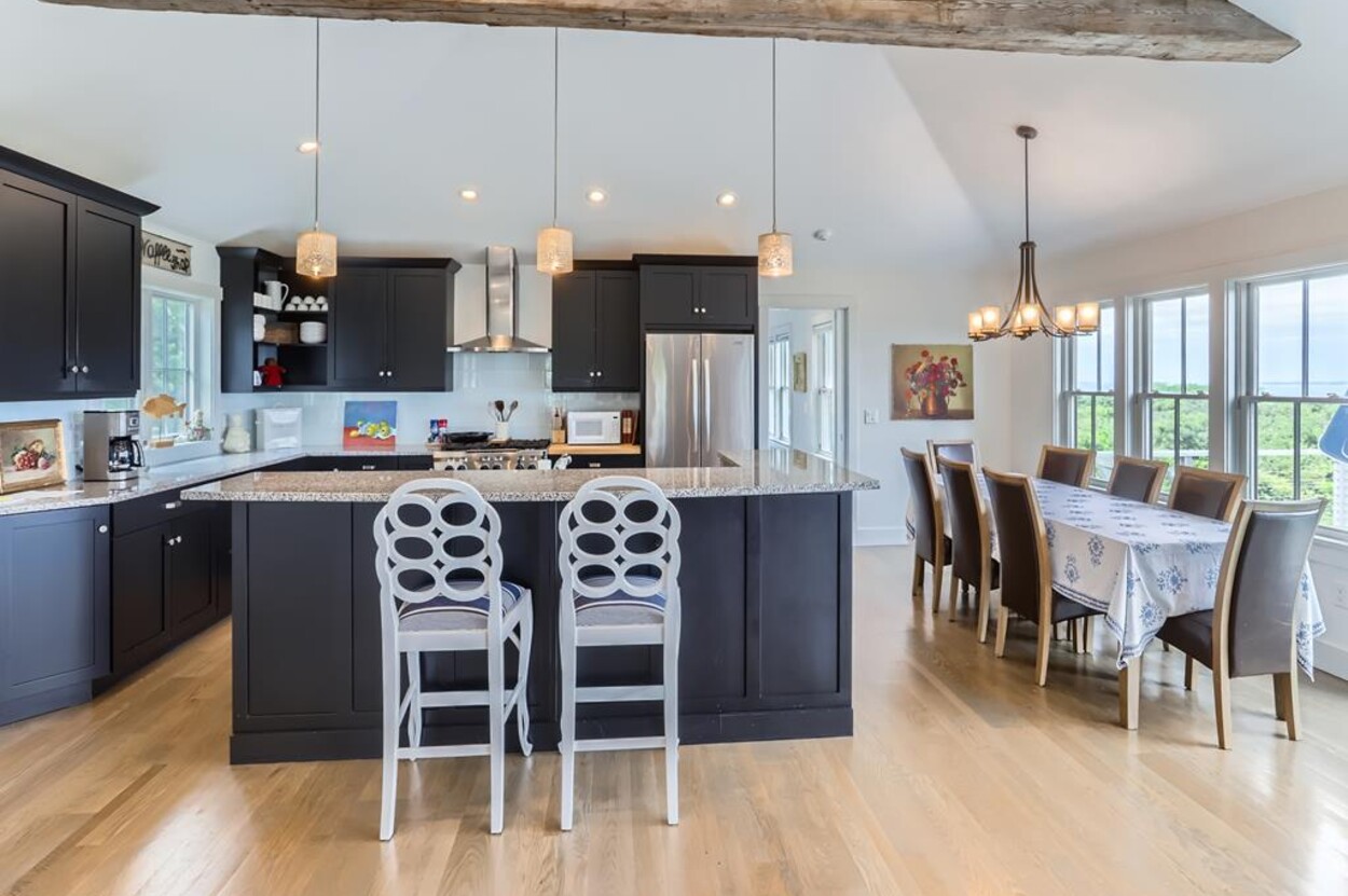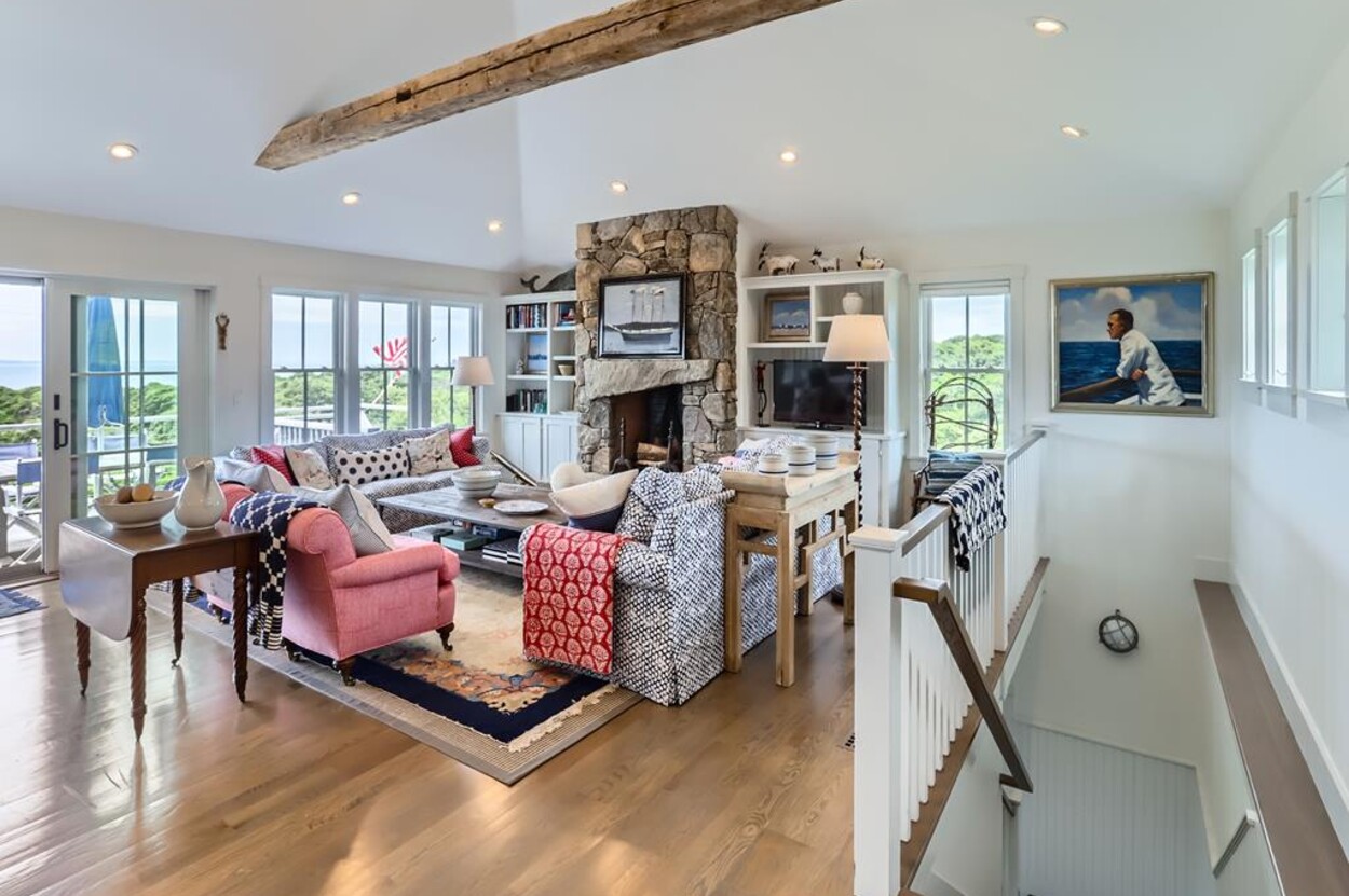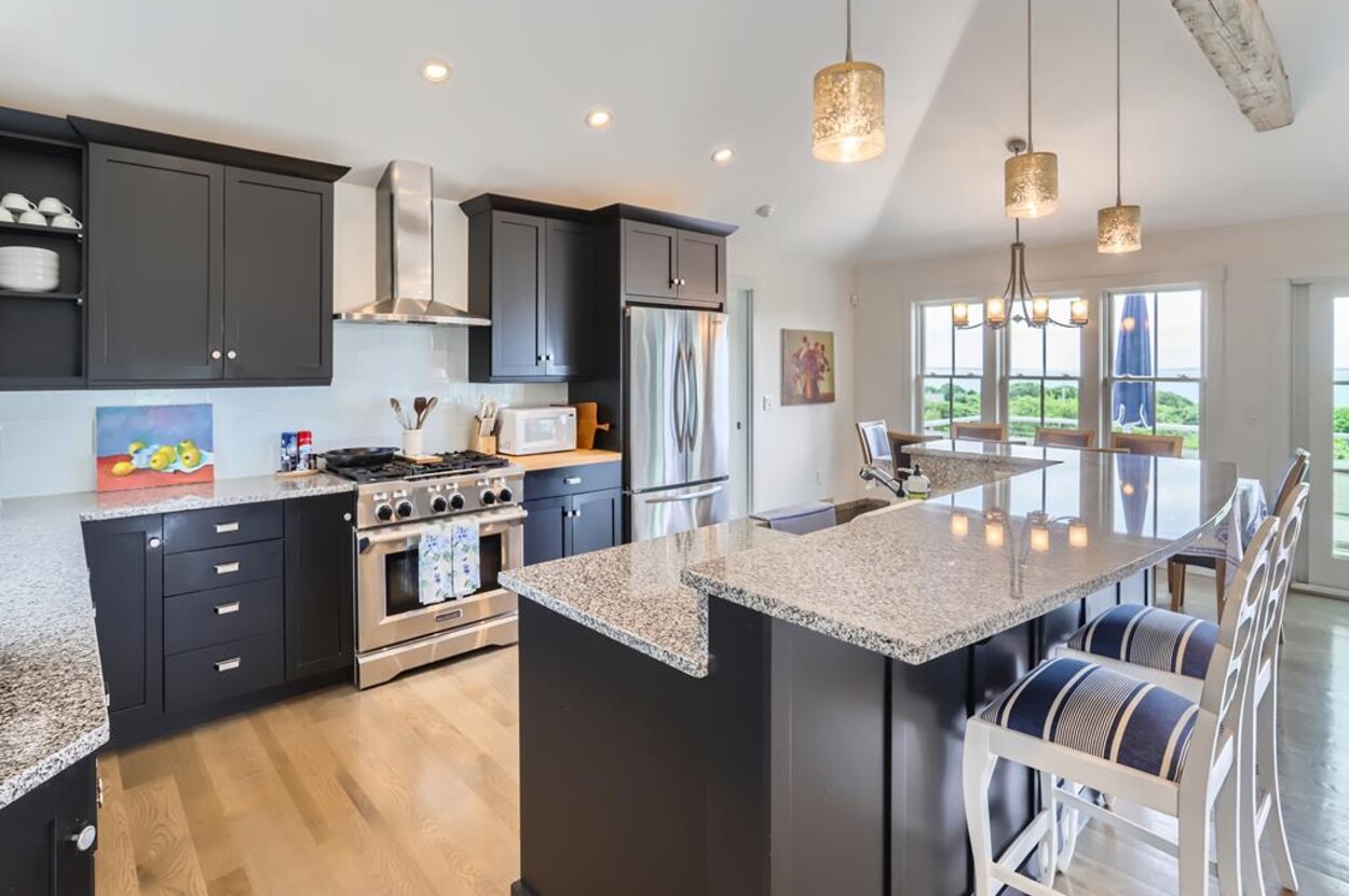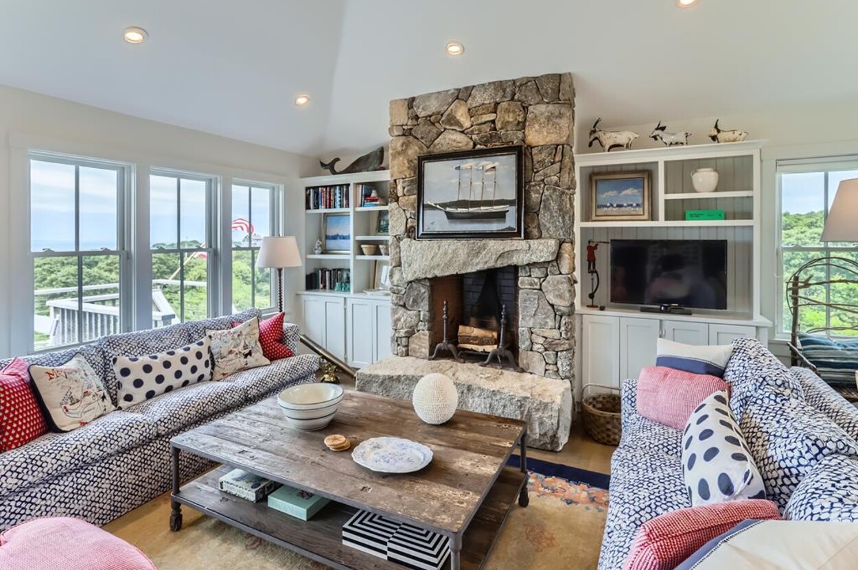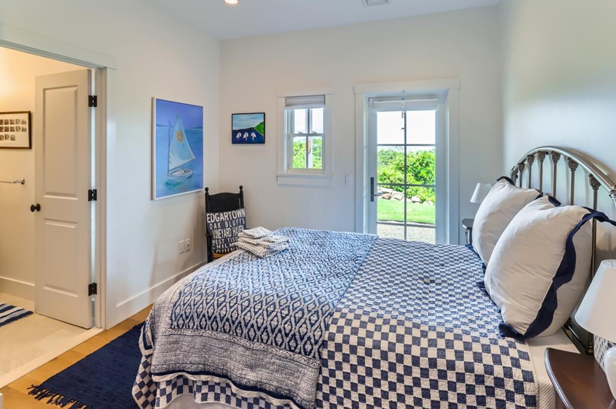 Set atop a hill this beautifully designed modern home has amazing views over the Elizabeth Islands and Sound. Comfortable and bright open concept main level consists of a fully equipped kitchen, stylish living room, dining room and powder room. The en suite primary bedroom completes the main level. Downstairs there is a second entertainment room, a bedroom with an en suite bath and two more bedrooms share a full bath. Walk out the doors to enjoy views from the Adirondack chairs on the patio. Spectacular views and sunsets from almost every room in this thoughtfully updated home. Bike to town beaches. No pets please.