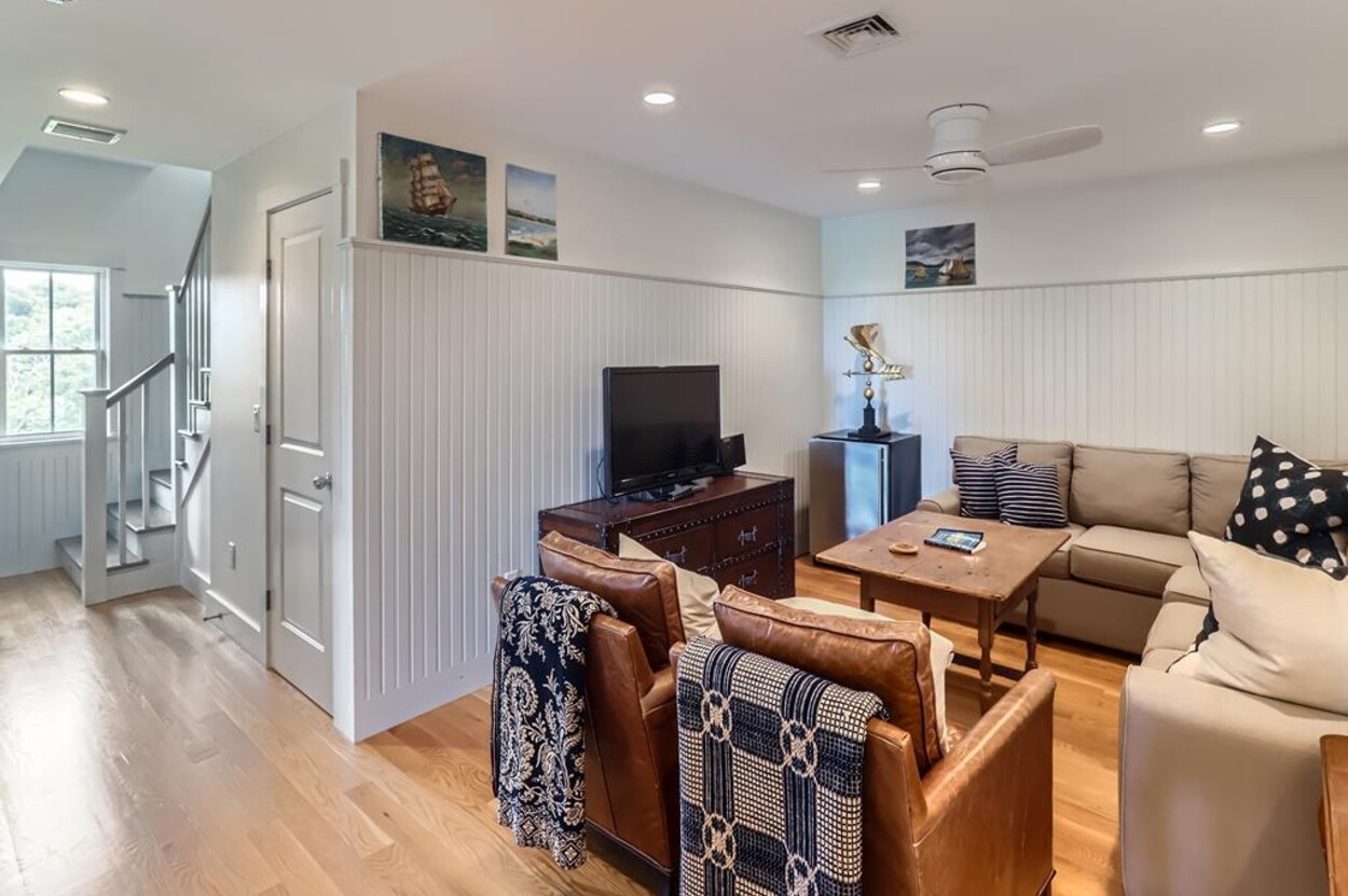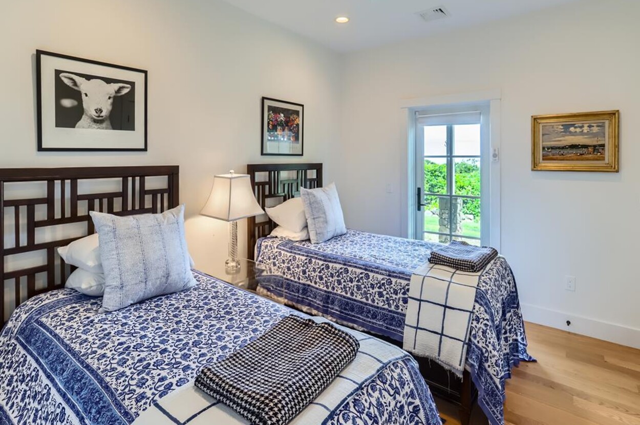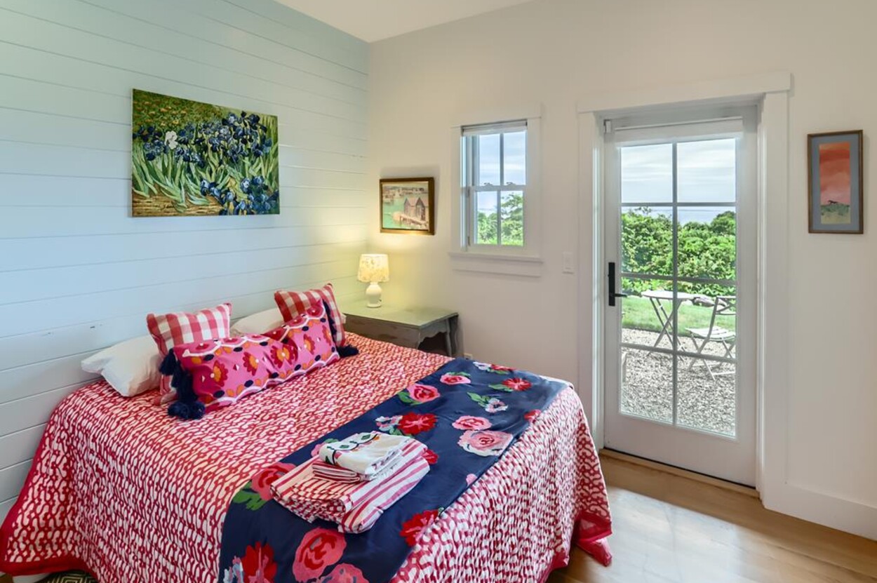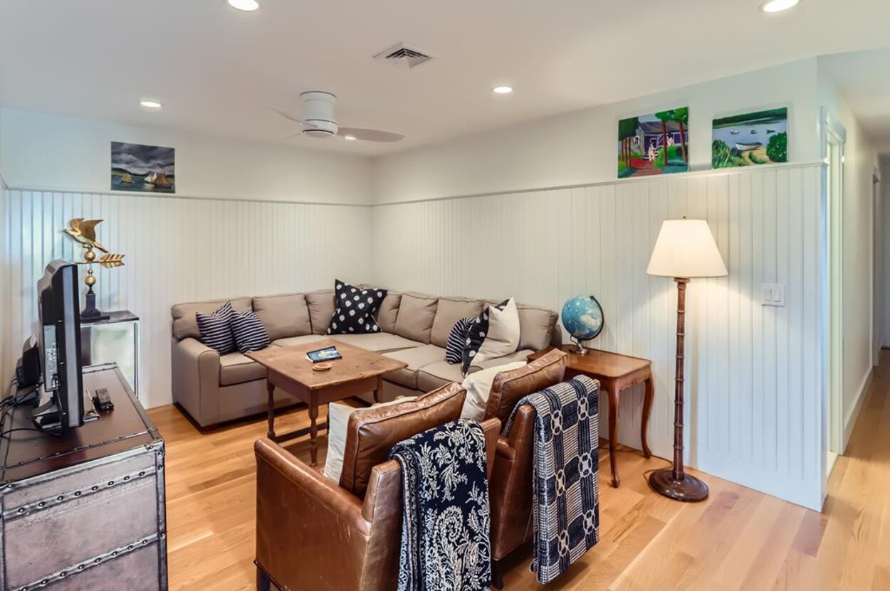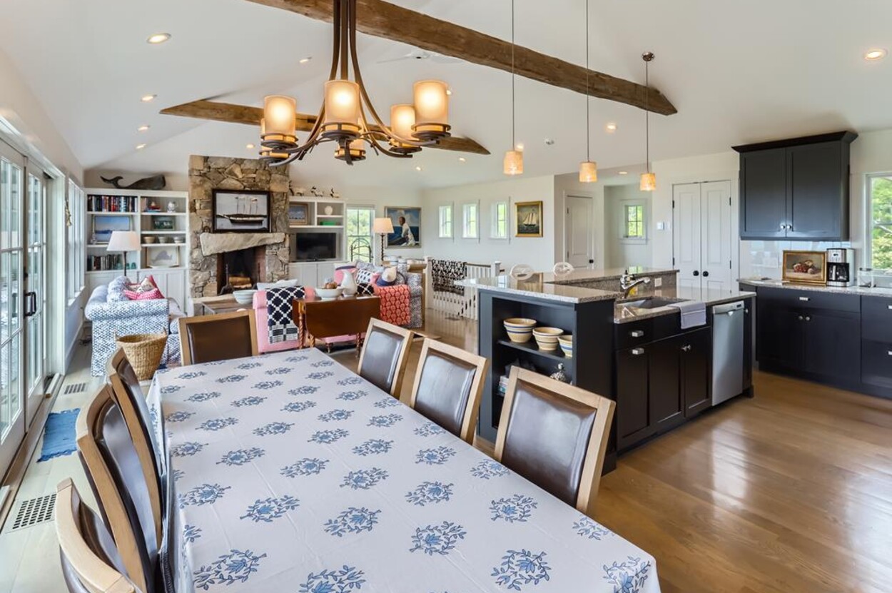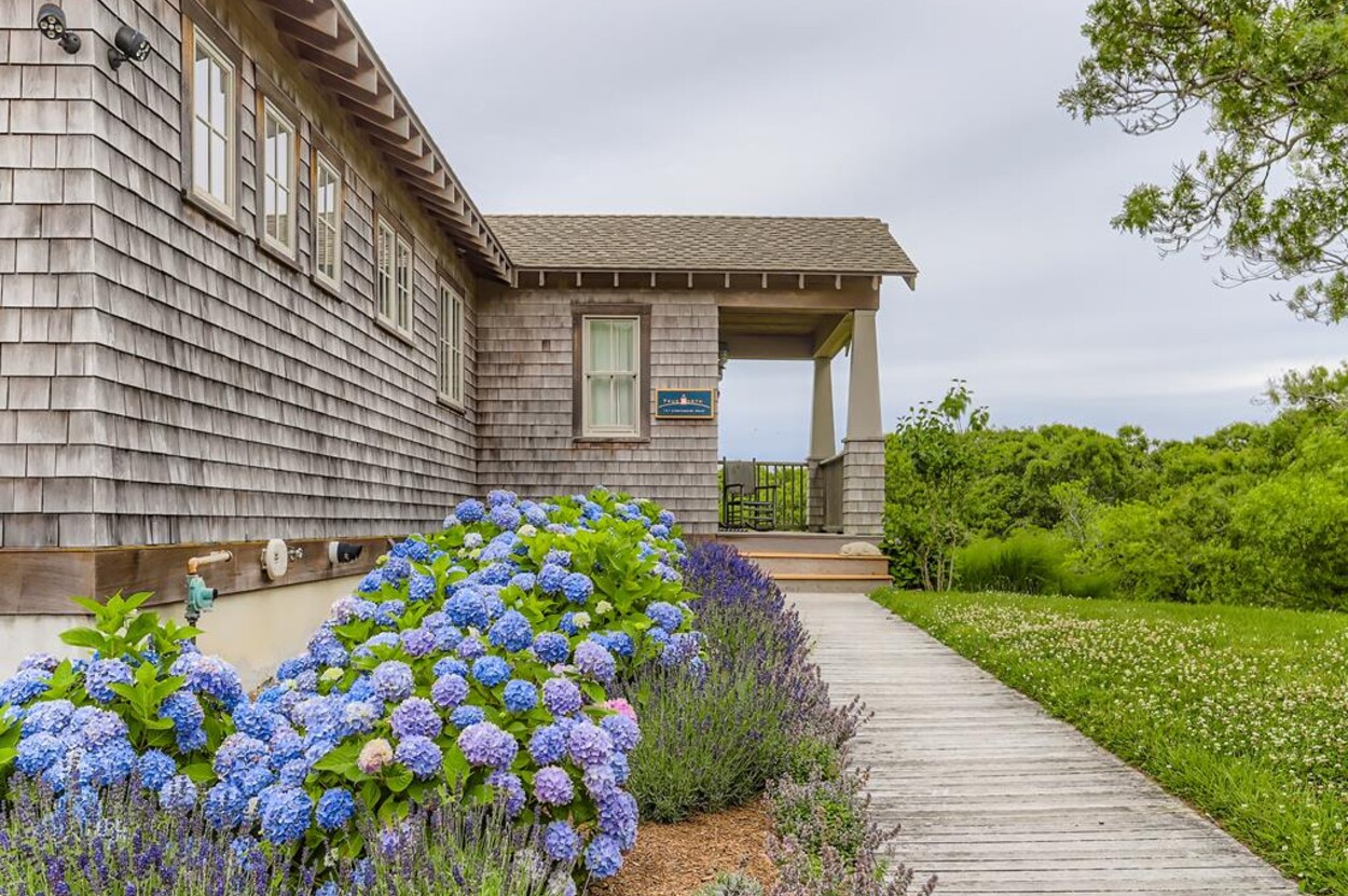 Set atop a hill this beautifully designed modern home has amazing views over the Elizabeth Islands and Sound. Comfortable and bright open concept main level consists of a fully equipped kitchen, stylish living room, dining room and powder room. The en suite primary bedroom completes the main level. Downstairs there is a second entertainment room, a bedroom with an en suite bath and two more bedrooms share a full bath. Walk out the doors to enjoy views from the Adirondack chairs on the patio. Spectacular views and sunsets from almost every room in this thoughtfully updated home. Bike to town beaches. No pets please.