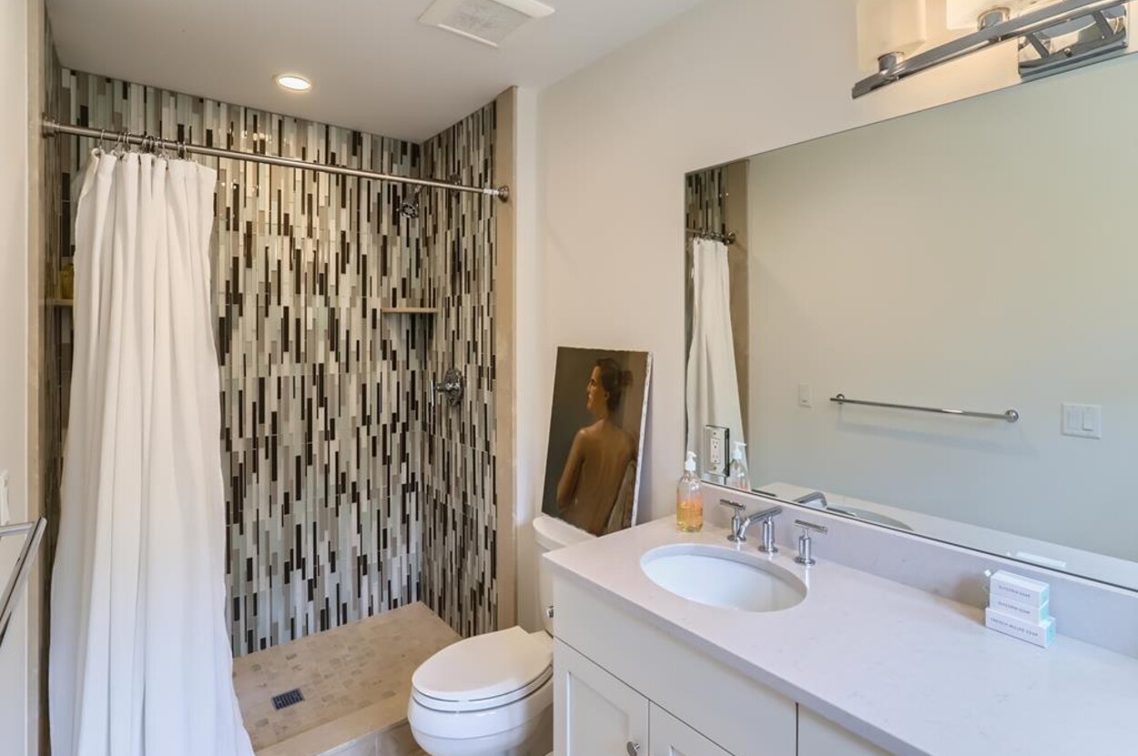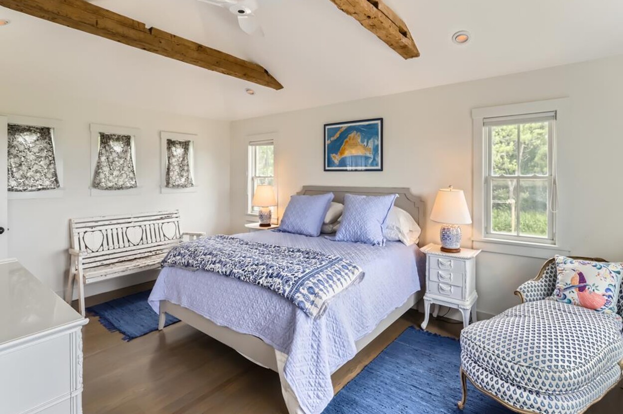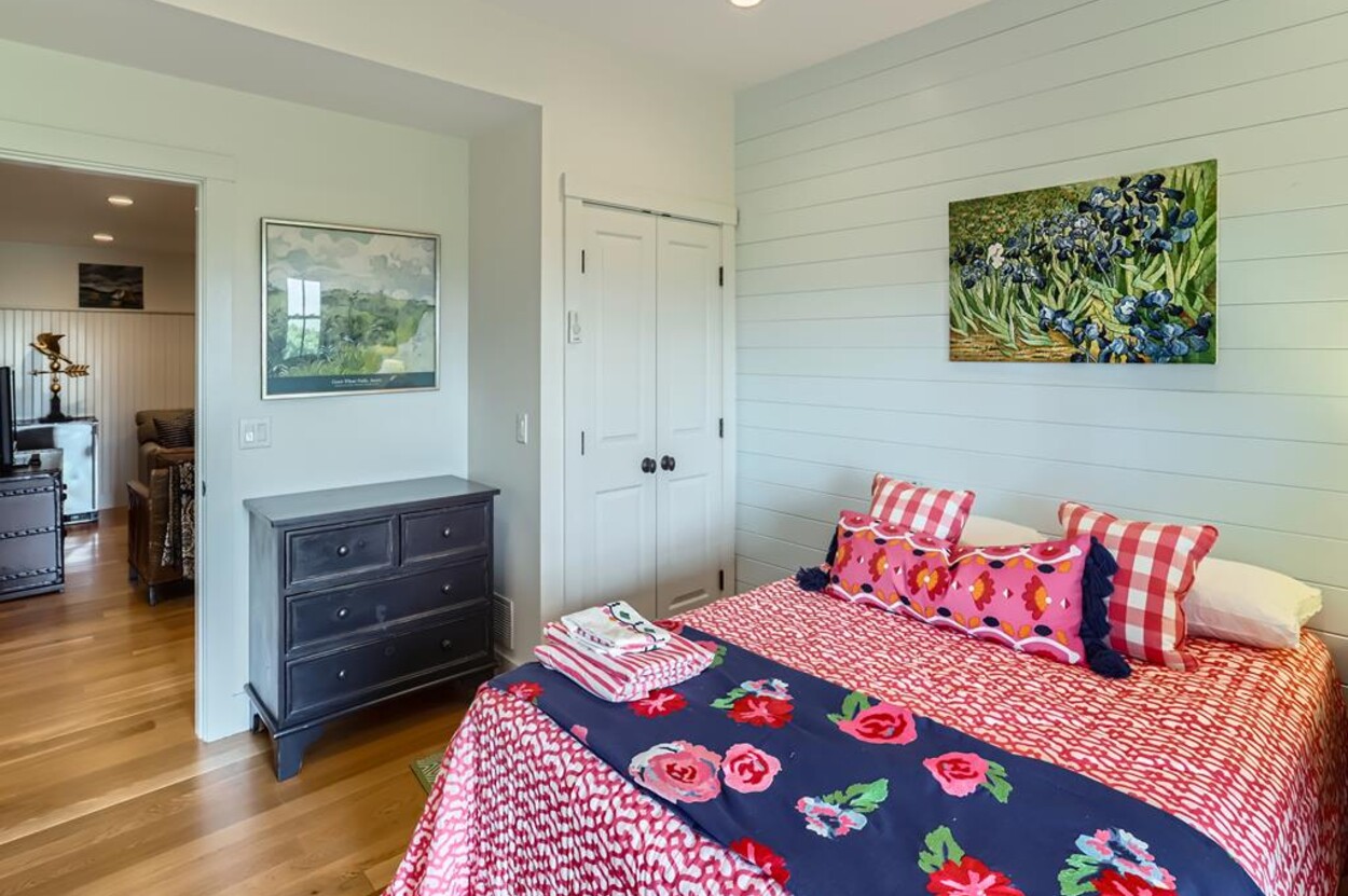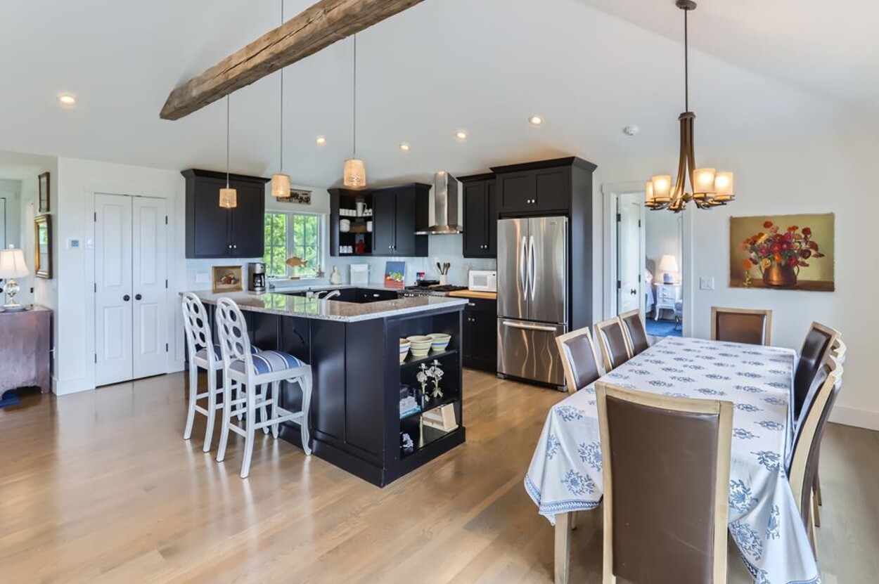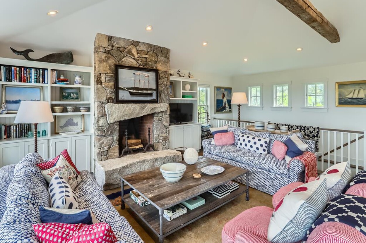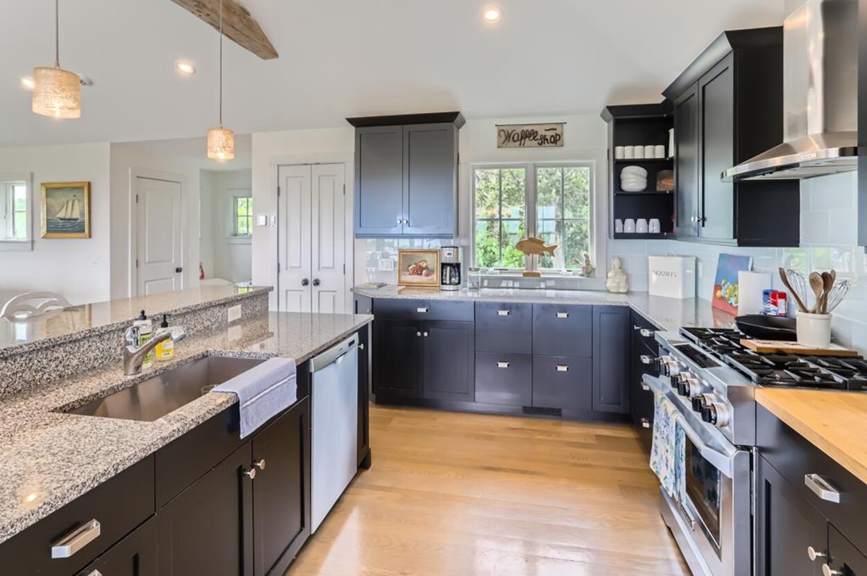 Set atop a hill this beautifully designed modern home has amazing views over the Elizabeth Islands and Sound. Comfortable and bright open concept main level consists of a fully equipped kitchen, stylish living room, dining room and powder room. The en suite primary bedroom completes the main level. Downstairs there is a second entertainment room, a bedroom with an en suite bath and two more bedrooms share a full bath. Walk out the doors to enjoy views from the Adirondack chairs on the patio. Spectacular views and sunsets from almost every room in this thoughtfully updated home. Bike to town beaches. No pets please.