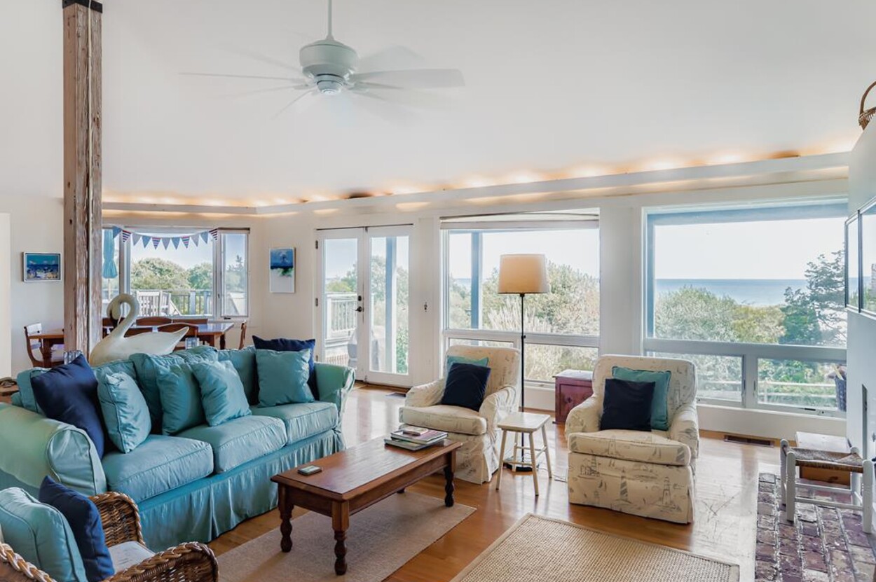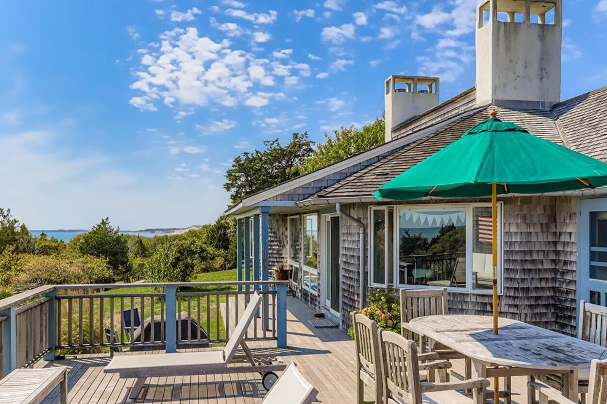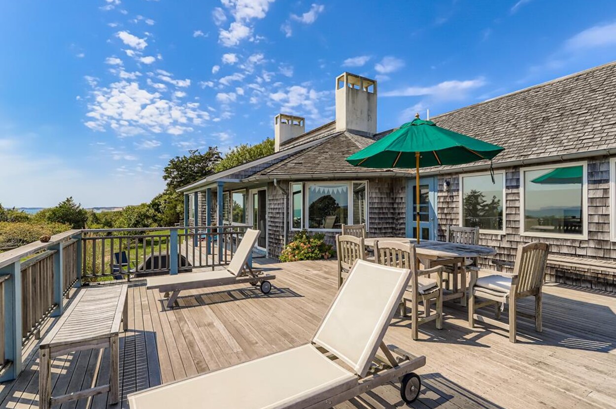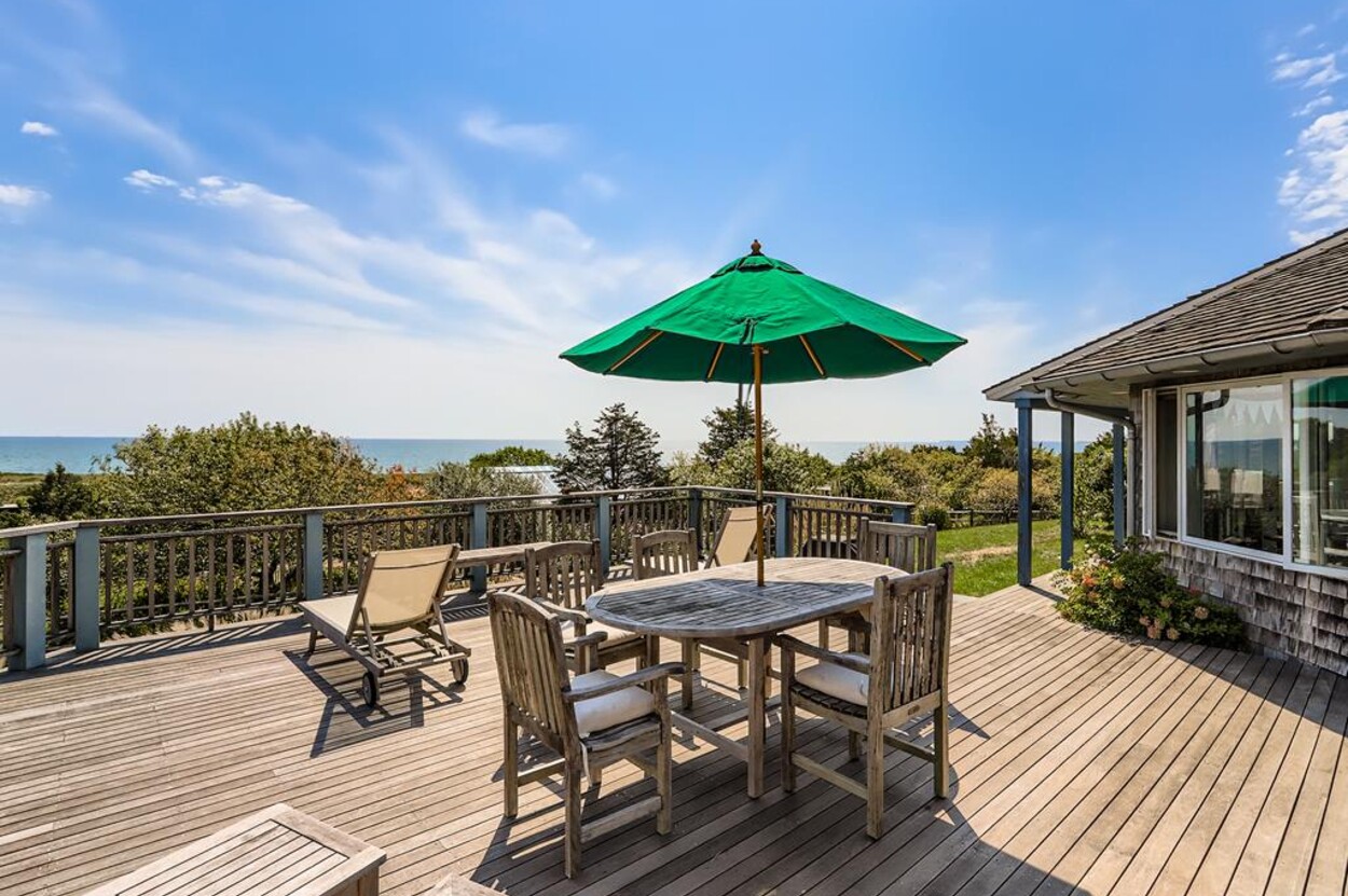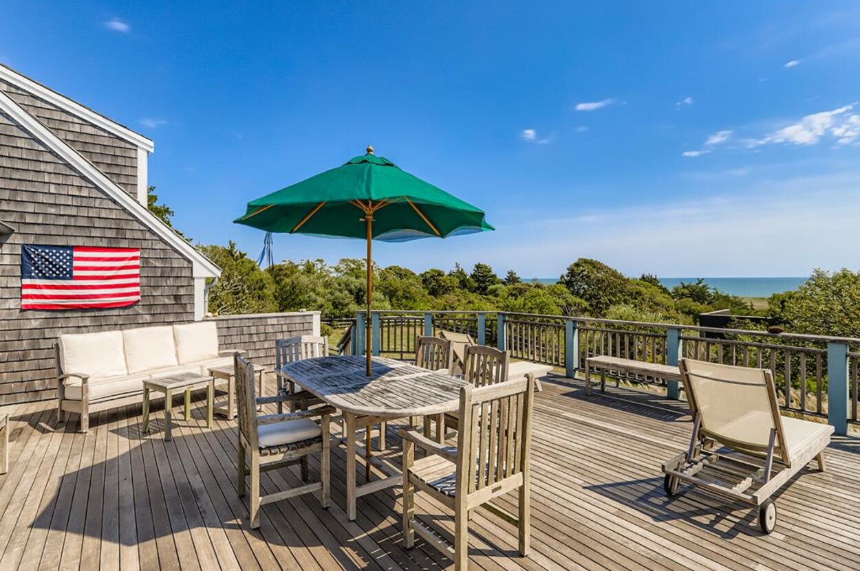 This beautiful, private and spacious home is set on a hill just over the dunes on the South Shore. With terrific views of the Atlantic Ocean from almost every room, and just a short walk to a private beach, this 6 bedroom and 6 bathroom house, with a wonderful living room, and AC is ideal for a family. Including the two separate kitchens and a well laid out floor plan, there is plenty of room and privacy for guests. The decks, extending the entire front of the house, landscaped backyard, and expansive views of the Ocean provide a lovely setting for this special home. Beach access is a delightful walk down to the beach wading thru Doctors Creek. Ask about wifi.
