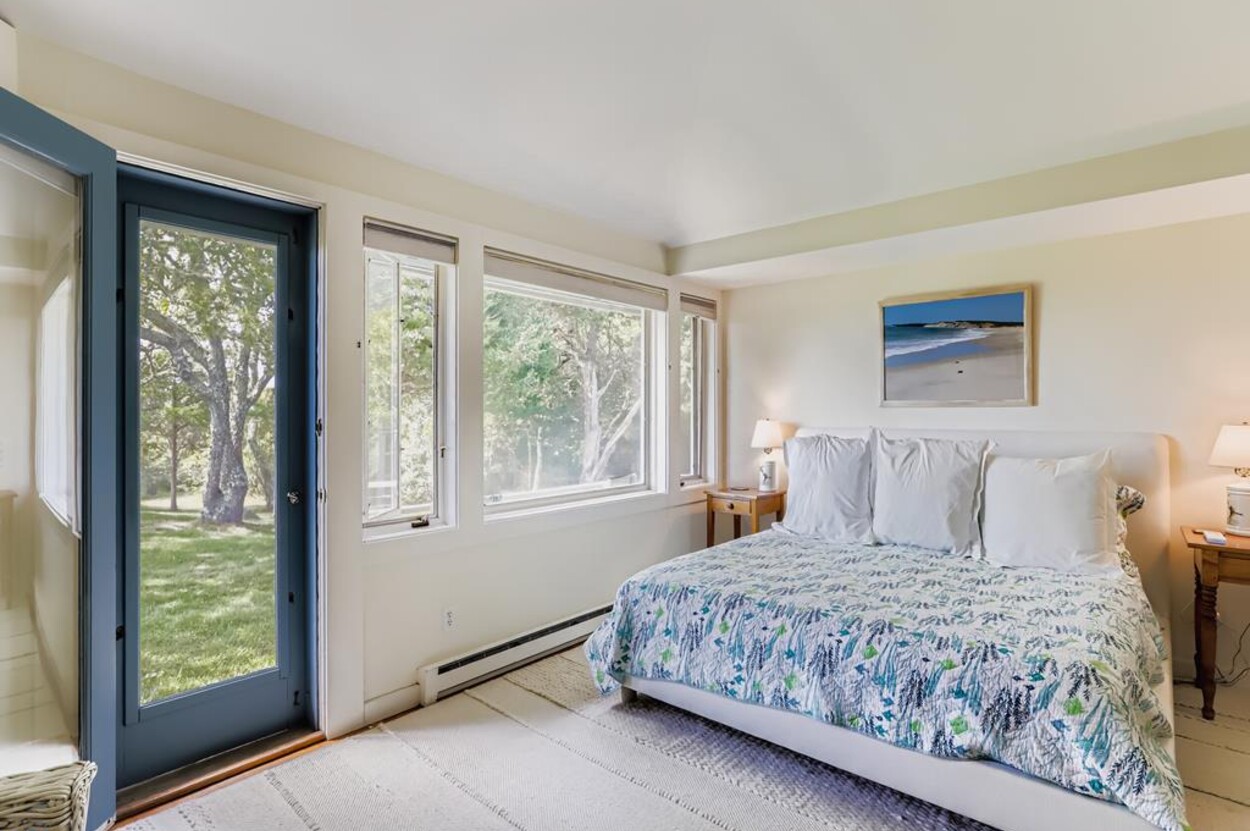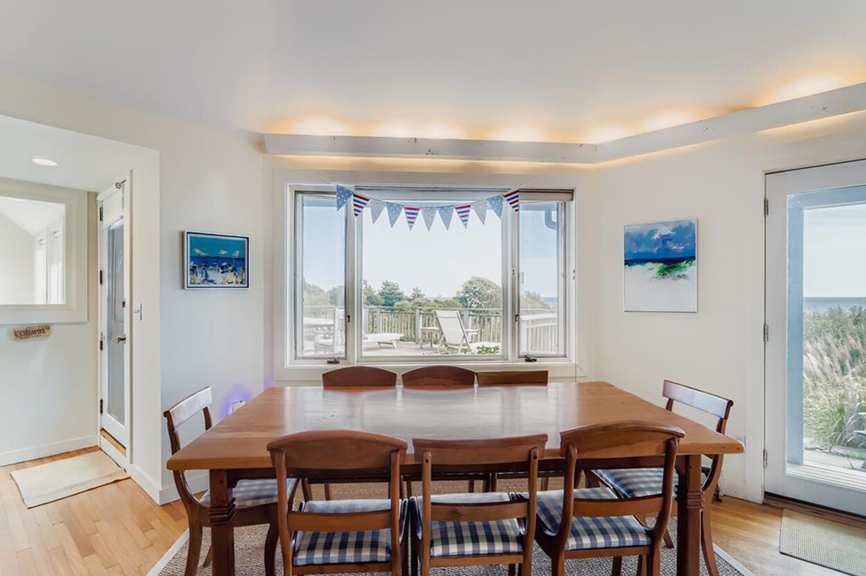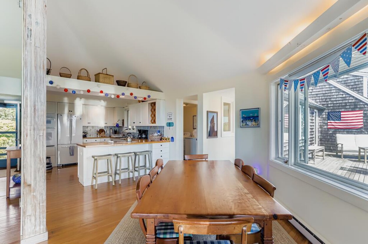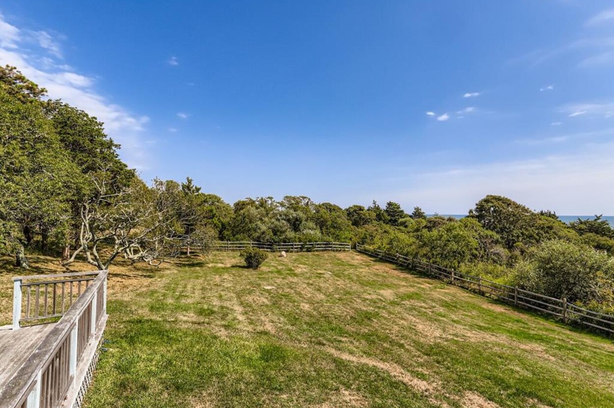 This beautiful, private and spacious home is set on a hill just over the dunes on the South Shore. With terrific views of the Atlantic Ocean from almost every room, and just a short walk to a private beach, this 6 bedroom and 6 bathroom house, with a wonderful living room, and AC is ideal for a family. Including the two separate kitchens and a well laid out floor plan, there is plenty of room and privacy for guests. The decks, extending the entire front of the house, landscaped backyard, and expansive views of the Ocean provide a lovely setting for this special home. Beach access is a delightful walk down to the beach wading thru Doctors Creek. Ask about wifi.