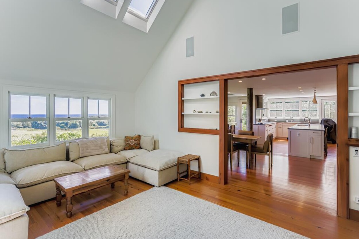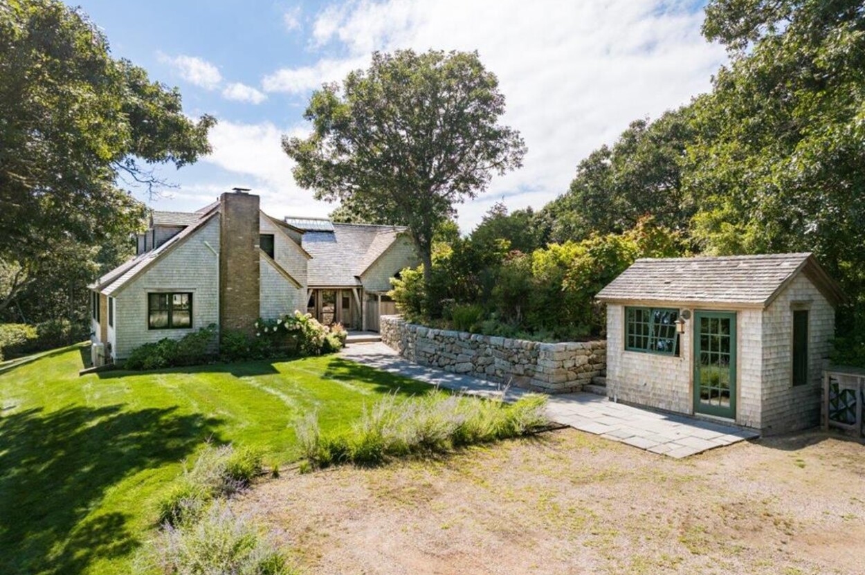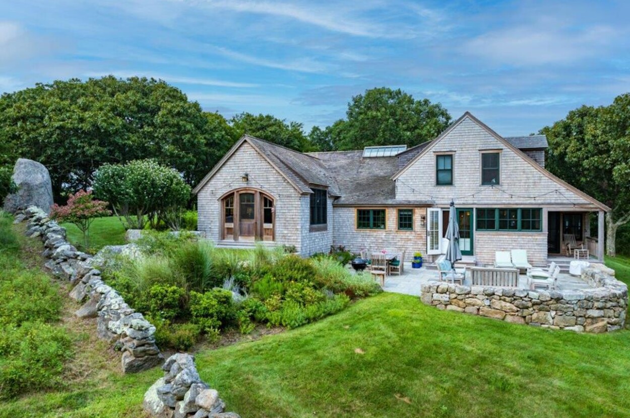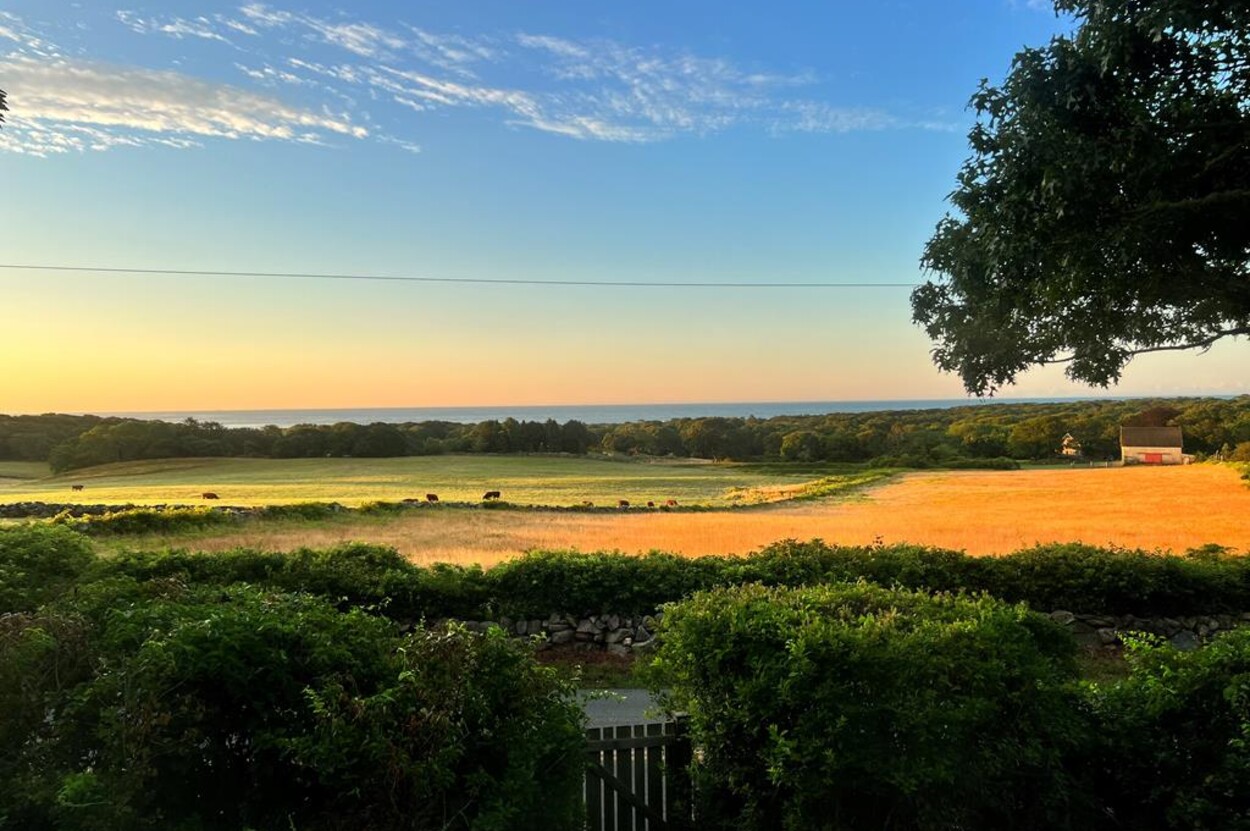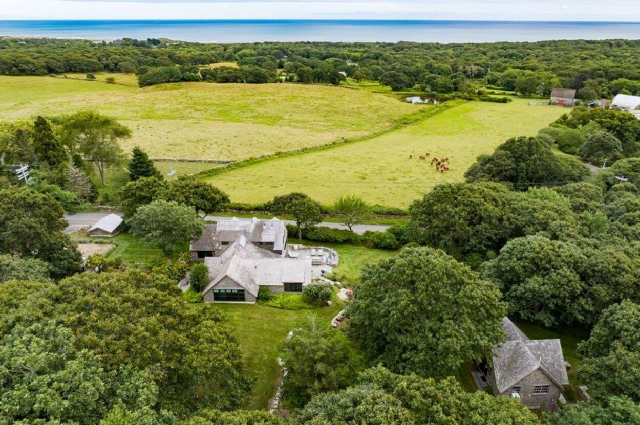 Overlooking iconic Chilmark farmland and ocean beyond, this exceptional property offers a 4 bedroom main house and 2 bedroom guest house. The main house has an open floor plan which feels fresh and contemporary with chef's kitchen, dining room with sitting area and living room with vaulted ceilings. There is direct access to the outdoor patio from the kitchen for outdoor dining and lounging. There is a first-floor primary bedroom suite with ocean and farm views. The second floor has a second primary suite with views and two additional bedrooms that share a full bath. Stone patios are lined with vibrant perennial gardens and old stonewalls including glacial boulders that line the property boundaries. The privately-sited custom post and beam guest house has an open kitchen (no stove/oven) living space upstairs and two bedrooms with one full bath on the lower walk-out level. This guest cottage charms with oversized windows, high ceilings and expert craftmanship. Each house has an outdoor shower. This location lends itself to easy living in the heart of Chilmark. Walk to the Chilmark Community Center, the Chilmark Store, the Tavern, the library, and the fabulous Beetlebung Farm Store.