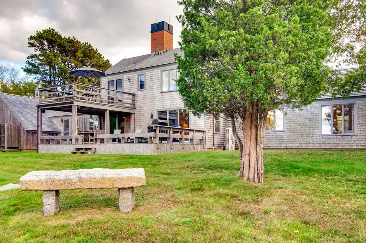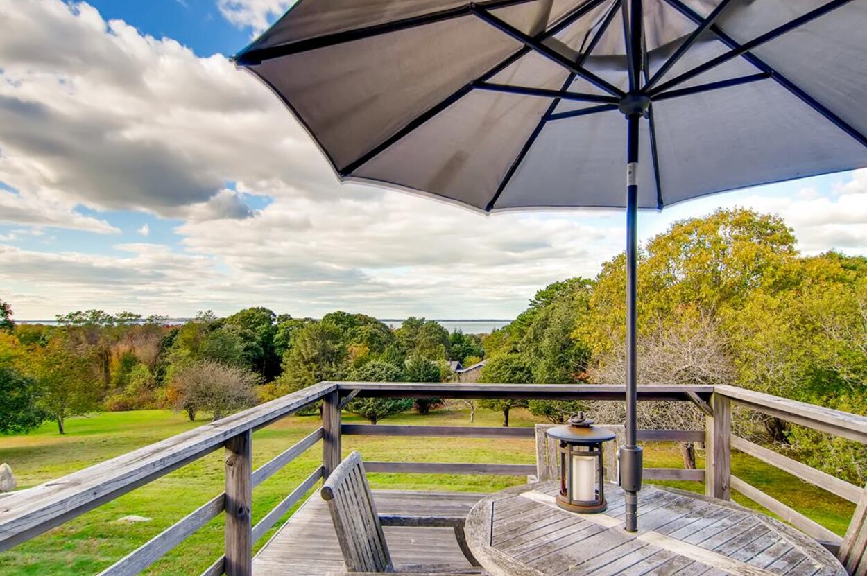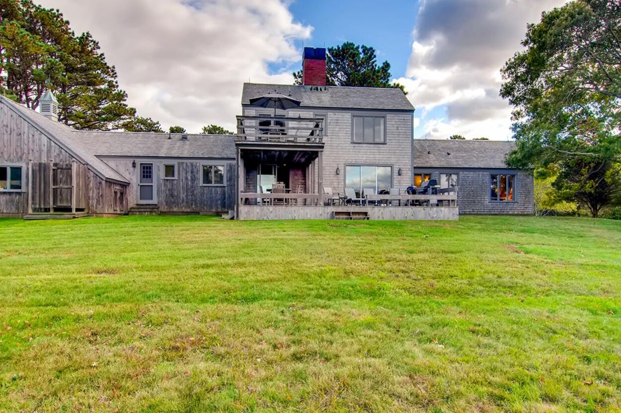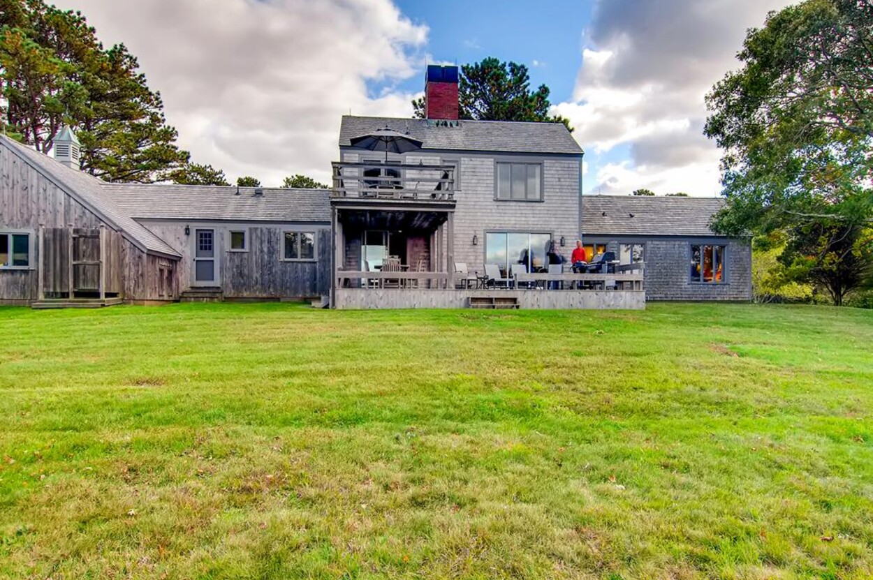Architect designed cape style year-round home on five private acres with water views of Vineyard Sound and the Elizabeth Islands. Three bedrooms with a bonus "loft", three & 1/2 baths, upper and lower outdoor decks furnished with teak furniture for outdoor dining and sun bathing. Private association Upper Makonikey beach within easy walking distance. Perfect for a family or group of friends who want a true Vineyard experience with comfort and charm. Flexible on turnover day.
