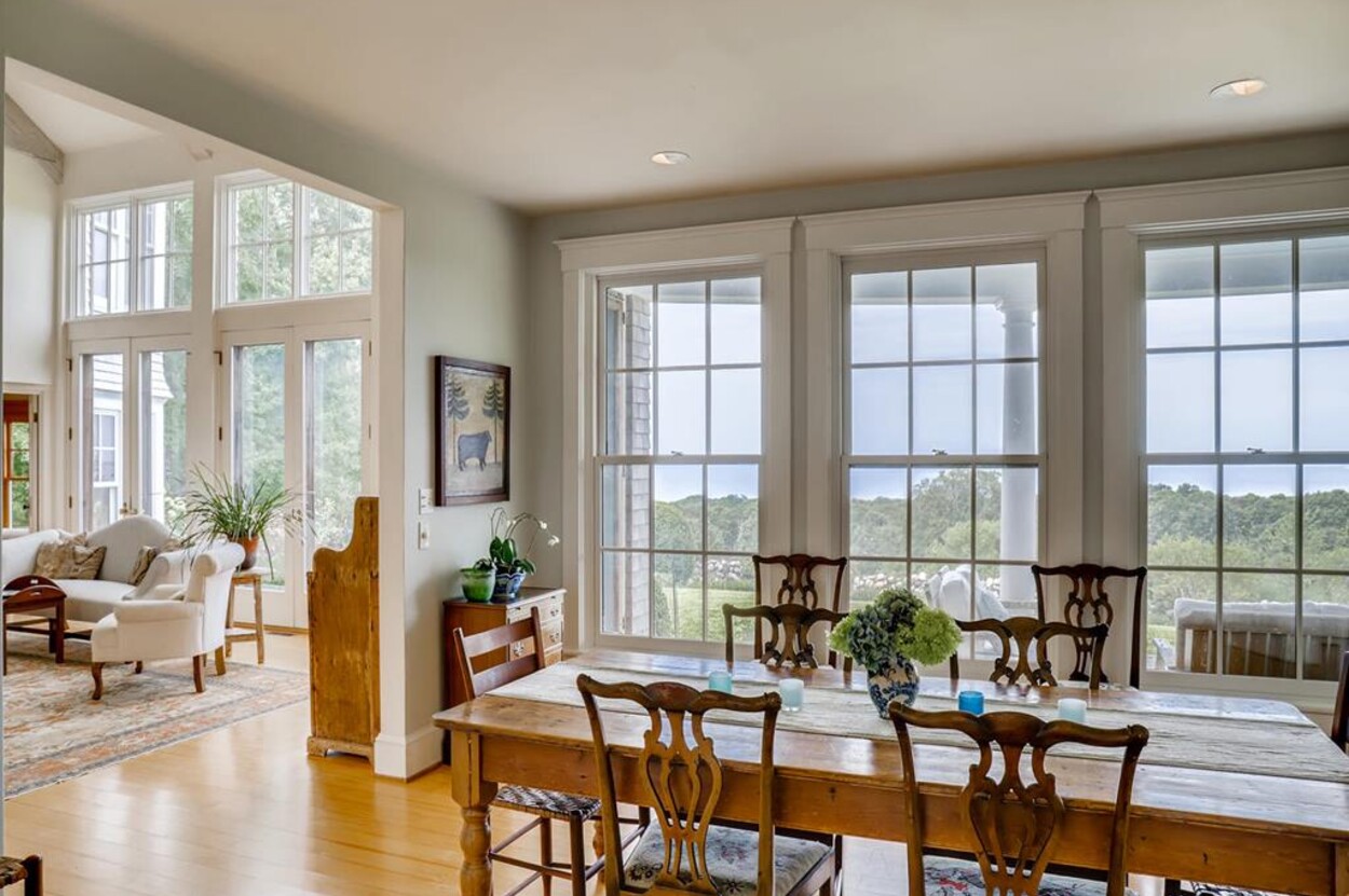 A large chefs kitchen with screened porch. connects through to the open dining room and living room with large french doors to the garden. Theres also a small tv office room off here.